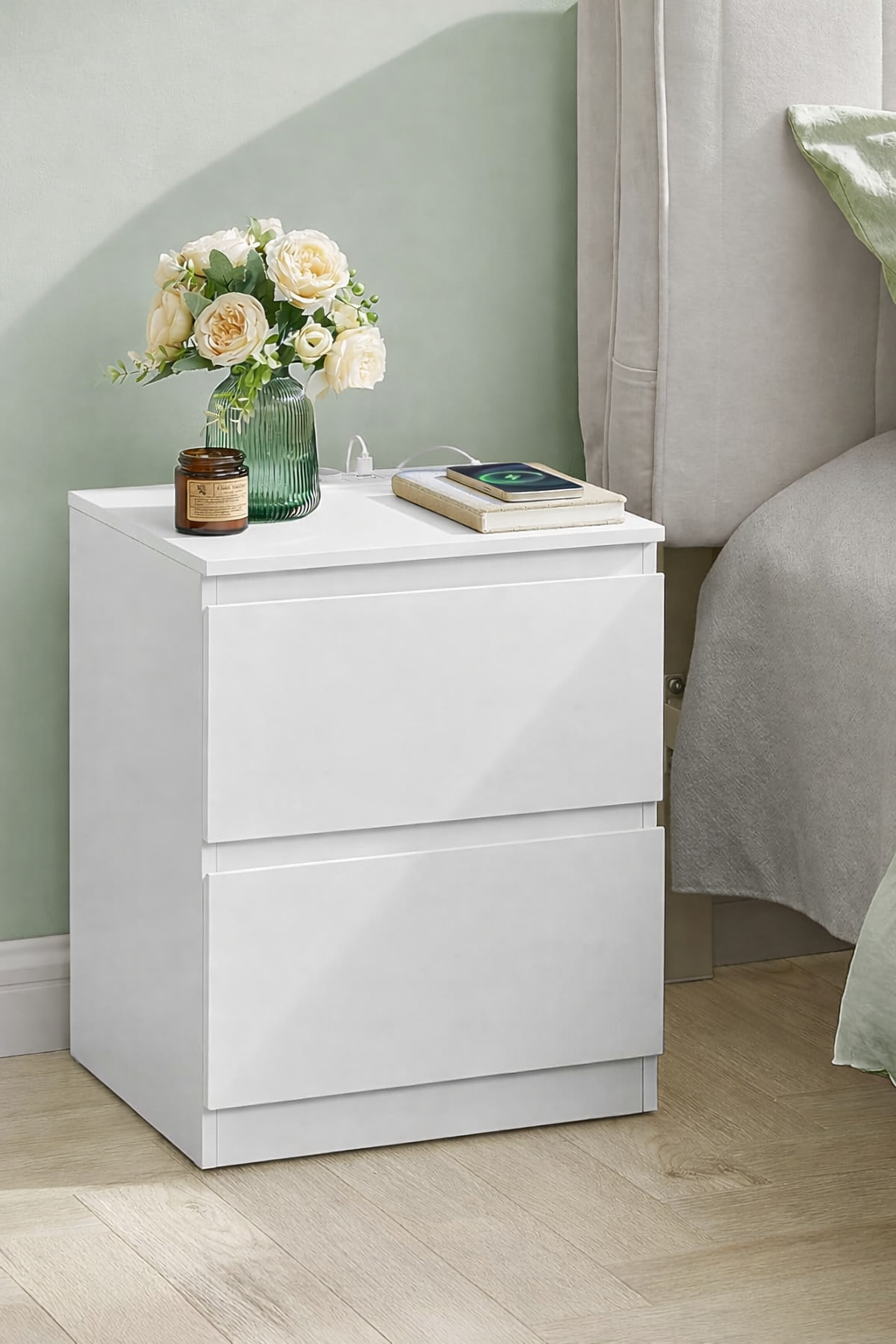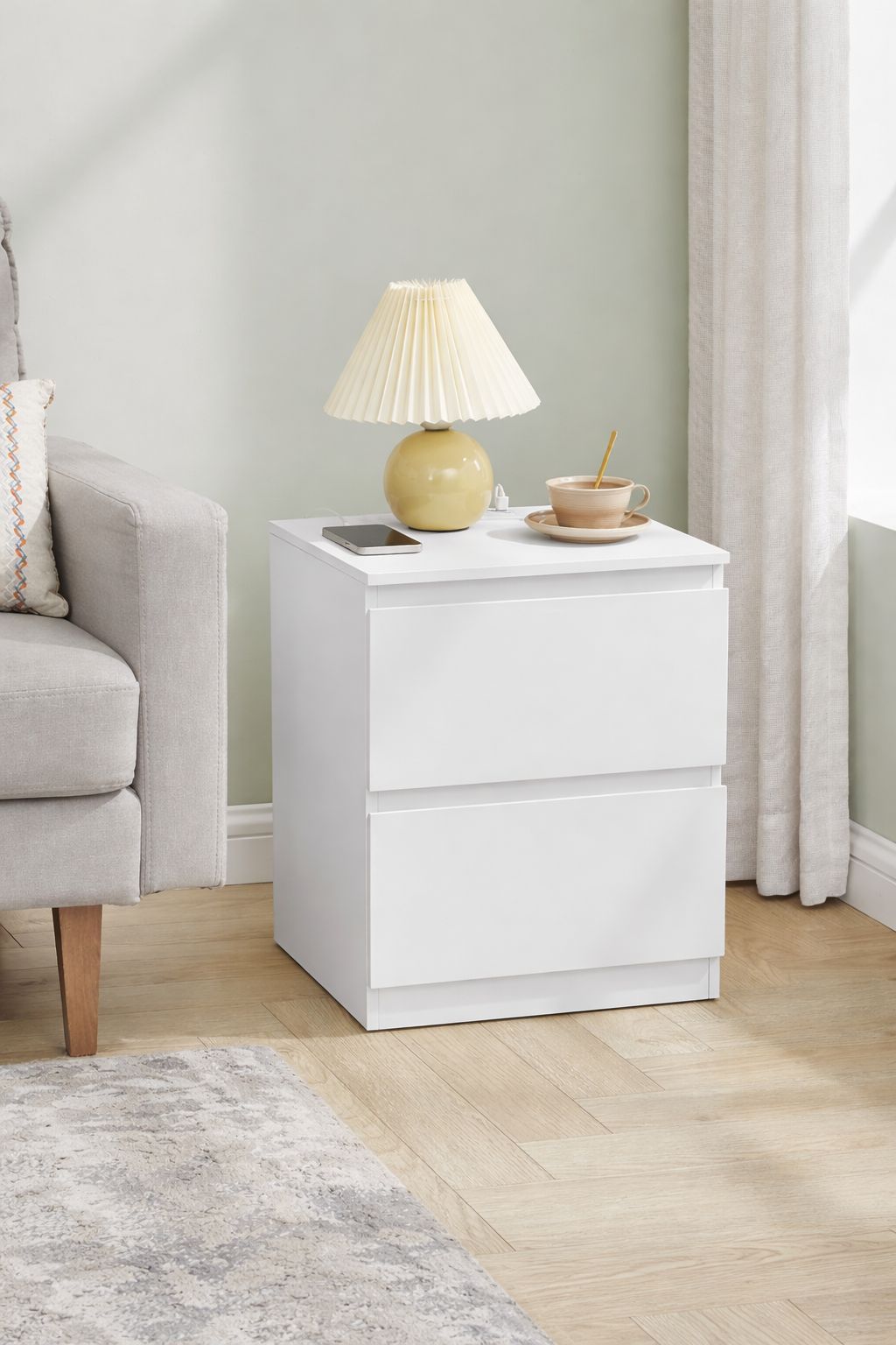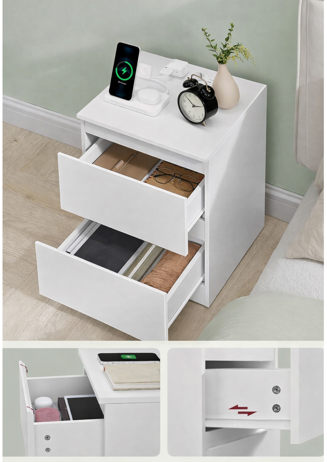 VASAGLE Kailyn este o noptiera moderna, cu design minimalist si sertare fara manere, ideala pentru dormitoare luminoase si ordonate. Priza integrata cu 2 porturi AC si 2 USB-A iti permite sa incarci telefonul, tableta sau veioza direct de langa pat. Cele doua sertare incapatoare ofera spatiu generos pentru obiectele personale, mentinand un aspect curat si organizat.