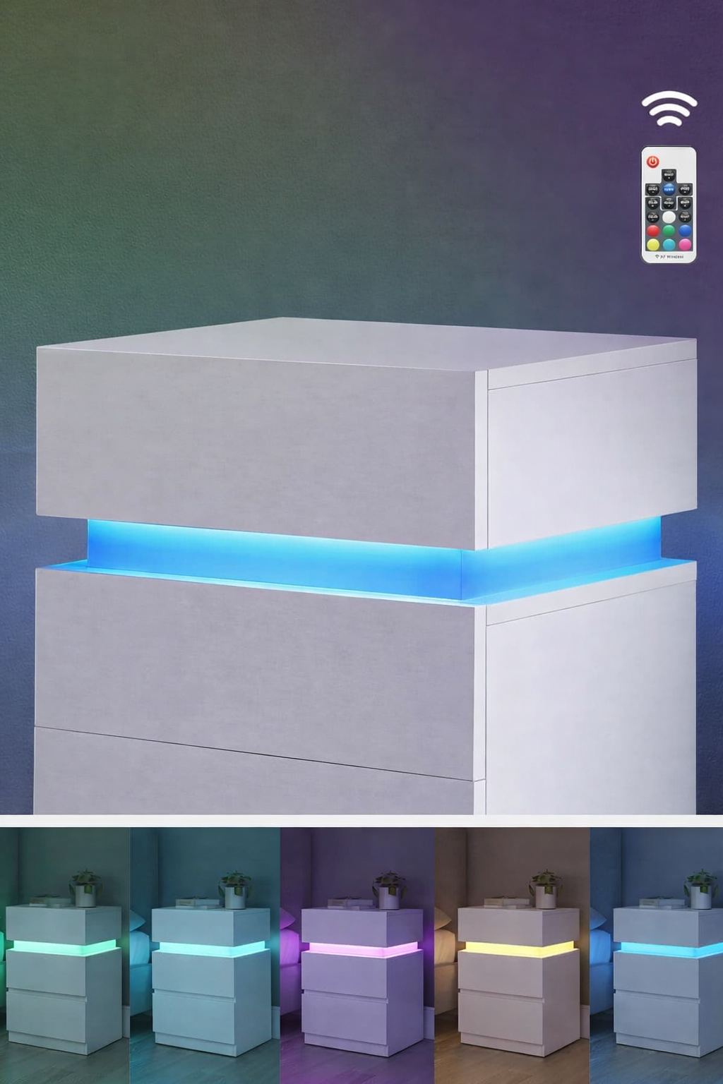 Set de 2 noptiere moderne din colectia KAILYN, cu design minimalist in alb si iluminare LED integrata. Fiecare piesa dispune de 3 sertare spatioase si blat superior generos. Banda LED ofera 25 culori, niveluri diferite de luminozitate si moduri de iluminare, ideale pentru crearea unei atmosfere personalizate in dormitor.
