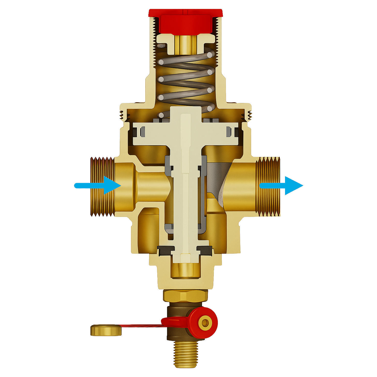 Corpul reductorului este fabricat din alama nichelata, cu piston din tehnopolimer ranforsat cu fibra de sticla si garnituri din EPDM. Suprafata de etansare din otel inoxidabil AISI 303 asigura durabilitate si performanta constanta in timp.