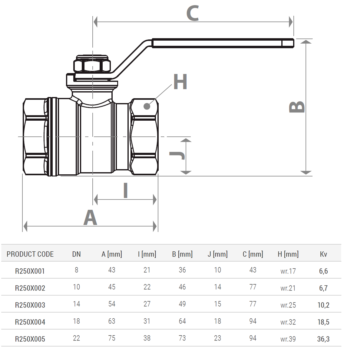 Robinet cu bila cu trecere standard, realizat din alama CW617N nichelata, prevazut cu filet interior 1” pe ambele parti. Este utilizat in instalatii de incalzire si racire, in circuite de apa sau in retele cu gaze si hidrocarburi lichide nepericuloase. Modelul R250X005 este prevazut cu maner metalic tip parghie, tratat anticoroziv si acoperit cu PVC rosu pentru o manevrare usoara si sigura.