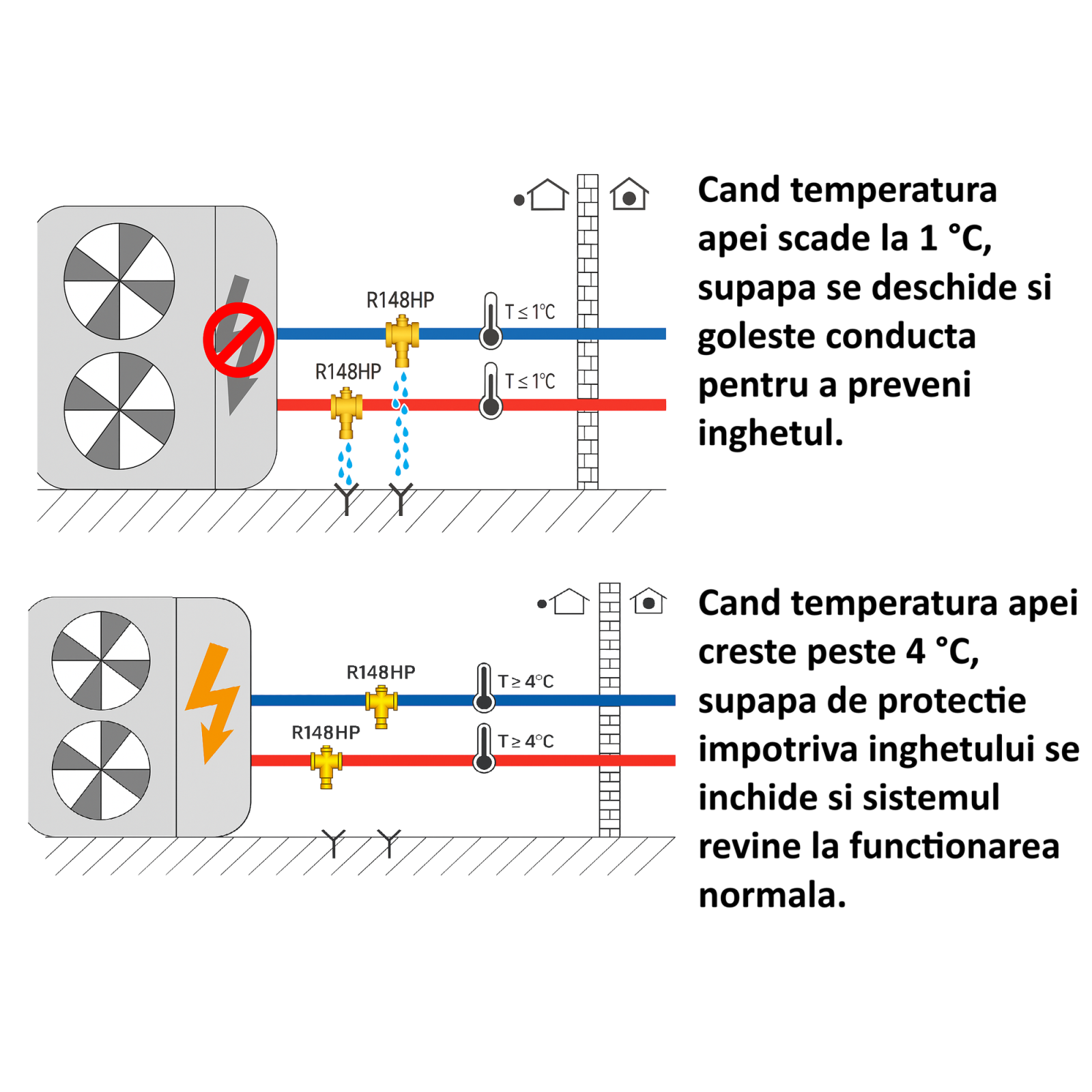 Valva este echipata cu senzor termostatic care declanseaza drenajul doar cand este nevoie. Este o solutie de siguranta pasiva, fara alimentare electrica, usor de montat si intretinut.