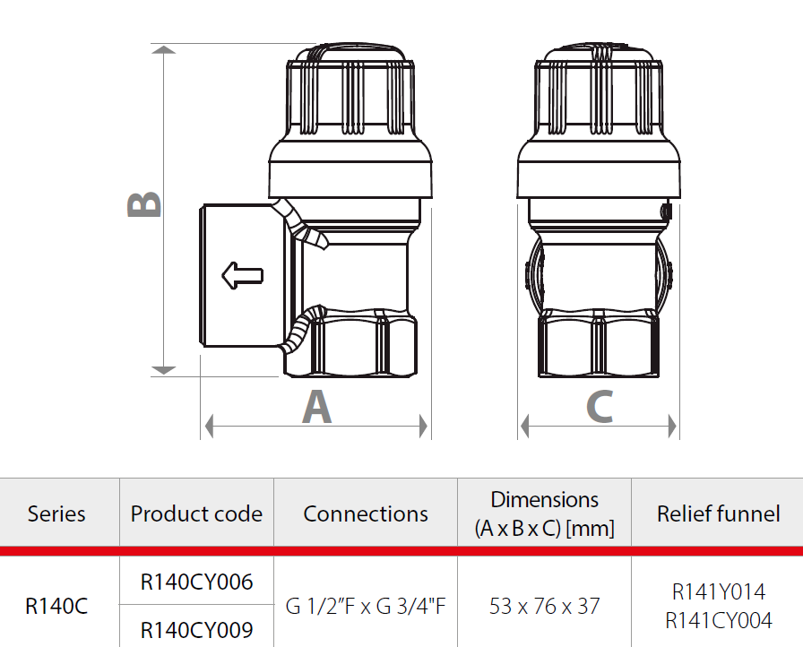Seria de supape de siguranta R140C trebuie montata in pozitie verticala, pentru a evita depunerea impuritatilor din sistem, si in sensul de curgere indicat de sageata de pe corpul supapei.