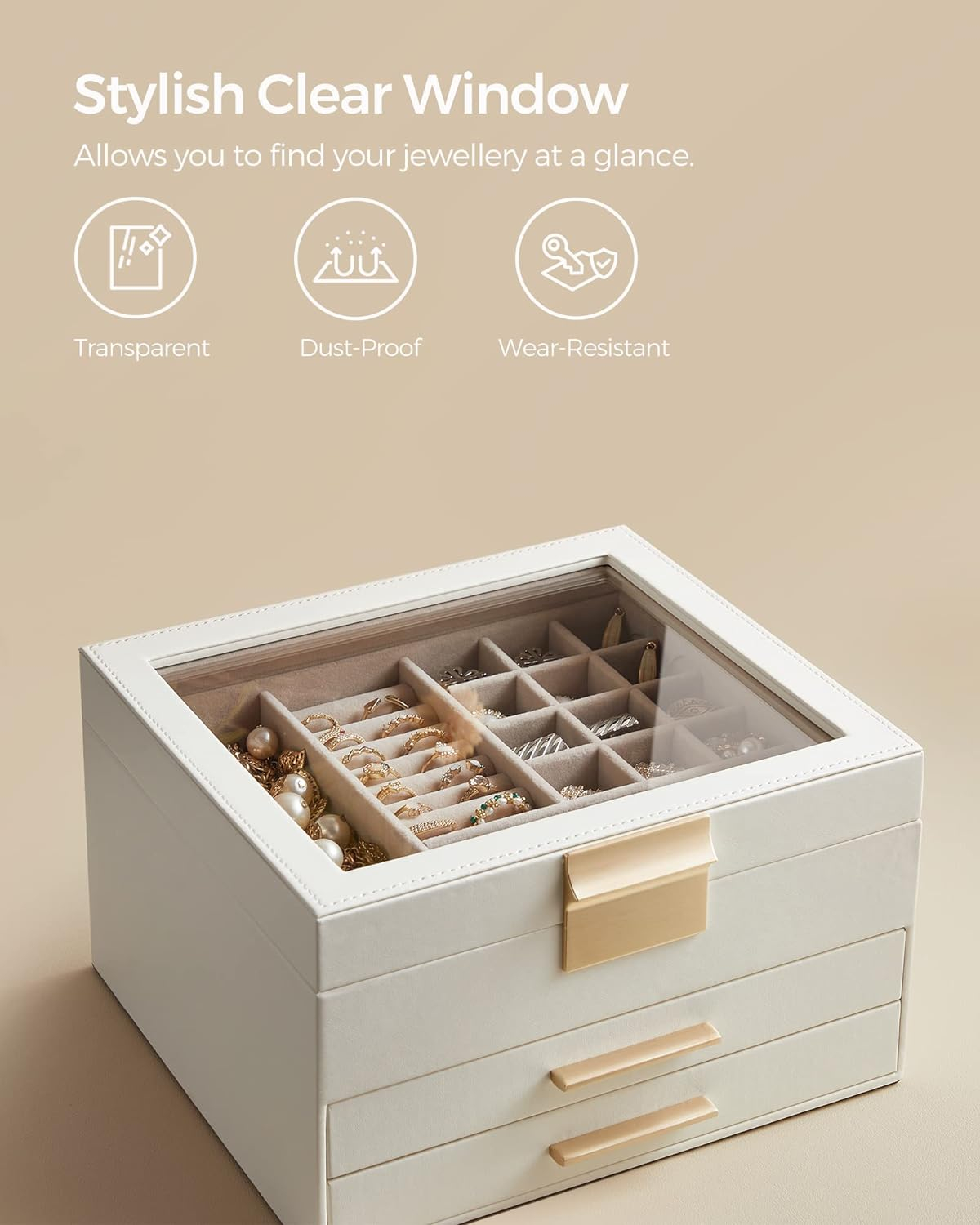 SONGMICS Cutie de bijuterii cu 3 nivele, 2 sertare, capac din sticla, 20x23x14cm, alb si auriu