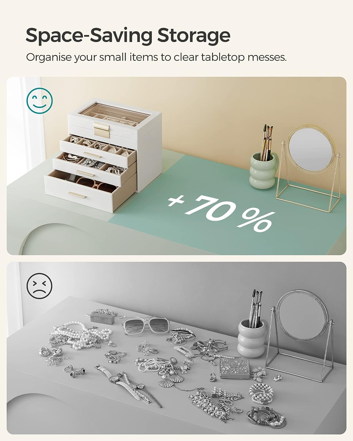 Specificatii:   	 Culoare: Alb noros, auriu  	 Material: MDF (panou de fibre de densitate medie), PU (poliuretan), catifea, sticla  	 Dimensiunea produsului: 15,3 x 25,1 x 21,5 cm (D x L x H)  	 Greutatea produsului: 1,7 kg    Despre acest articol Cele 3 niveluri superioare ale acestei cutii de bijuterii sunt prevazute cu compartimente de mai multe dimensiuni, astfel incat sa va puteti sorta bijuteriile mici in spatii separate. Ochelari de soare si ceasuri mari? Sunt bineveniti in sertarul mare de jos!Capacul din sticla transparenta va protejeaza bijuteriile dragi de praf si le pune si in evidenta. Deoarece este transparent, inseamna, de asemenea, ca puteti gasi piesele potrivite dintr-o privire.Culori elegante alb si auriu, manere metalice stralucitoare, captuseala moale de catifea, cusaturi ingrijite, PU de calitate si MDF solid - toate aceste elemente combinate fac ca acest organizator de bijuterii sa fie suficient de elegant si durabil pentru colectia dvs. de bijuterii in continua crestere.Idee perfecta de cadou: Oferiti aceasta trusa de bijuterii cu design original celor dragi de ziua lor de nastere sau de aniversare pentru a-i surprinde! Sau, rasfatati-va cu aceasta cutie de bijuterii de lux - o meritati!
