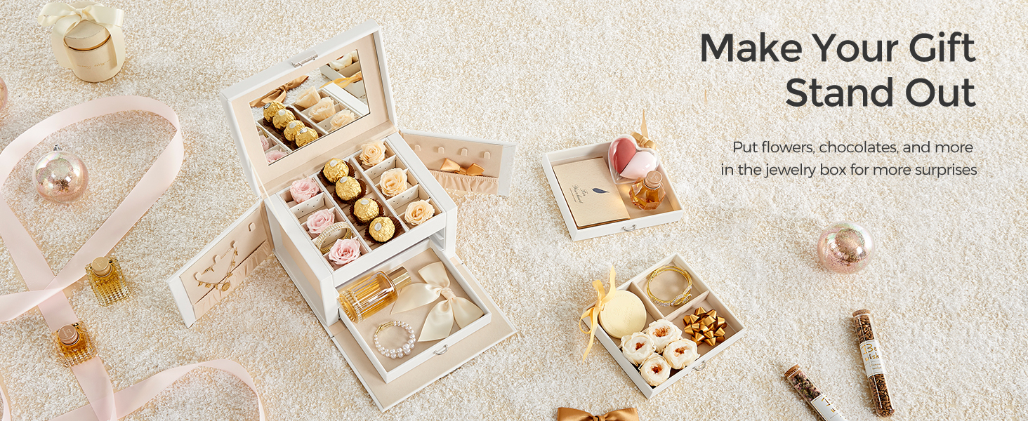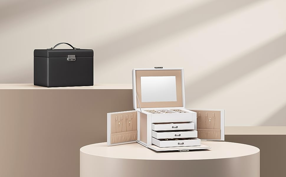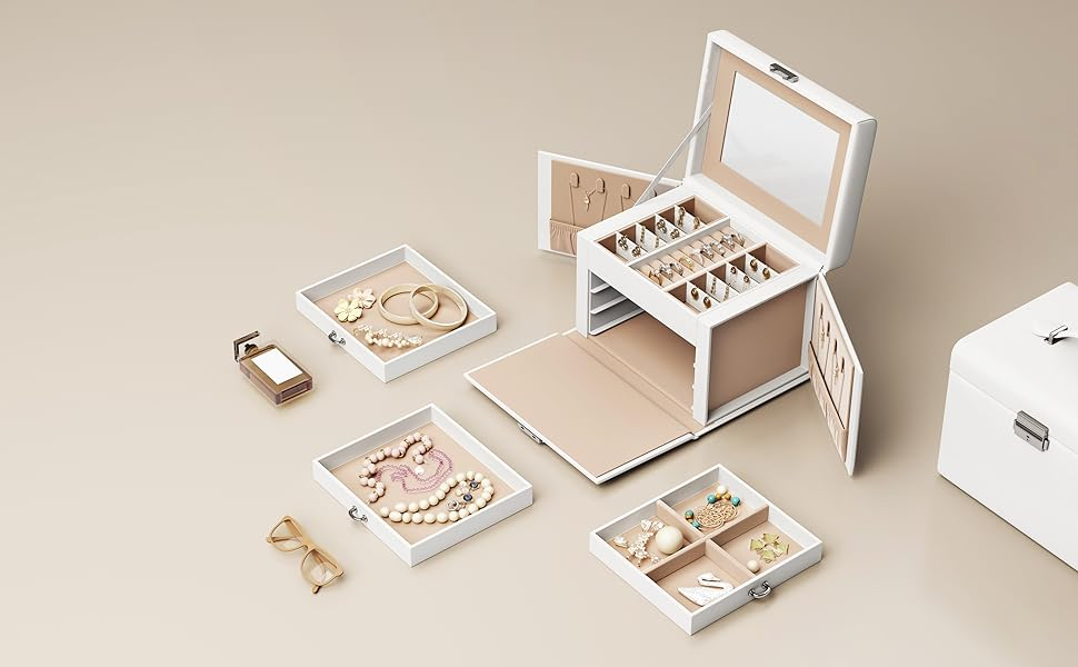 Specificatii: Culoare: alb Material: MDF (placi din fibre de densitate medie), exterior PU (poliuretan), captuseala din catifea Dimensiune produs: 17,5 x 22,5 x 16,5 cm (L x l x H) Greutate produs: 1,6 kg Continutul pachetului: 1 x Cutie de bijuterii 2 x cheie Pastrati-va diversele bijuterii organizate cu aceasta cutie spatioasa de bijuterii. Are mai multe carlige pentru colier pe ambele parti si 4 niveluri de depozitare cu o multime de compartimente diferite. Incuiat si portabil: Organizatorul de bijuterii se incuie cu 2 chei pentru a va pastra piesele pretuite departe de copiii obraznici; Datorita manerului din partea superioara, husa de bijuterii mica este portabila pentru utilizare in calatorii Cu oglinda interioara: Aceasta cutie de bijuterii are o oglinda transparenta pe capac pentru a va face mai convenabil sa va machiati, sa va puneti sau sa scoateti bijuterii si sa va verificati aspectul inainte de a iesi. Solid si durabil: Suprafata din piele sintetica de calitate, un corp robust din MDF si cusaturile ingrijite fac o cutie de bijuterii de calatorie robusta si durabila, care va va tine companie multi ani de acum inainte.