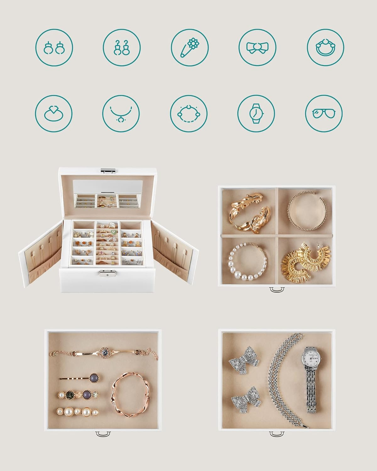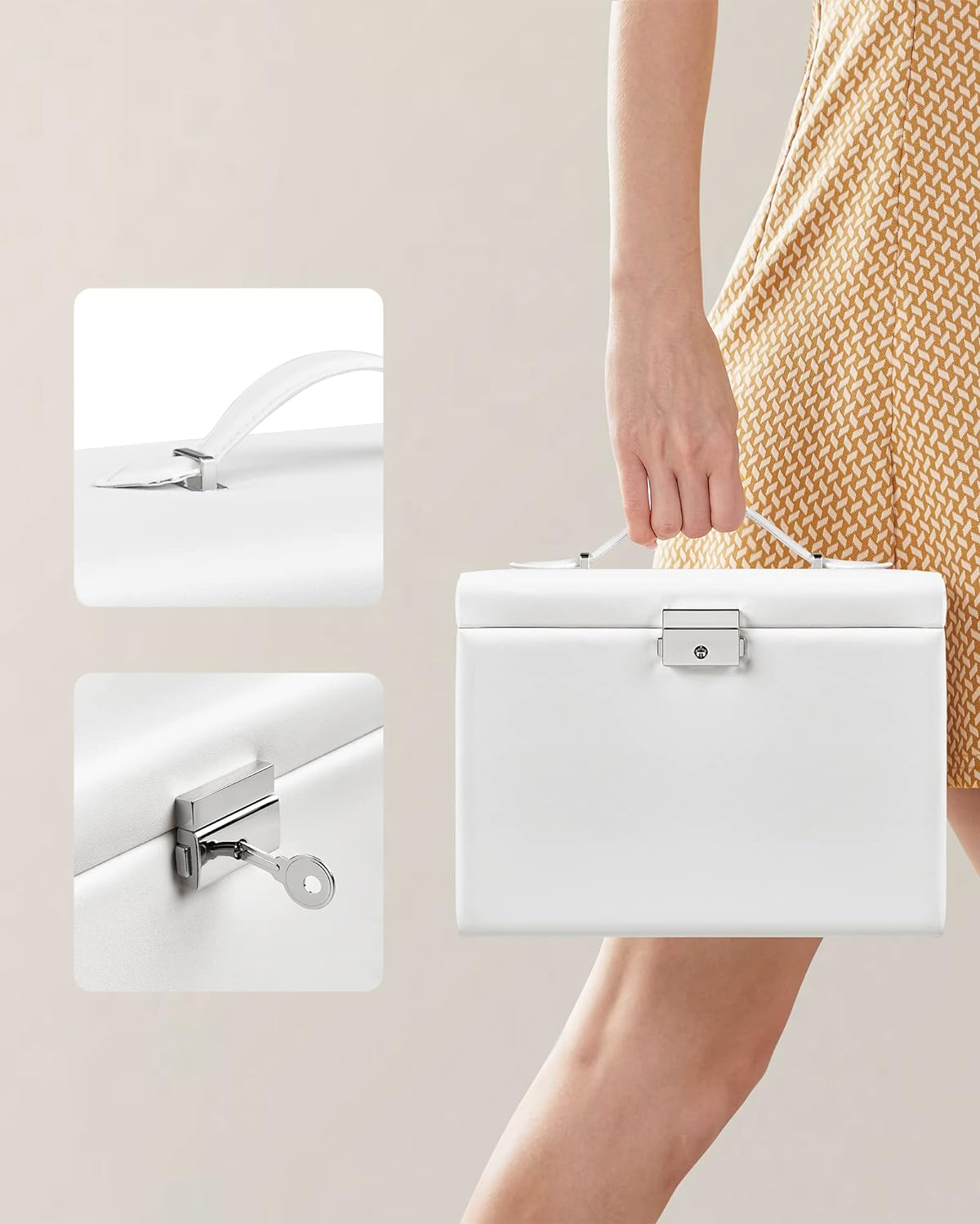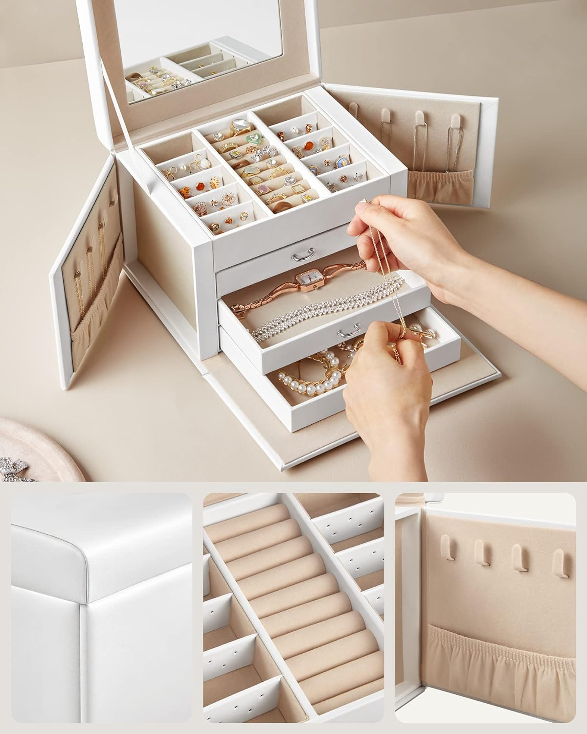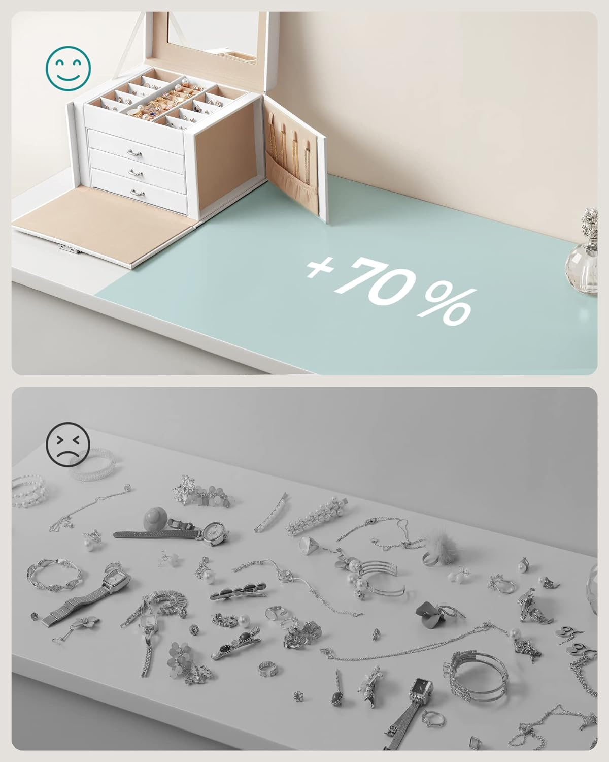 SONGMICS Cutie de bijuterii cu 4 nivele, 3 sertare, oglinda si incuietoare, 18x23x17cm, alb