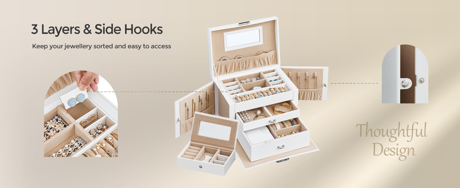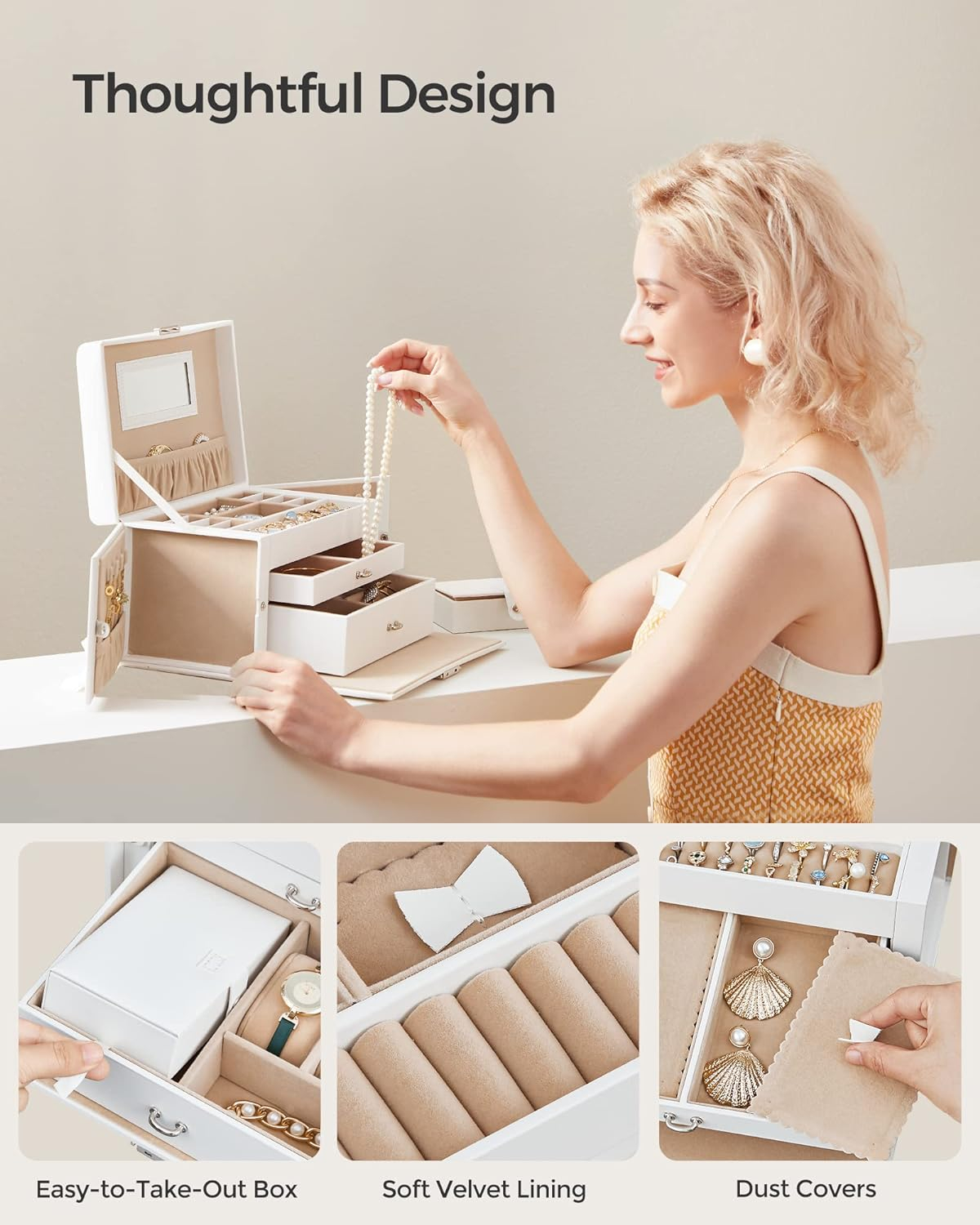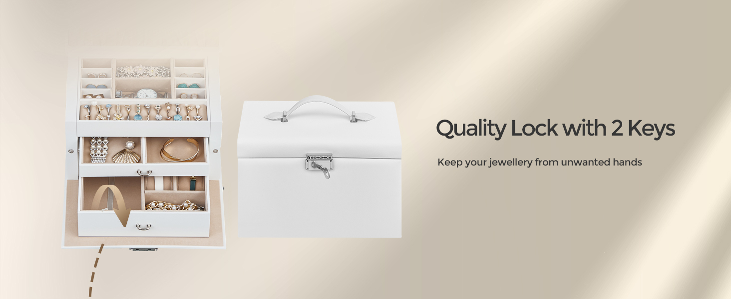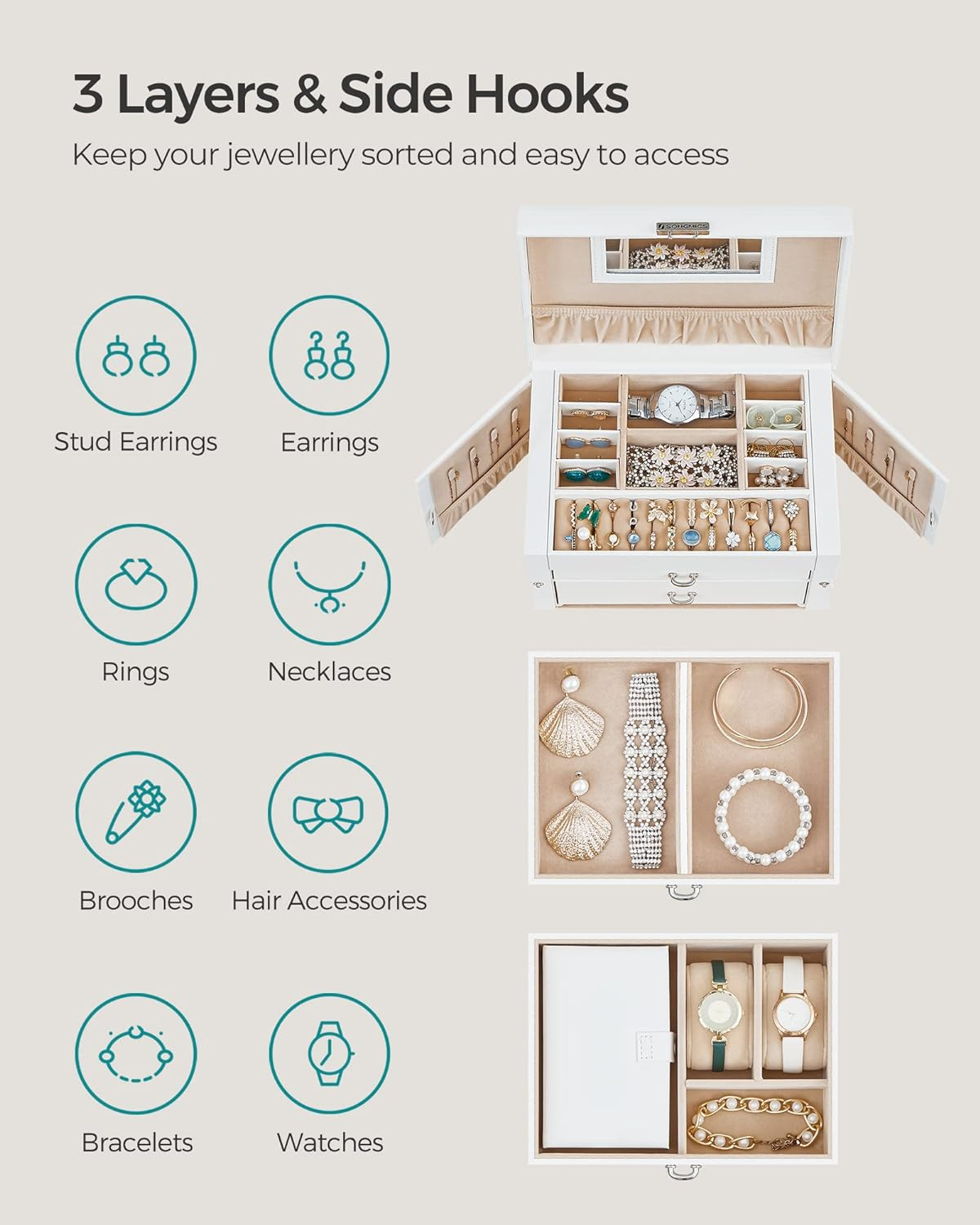 Culoare: Alb  	 Marca: Songmics  	 Material: piele din piele + cadru din fibra de densitate medie + catifea  	 Stil: Modern  	 Caracteristica speciala: oglinda, lacat, portabil  	 Dimensiunile produsului: 18D x 26W x 17H centimetri  	 Forma: Dreptunghiular    Despre acest articol Compartimente separate, buzunare de catifea, deschideri pentru cercei cu stifturi, fante pentru inele, perne pentru ceasuri, carlige laterale pentru agatarea colierelor fara incurcaturi — aceasta cutie de bijuterii cu 3 niveluri ofera spatiu de depozitare pentru diversele tale bijuterii. Mini husa de calatorie separata:  Acest organizator de bijuterii vine cu o mini cutie de bijuterii de calatorie, care este perfecta pentru a aduce cateva piese in calatorie. Carcasa mini are si o oglinda. Lacat si maner practice:  Aceasta cutie de bijuterii se incuie cu 2 chei pentru a va pastra obiectele de valoare in siguranta si la indemana; manerul de pe capac va permite sa transportati cu usurinta cutia de bijuterii oriunde doriti. Calitate:  Suprafete netede din PU, corp solid din MDF, captuseala moale din catifea, cusaturi ingrijite - aceasta cutie de bijuterii care se poate incuia este solida si durabila pentru a va insoti pentru anii urmatori. Idee de cadou de lux:  Daruiti acest organizator de bijuterii elegant si bine realizat celor dragi de ziua lor de nastere sau aniversare pentru a le surprinde! Sau, rasfatati-va cu aceasta fermecatoare cutie de bijuterii - o meriti!