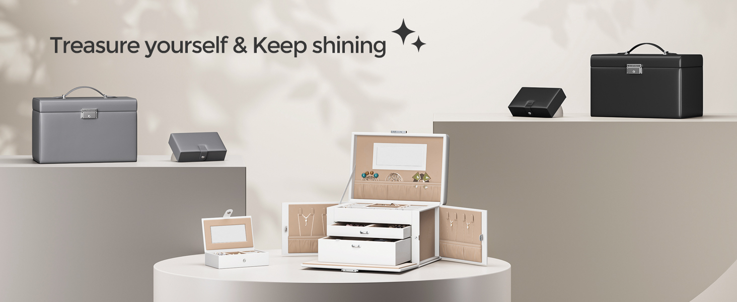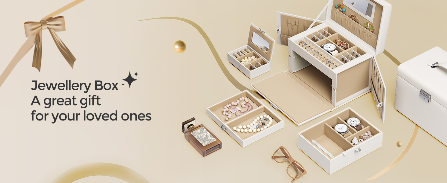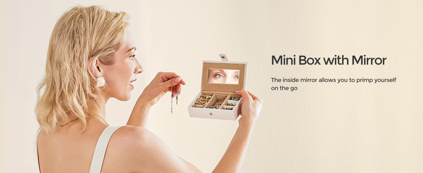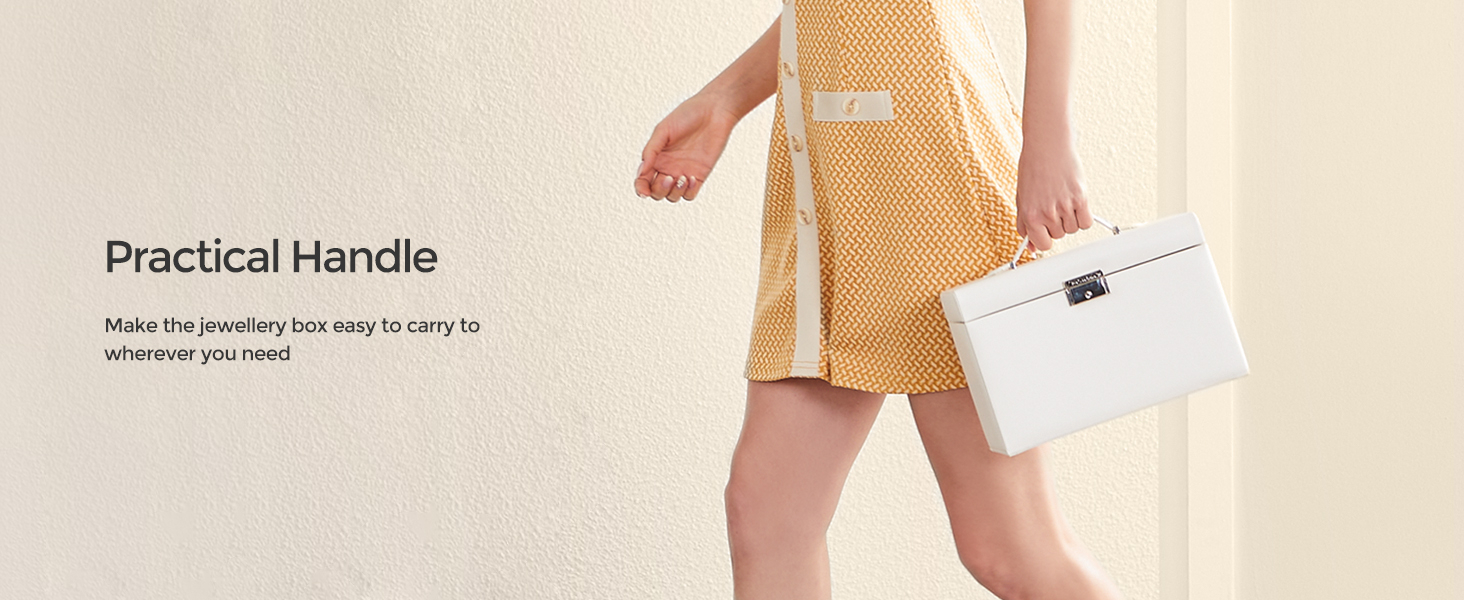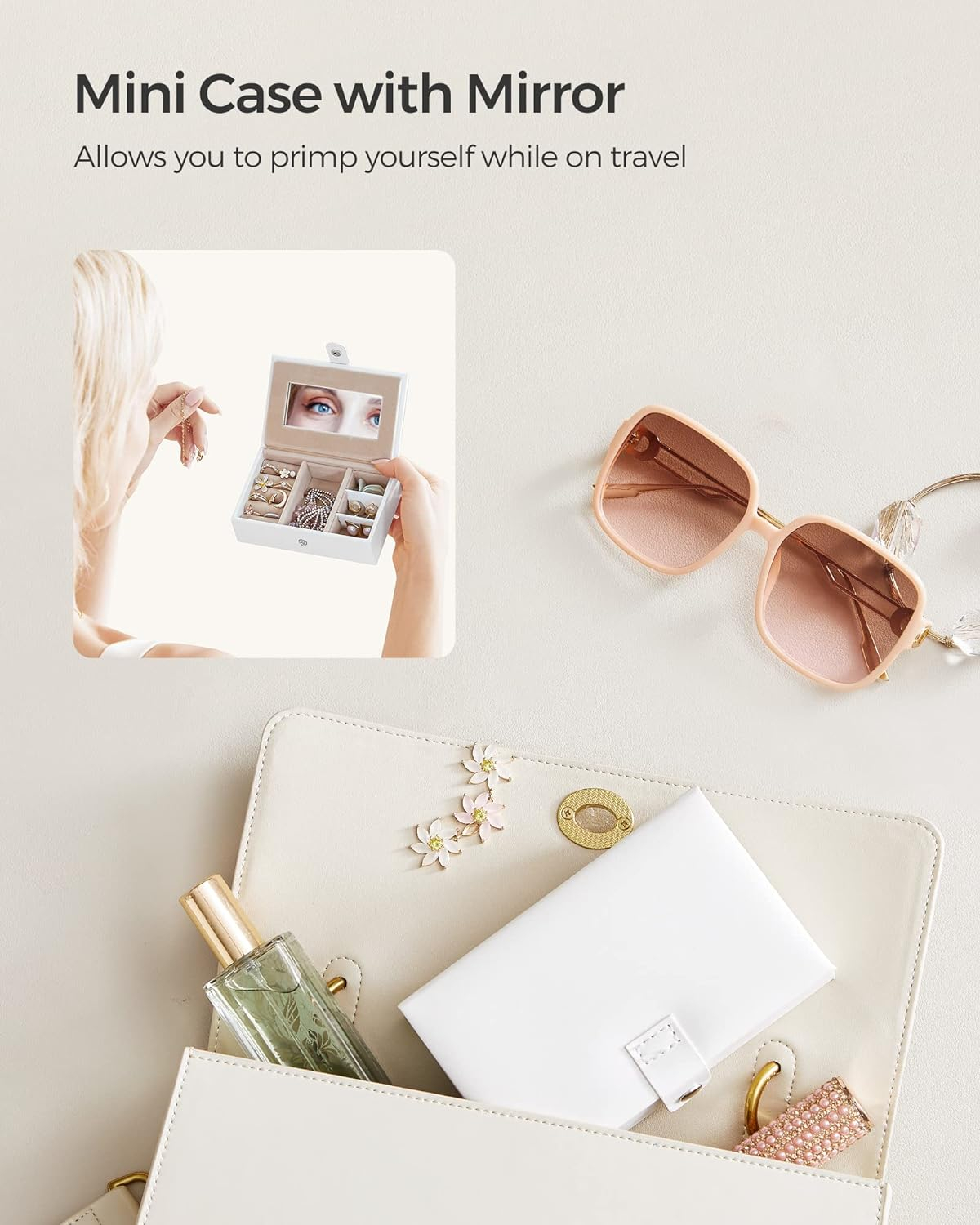 Culoare: Alb  	 Marca: Songmics  	 Material: piele din piele + cadru din fibra de densitate medie + catifea  	 Stil: Modern  	 Caracteristica speciala: oglinda, lacat, portabil  	 Dimensiunile produsului: 18D x 26W x 17H centimetri  	 Forma: Dreptunghiular    Despre acest articol Compartimente separate, buzunare de catifea, deschideri pentru cercei cu stifturi, fante pentru inele, perne pentru ceasuri, carlige laterale pentru agatarea colierelor fara incurcaturi — aceasta cutie de bijuterii cu 3 niveluri ofera spatiu de depozitare pentru diversele tale bijuterii. Mini husa de calatorie separata:  Acest organizator de bijuterii vine cu o mini cutie de bijuterii de calatorie, care este perfecta pentru a aduce cateva piese in calatorie. Carcasa mini are si o oglinda. Lacat si maner practice:  Aceasta cutie de bijuterii se incuie cu 2 chei pentru a va pastra obiectele de valoare in siguranta si la indemana; manerul de pe capac va permite sa transportati cu usurinta cutia de bijuterii oriunde doriti. Calitate:  Suprafete netede din PU, corp solid din MDF, captuseala moale din catifea, cusaturi ingrijite - aceasta cutie de bijuterii care se poate incuia este solida si durabila pentru a va insoti pentru anii urmatori. Idee de cadou de lux:  Daruiti acest organizator de bijuterii elegant si bine realizat celor dragi de ziua lor de nastere sau aniversare pentru a le surprinde! Sau, rasfatati-va cu aceasta fermecatoare cutie de bijuterii - o meriti!