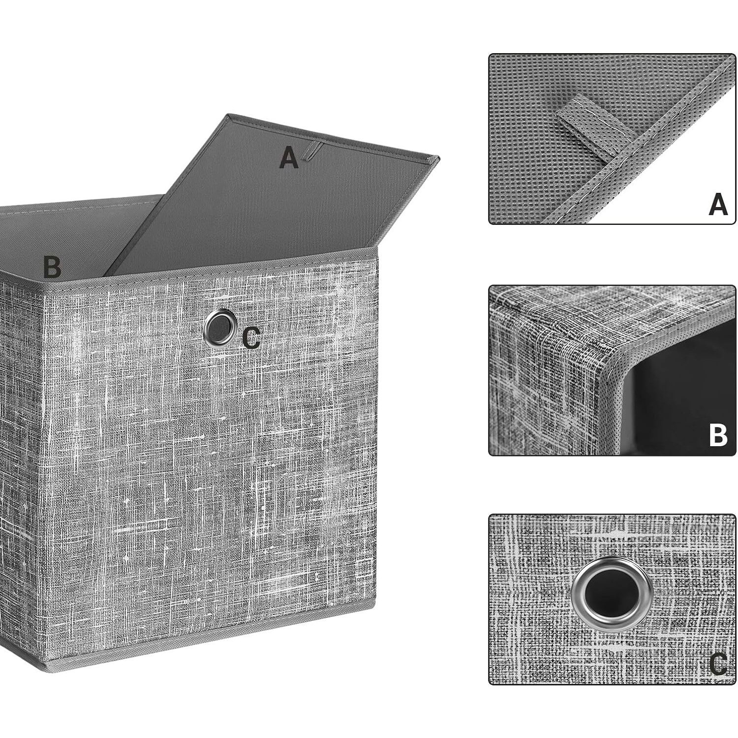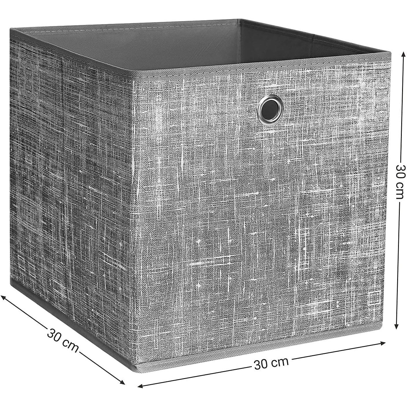 Pentru mintile inteligente: Aceste cutii de depozitare in forma de cub sunt suficient de flexibile pentru a se potrivi in orice spatiu: in dulap, pe rafturi, sub masuta de cafea, pe birou sau in camera copiilor. Au dimensiunea potrivita de 30 x 30 x 30 cm pentru a incapea in majoritatea unitatilor de depozitare cubice. Le puteti folosi impreuna sau le puteti separa in locuri diferite - depinde de dvs. Caracteristicile produsului:   	 Culoare: Gri deschis  	 Material: carton gros de 2 mm, 80 g/㎡ material textil netesut  	 Dimensiunea produsului: 30 x 30 x 30 cm (H x L x P)  	 Capacitate maxima de incarcare statica per cub: 5 kg  	 Setul include 6 bucati   Nota:   	 Stergeti petele cu o carpa umeda si uscati la aer pentru intretinere zilnica. NU spalati produsul.  	 Este posibil sa apara un miros de „nou” la prima deschidere a ambalajului. Aerisiti produsul intr-un loc bine ventilat pentru cateva ore.     Durabile si rezistente:  Organizati-va articolele cu acest set de 6 cuburi de depozitare durabile si rezistente. Fiecare cutie detine pana la 5 kg, cu o constructie rigida din tesatura netesuta de 80 g/m² si carton gros de 1,9 mm. Imprimare distinctiva a tesaturii:  Imprimarea exterioara a tesaturii are un aspect texturat, cu o culoare gri tonala care este distinctiva, dar eleganta, pentru a se integra usor in spatiu. Usor de asamblat si depozitat:  Tot ce trebuie sa faceti este sa introduceti cartonul inferior si ati terminat. Cutii de depozitare perfecte pentru o varietate de articole sau rafturi de dulap. Atunci cand nu sunt utilizate, se pliaza pentru a economisi spatiu. Depozitare perfecta:  Aceste cutii de 30 x 30 x 30 cm se potrivesc perfect in orice unitate de depozitare cub cu o deschidere de 30 cm sau mai mare, oferind o solutie de depozitare organizata. Datorita manerului inelar, acestea pot fi extrase cu usurinta de pe orice raft. Versatile pentru orice spatiu:  Aceste 6 cuburi de depozitare din tesatura sunt perfecte pentru organizarea hainelor in dormitor, organizarea obiectelor in camera de zi sau organizarea cartilor in birou.