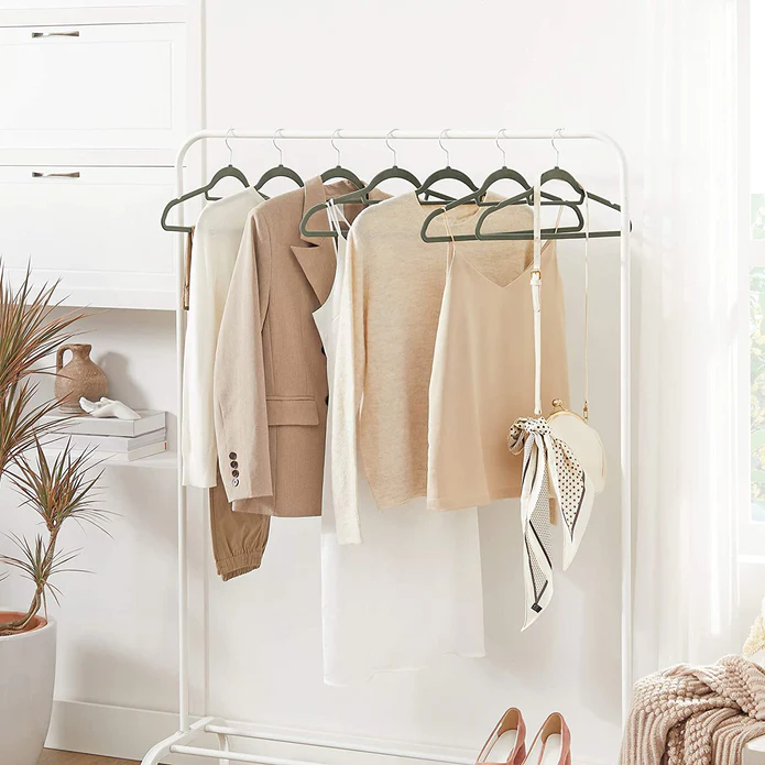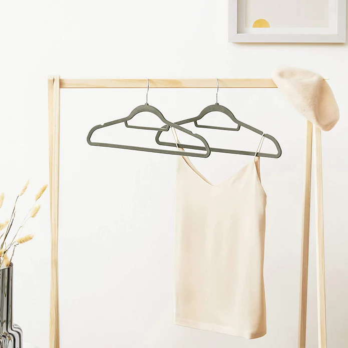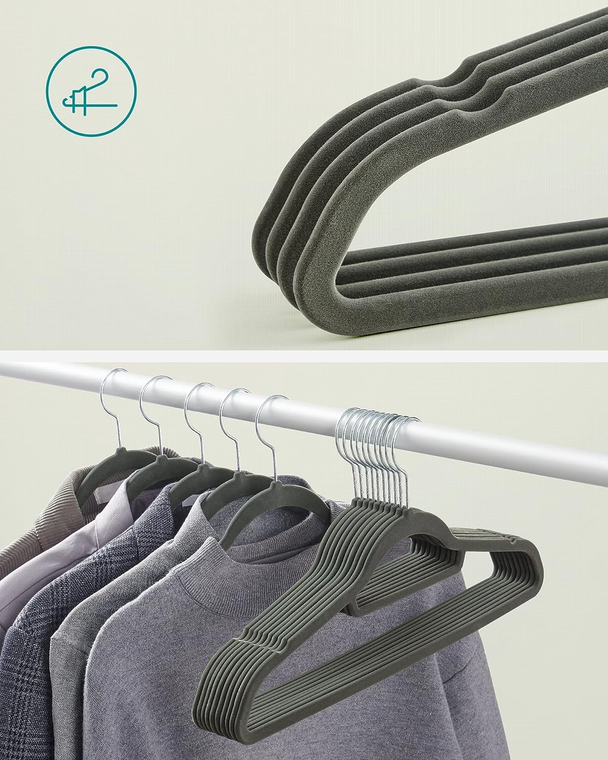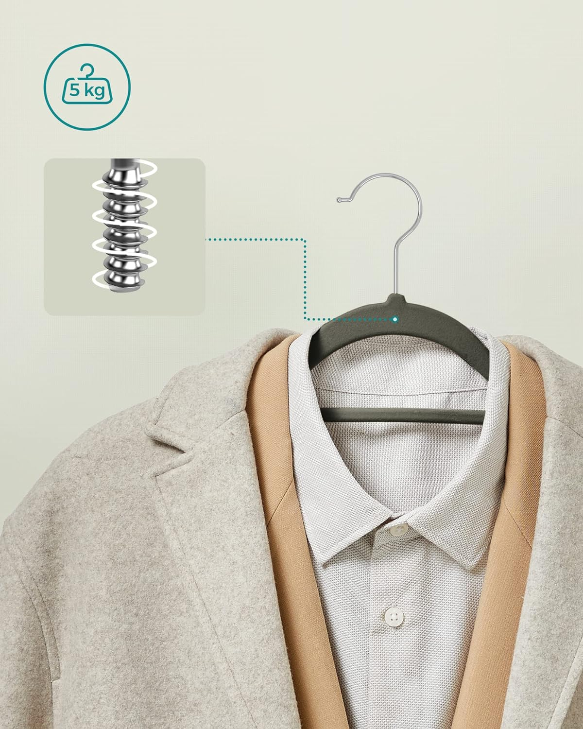 Specificatii:   	 Culoare: Gri  	 Material: Catifea, plastic ABS, carlig metalic  	 Dimensiunea fiecarui umeras: 43,5 x 0,6 x 22,5 cm (L x l x i)  	 Greutatea totala a 20 de umerase: 1,6 kg  	 Capacitate de incarcare statica per cuier: 5 kg    Despre acest articol Canelurile antiderapante de pe umeri impiedica alunecarea hainelor - chiar si a camasilor de matase.Fabricate din plastic ABS durabil, aceste umerase de haine sunt subtiri, dar foarte rezistente; fiecare umeras are o capacitate de incarcare statica maxima de 5 kg, astfel incat chiar si paltoanele grele de iarna pot fi agatate fara probleme.Fiecare cuier de catifea are un profil subtire, permitandu-va sa atarnati mai multe haine in acelasi spatiu; bara centrala poate fi folosita pentru esarfe sau cravate.Carligele solide placate cu metal de pe umerase se pot roti la 360°, astfel incat, chiar daca hainele dvs. sunt agatate in directia gresita, le puteti intoarce cu usurinta fara a fi nevoie sa scoateti hainele.Ce primiti: Un set de 20 de umerase de catifea de inalta calitate pentru haine, care este elegant, solid, greu de rupt si va dura multi ani de acum incolo.