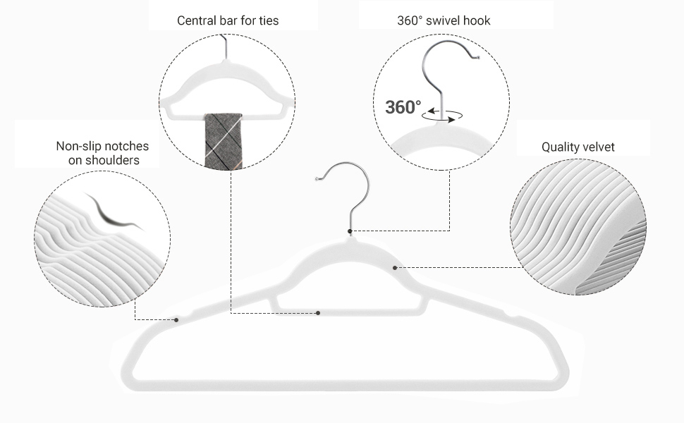 Specificatii: Culoare: alb Material: Catifea, plastic ABS, carlig metalic Dimensiunea unui singur cuier: 43,5 x 0,6 x 22,5 cm (L x l x i) Greutatea unui singur cuier: 78 g Capacitate de incarcare statica a unui singur cuier: 5 kg Despre acest articol Canelurile antiderapante de pe umeri impiedica alunecarea hainelor - chiar si a camasilor de matase.Fabricate din plastic ABS durabil, aceste umerase de haine sunt subtiri, dar foarte rezistente; fiecare umeras are o capacitate de incarcare statica maxima de 5 kg, astfel incat chiar si paltoanele grele de iarna pot fi agatate fara probleme.Fiecare cuier de catifea are un profil subtire, permitandu-va sa atarnati mai multe haine in acelasi spatiu; bara centrala poate fi folosita pentru esarfe sau cravate.Carligele argintii lucioase se rotesc la 360°, ajutandu-va sa va atarnati hainele in mod ordonat, adaugand in acelasi timp putina stralucire dulapului dvs.Ce primiti: Un set de 50 de umerase de catifea de inalta calitate cu carlige stralucitoare de culoare argintie, rezistente si greu de rupt, si o modalitate mai buna de a va organiza garderoba.