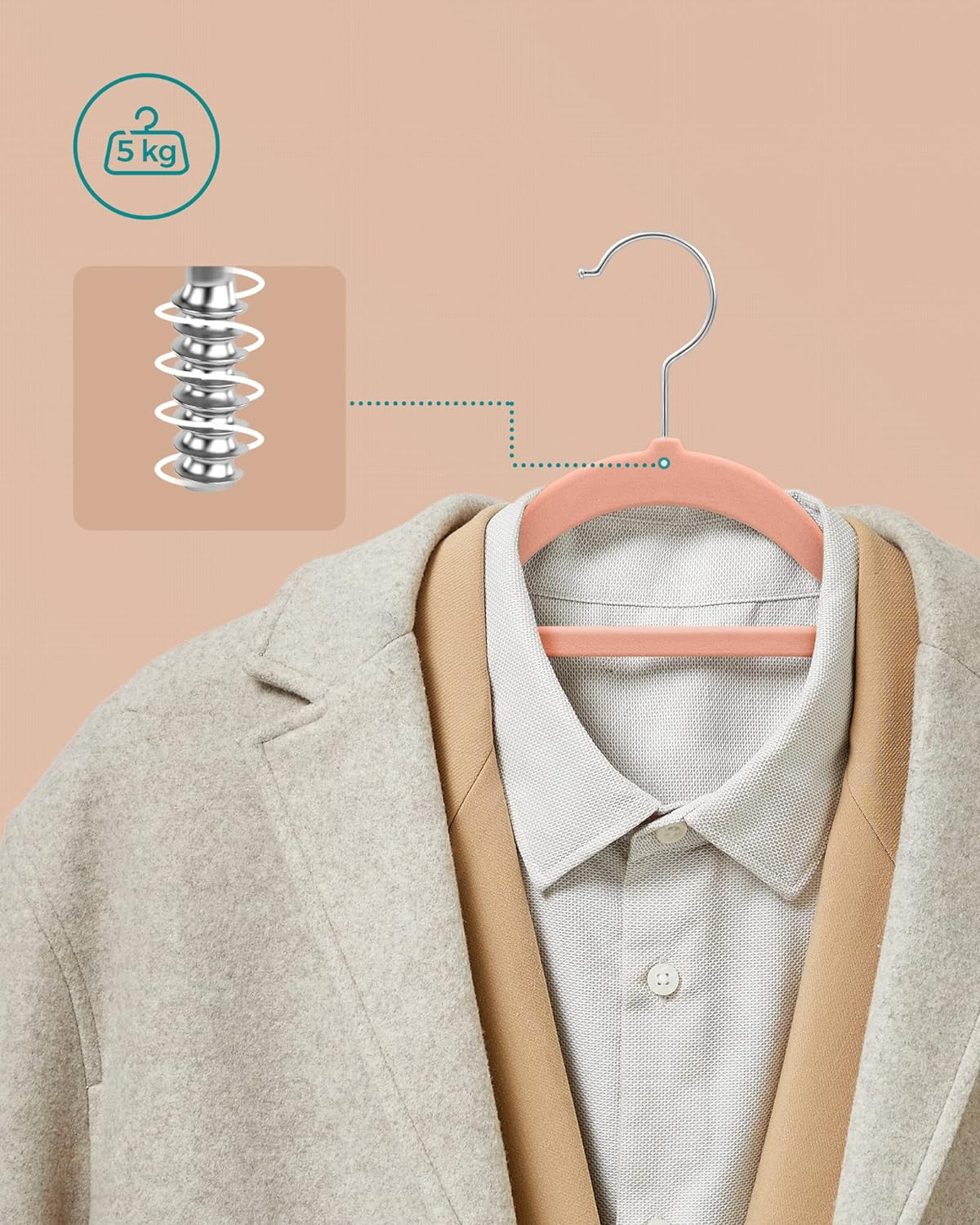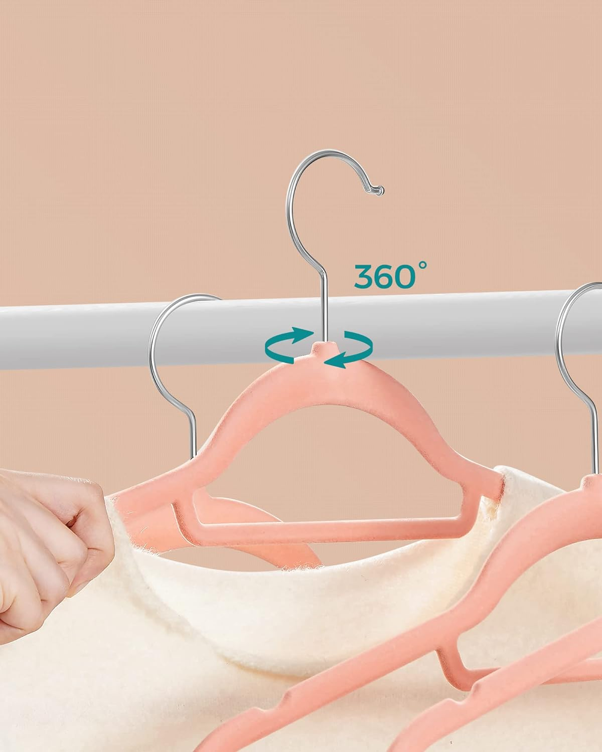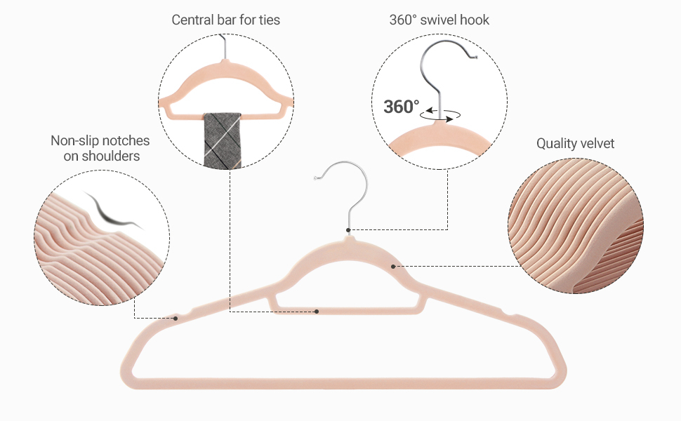 Specificatii:   	 Culoare: Roz deschis  	 Material: Catifea, plastic ABS, carlig metalic  	 Dimensiunea unui singur umeras: 45 x 0,6 x 23,5 cm (L x l x i)  	 Greutatea unui singur cuier: 78 g  	 Capacitate de incarcare statica a unui singur cuier: 5 kg    Despre acest articol Canelurile antiderapante de pe umeri impiedica alunecarea hainelor - chiar si a camasilor de matase.Fabricate din plastic ABS durabil, aceste umerase de haine sunt subtiri, dar foarte rezistente; fiecare umeras are o capacitate de incarcare statica maxima de 5 kg, astfel incat chiar si paltoanele grele de iarna pot fi agatate fara probleme.Fiecare cuier de catifea are un profil subtire, permitandu-va sa atarnati mai multe haine in acelasi spatiu; bara centrala poate fi folosita pentru esarfe sau cravate.Carligele argintii lucioase se rotesc la 360°, ajutandu-va sa va atarnati hainele in mod ordonat, adaugand in acelasi timp putina stralucire dulapului dvs.Ce primiti: Un set de 50 de umerase de catifea de inalta calitate cu carlige stralucitoare de culoare argintie, rezistente si greu de rupt, si o modalitate mai buna de a va organiza garderoba.