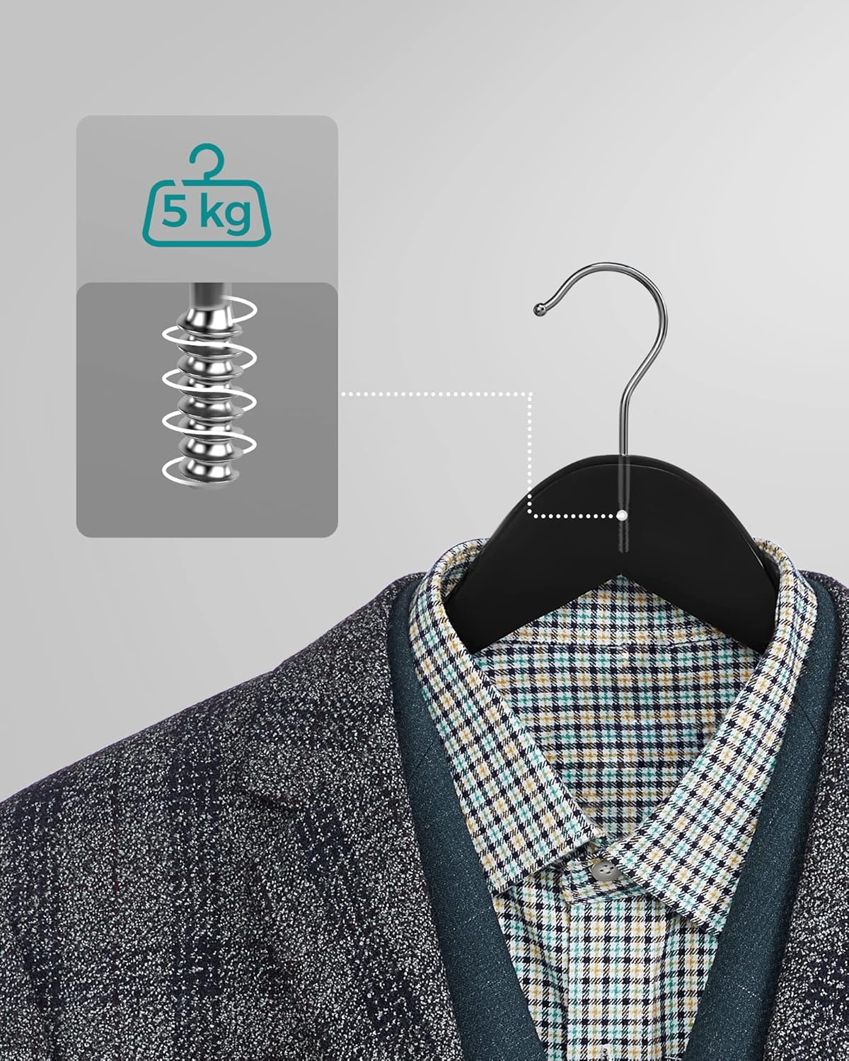 Specificatii tehnice    Brand:  SONGMICS  Model:  CRW02B-20  Tip produs:  Umerase haine  Material:  Lemn de artar + carlig metalic  Dimensiuni:  44.5 x 1.2 x 23 cm (L x l x H)  Greutate set:  2.3 kg  Greutate suportata per umeras:  5 kg  Set:  20 bucati  Culoare:  Negru + argintiu  Caracteristici speciale:  Decupaje antialunecare, bara pentru pantaloni, carlig rotativ 360°, forma ergonomica  Finisaj:  Suprafata neteda, lacuita  Instructiuni intretinere:  Nu se utilizeaza pentru haine ude, se sterg cu o carpa uscata, nu se expun la soare sau in medii umede  Accesorii incluse:  20 umerase din lemn   Scurta descriere:   Umerasele din lemn SONGMICS CRW02B-20 sunt alegerea ideala pentru pastrarea impecabila a hainelor. Fabricate din lemn de artar solid si finisate manual, aceste umerase sunt prevazute cu carlige rotative, decupaje antialunecare si bara pentru pantaloni. Forma curbata urmeaza linia umerilor, prevenind deformarea materialelor, iar structura solida permite sustinerea chiar si a hainelor grele, cum ar fi sacourile sau gecile de iarna.   Caracteristici principale:    	 Constructie solida din lemn de artar  	 Carlige metalice rotative 360°  	 Bara antialunecare pentru pantaloni  	 Decupaje laterale pentru bretele  	 Design ergonomic ce pastreaza forma hainelor  	 Set complet de 20 bucati  	 Finisaj elegant si neted, ideal pentru haine delicate