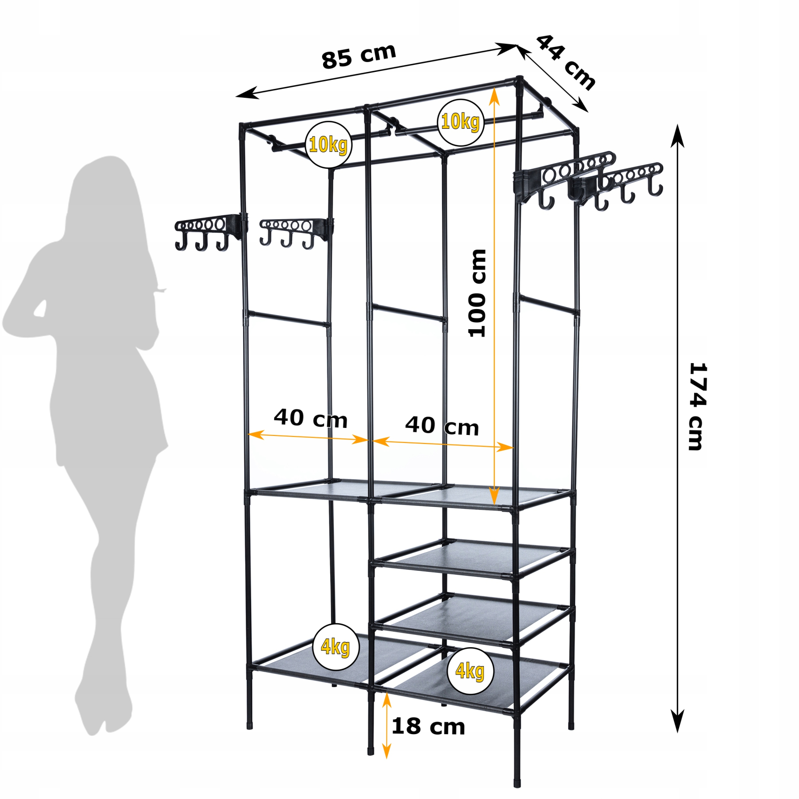 Specificatii tehnice:   	 constructie solida  	 sarcina maxima pe bara de rufe: 10kg  	 sarcina maxima pe raft: 4kg  	 2x bare pentru agatat hainele  	 4x umerase laterale suplimentare  	 6x rafturi spatioase  	 dimensiuni (latime/adancime/inaltime) 85x44x174cm   Umerasul are un aspect modern si estetic care se potriveste diverselor stiluri de interior. Constructia sa din metal adauga eleganta si farmec industrial. Suprafata mare a cuierului va permite sa atarnati o cantitate mare de imbracaminte, articole pentru acoperirea capului sau umbrele.   	 Poti aseza acest model in dormitor si va servi drept cuier pentru halate de baie , camasi, bluze si hanorace.  	 Un cuier amplasat in hol va va ajuta cu siguranta sa depozitati jachete, paltoane, pantofi si alte accesorii.  	 Dulapurile traditionale implica de obicei dimensiuni mari si costuri de achizitie. Decizand sa cumparati un cuier in picioare, veti economisi spatiu si bani!  	 Ele faciliteaza uscarea hainelor in zilele ploioase.  	 Datorita designului sau minimalist si modern, se va potrivi cu siguranta in orice camera din casa ta!  	 Umerasul este usor de asamblat si nu necesita unelte sau abilitati specializate.