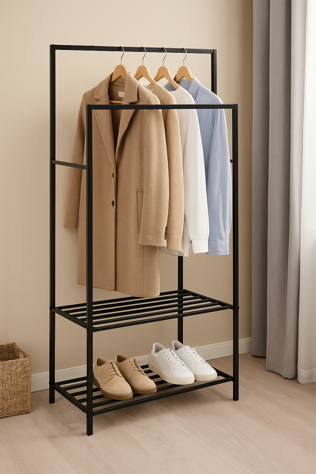 Specificatii tehnice Marca: 5Five Model: Strongy Culoare: Negru Dimensiuni produs: 117 x 50 x 170 cm Material: Otel Scurta descriere Suportul de haine Strongy de la 5Five este solutia ideala pentru organizarea eficienta a garderobei. Construit din otel rezistent, dispune de doua bare pentru umerase si un raft inferior, fiind prevazut cu roti pentru mobilitate sporita. Caracteristici principale 2 bare pentru haine cu spatiu dublu de agatare Structura solida din otel negru Roti pentru deplasare usoara Raft inferior pentru incaltaminte sau cutii Design functional si modern