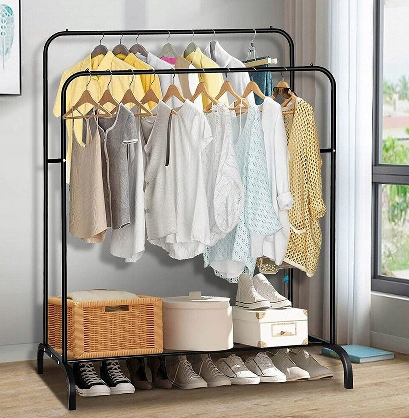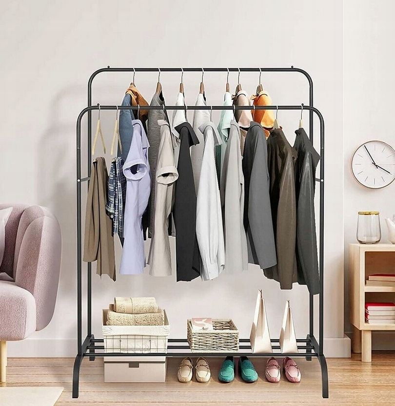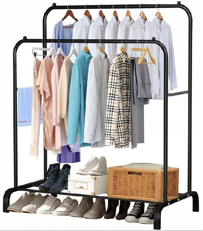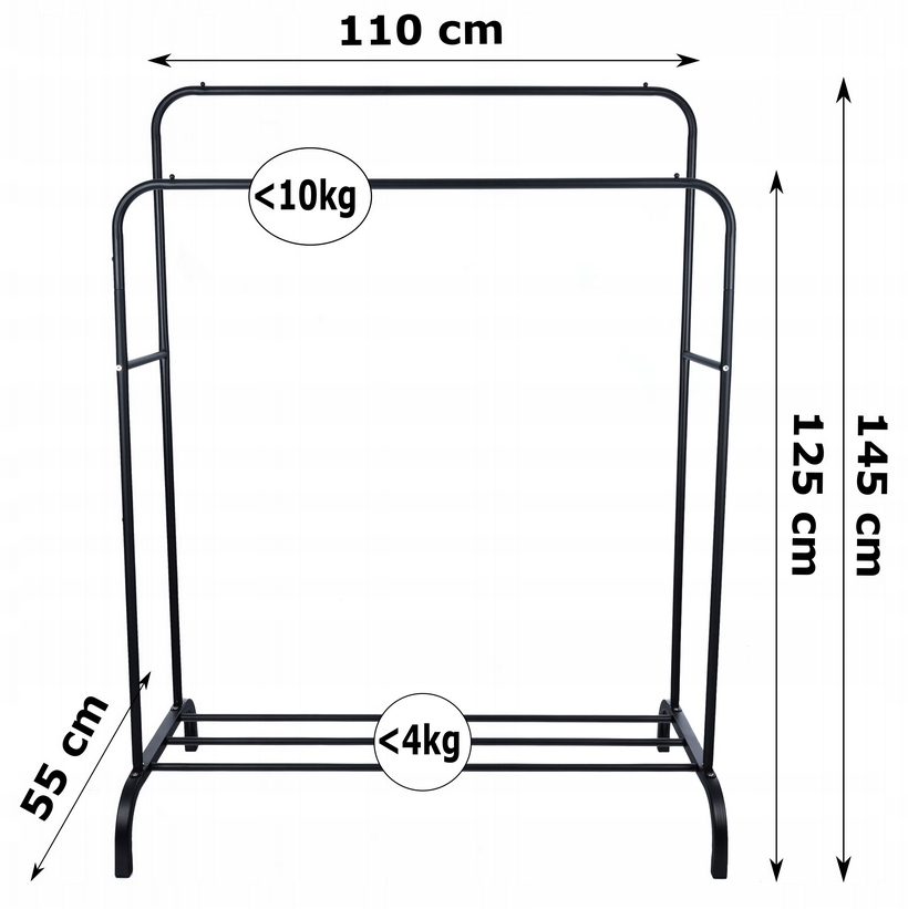 Suportul metalic cu bara dubla este o solutie practica si eleganta pentru organizarea hainelor. Structura solida permite depozitarea articolelor grele, iar designul compact il face potrivit pentru dormitoare, holuri sau spatii de depozitare.  Cele doua bare paralele ofera loc pentru  doua randuri de haine , ceea ce te ajuta sa economisesti spatiu si sa pastrezi totul ordonat.  Raftul inferior este ideal pentru incaltaminte sau cutii , iar constructia din otel asigura stabilitate buna chiar si la incarcare maxima. Este o piesa simpla si versatila, usor de integrat in decoruri moderne sau industriale. Se monteaza rapid, fara unelte speciale.   Specificatii tehnice:  – Dimensiuni: 110x55x145 cm – Structura: otel vopsit – Bare duble pentru umerase – Raft inferior pentru incaltaminte – Capacitate maxima bare: 10 kg – Capacitate maxima raft: 4 kg – Asamblare necesara: da (accesorii incluse) – Culoare: negru