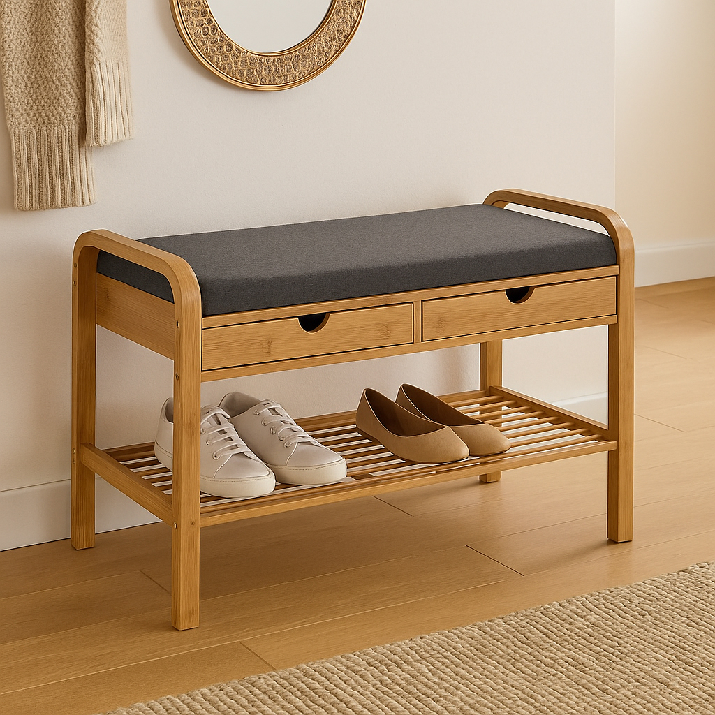 Specificatii tehnice Marca: 5Five Culoare: Bej Material: Bambus Dimensiuni produs: L. 73,8 x P. 33,6 x H. 55,2 cm Scurta descriere Aceasta banca suport pentru pantofi de la 5Five este practica si eleganta, ideala pentru organizarea holului sau dressingului. Fabricata integral din bambus, ofera doua rafturi spatioase pentru depozitarea a pana la 4 perechi de incaltaminte si o suprafata confortabila pentru sezut. Caracteristici principale Design 2-in-1: banca si raft pentru pantofi Suporta pana la 4 perechi Structura solida din bambus natural Finisaj bej cald, potrivit oricarui decor Suprafata superioara functionala pentru sezut sau depozitare Montaj rapid si intuitiv