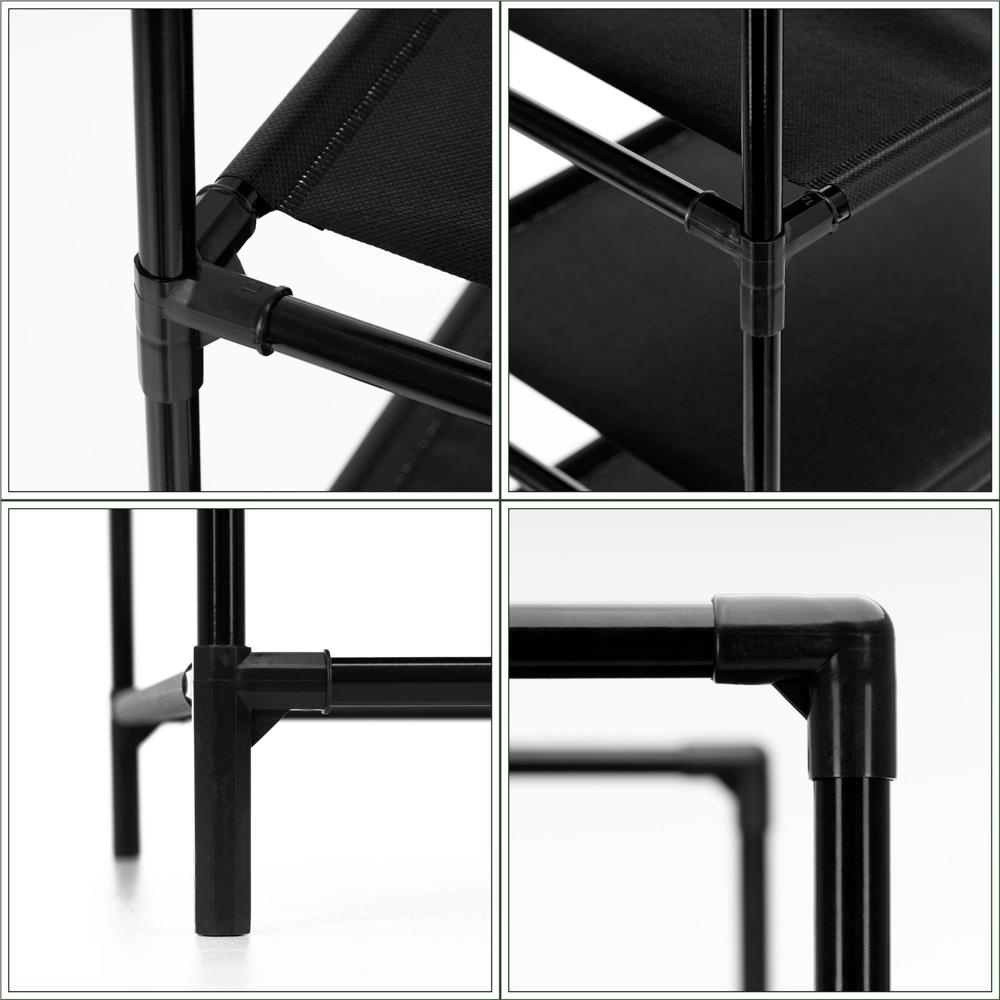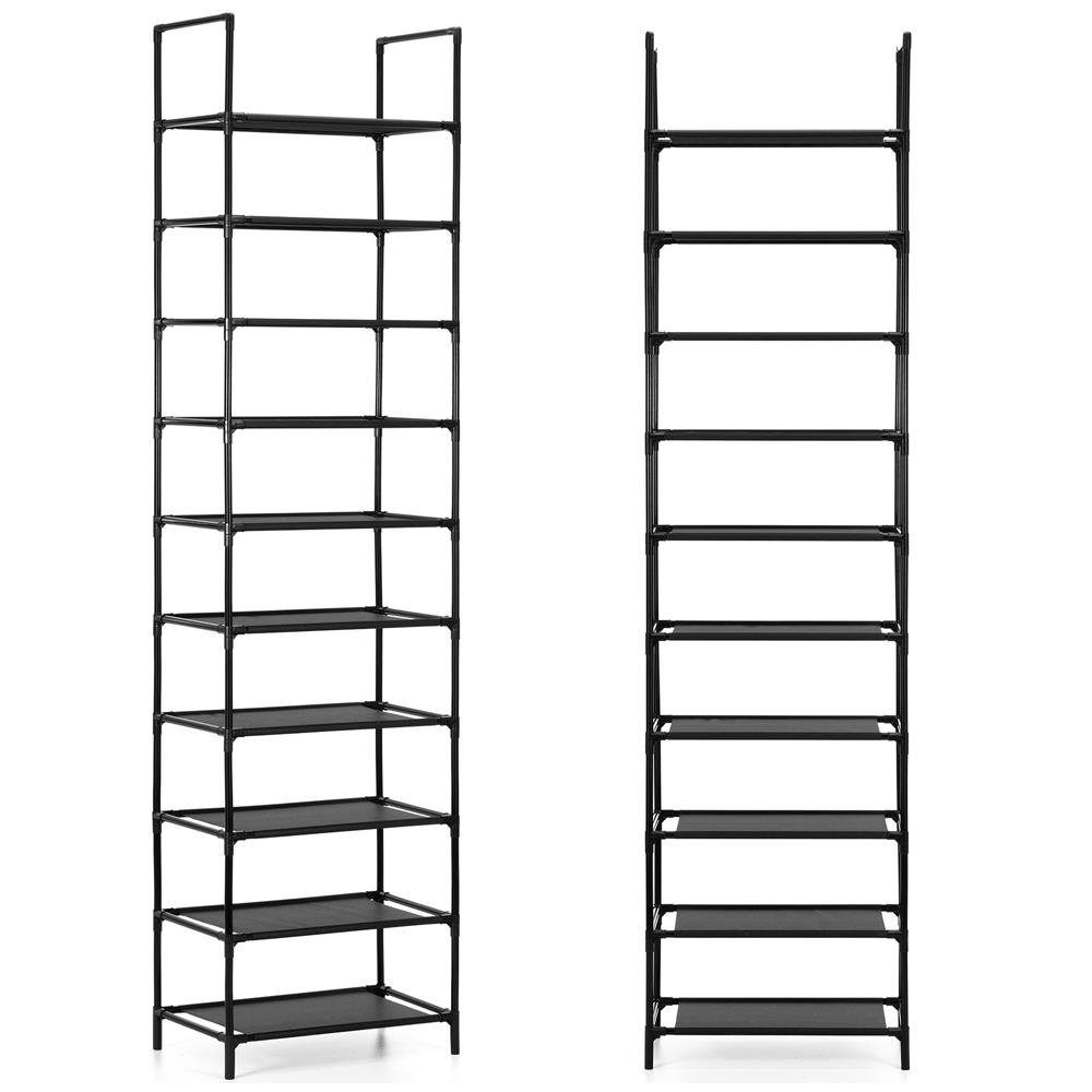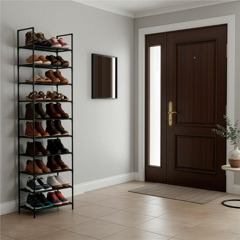 Etajera inalta cu zece polite, ideala pentru organizarea pe verticala a spatiului. Structura metalica ofera stabilitate, iar politele textile sunt potrivite pentru depozitare in dressing, camara sau spatii de depozitare.