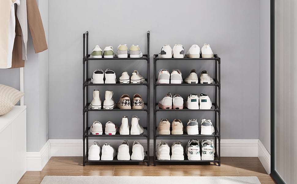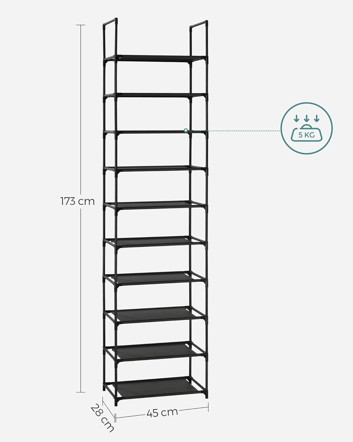 Specificatii: Culoare: Negru Material: Raft din tesatura netesuta, tub metalic, conector din plastic Dimensiunea produsului: 45 x 28 x 173 cm (L x l x a) Inaltimea dintre fiecare nivel: 17 cm Greutatea produsului: 1,6 kg Capacitate de incarcare statica a fiecarui nivel: 5 kg Despre acest articol Nu trebuie sa va fie teama de asamblarea acestui suport de pantofi, deoarece sunt furnizate instructiuni usor de citit si piese etichetate pentru o asamblare fara probleme.Acest raft pentru pantofi are o durata de viata lunga! Este fabricat din tuburi metalice rezistente si tesatura netesuta durabila, oferind pantofilor dvs. un suport stabil si fiabil.Cu o dimensiune de 45 x 28 x 173 cm, acest suport pentru pantofi cu 10 niveluri va ajuta sa economisiti spatiu pretios pe podea, oferind in acelasi timp o multime de spatiu de depozitare.Puteti folosi acest suport de pantofi in felul dvs.: impartiti-l in 2 parti si folositi-le in camere separate sau scoateti cateva rafturi pentru a potrivi pantofi sau cizme mai inalte.Acest organizator de depozitare a pantofilor se potriveste perfect in holul dvs., in camera de zi, in dressing, in dormitor sau oriunde aveti nevoie de depozitare suplimentara. Oriunde ati folosi suportul pentru pantofi, acesta va poate pastra intotdeauna pantofii curati si ordonati