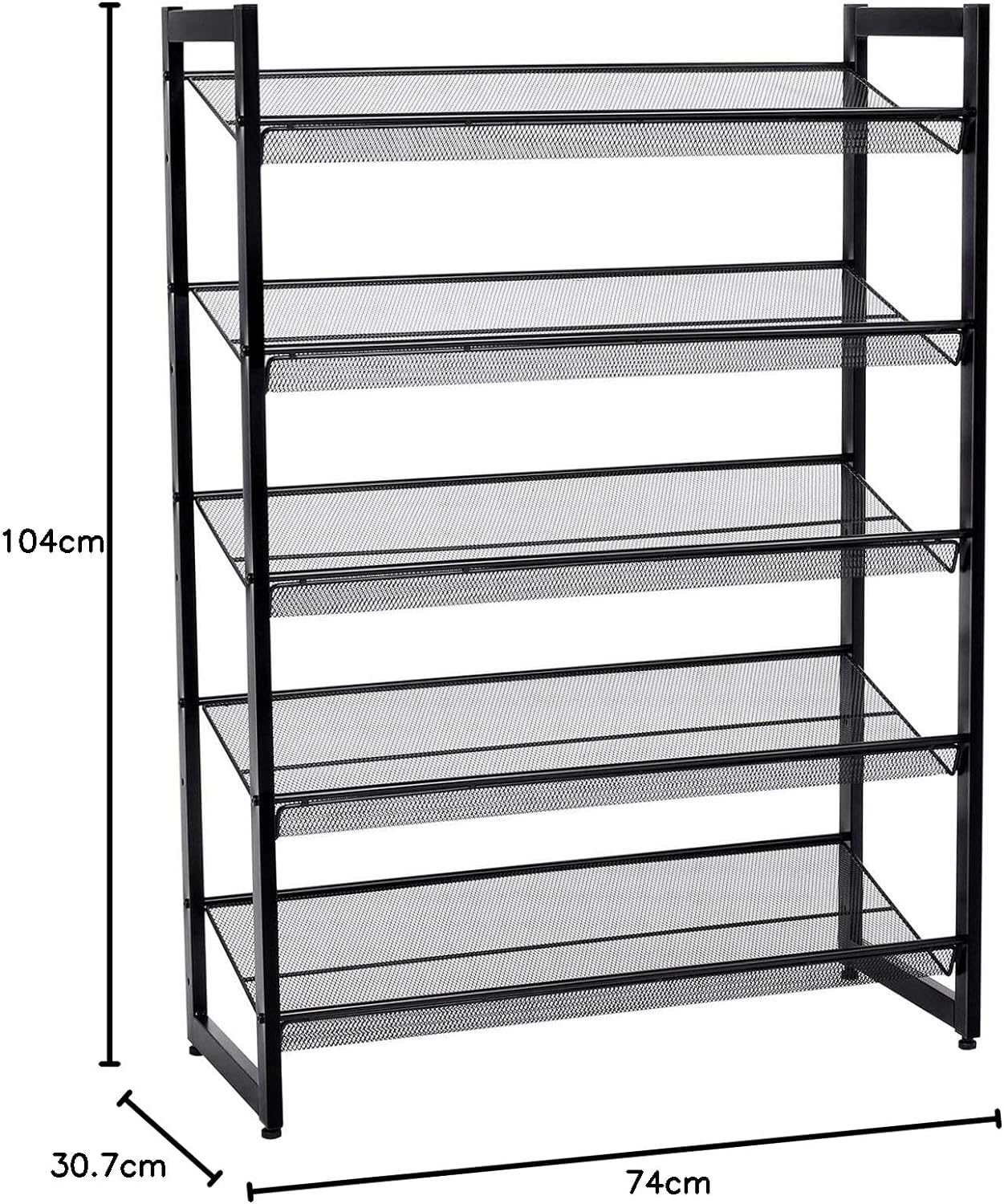 Numar de rafturi: 5 Caracteristica speciala: Rezistent la rugina Dimensiunile produsului: 104D x 30,7L x 74H centimetri Despre acest articol Personabil dupa cum aveti nevoie: Puteti alege sa asamblati rafturile plat sau inclinat pentru un acces mai usor la pantofi. De asemenea, puteti stivui 2 suporturi pentru spatiu suplimentar de depozitare. Pantofii mai inalti se potrivesc, de asemenea: Puteti elimina un nivel pentru a se potrivi cu cizme si mai inalte. 5 niveluri, gazduieste 15-20 perechi: Acest organizator de pantofi cu 5 niveluri poate tine 3 perechi de pantofi pentru barbati sau 4 perechi de pantofi de dama pe fiecare nivel, oferind o casa pentru pantofii tai de zi cu zi. Solid si stabil: Cu un cadru metalic puternic si rafturi din plasa densa, acest raft pentru depozitarea pantofilor este construit pentru a rezista. Si mai bine, vine cu picioare reglabile pentru a-l mentine stabil chiar si pe podele neuniforme. Nu exista o asamblare dificila aici: Acest suport metalic pentru pantofi vine cu piese numerotate si instructiuni detaliate pentru a va ajuta sa il configurati inainte de a va da seama.
