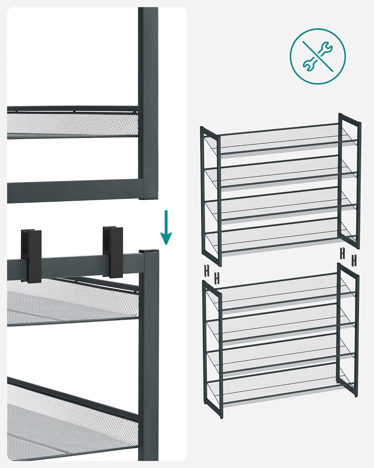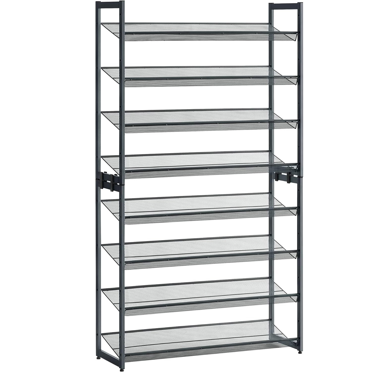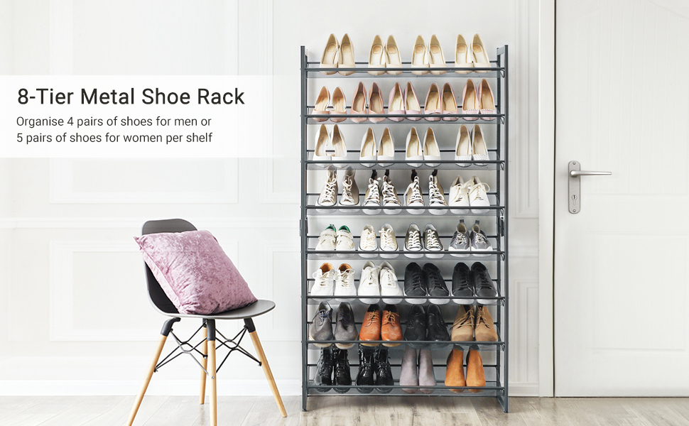 Specificatii: Culoare: Gri Material: Otel Dimensiunea produsului: 92,5 x 30,7 x 163,5 cm (L x l x i) Greutate: 10,7 kg Capacitatea de incarcare a fiecarui nivel: 10 kg Despre acest articol Puteti alege sa asamblati rafturile plate sau in unghi pentru un acces mai usor la pantofi. De asemenea, puteti alege sa impartiti raftul inalt pentru pantofi in 2 rafturi separate cu 4 niveluri pentru camere diferite sau sa le pastrati stivuite ca un raft cu 8 niveluri.Cu un spatiu amplu intre rafturi, tocurile inalte si adidasii cu varf inalt isi pot gasi un loc perfect aici, pe acest raft pentru pantofi. Sau, puteti indeparta un nivel pentru cizme si mai inalte.Acest organizator de pantofi cu 8 niveluri poate tine 4 perechi de pantofi de barbati sau 5 perechi de pantofi de femei pe fiecare nivel, oferind un loc pentru toti pantofii dvs.Cu un cadru metalic puternic si rafturi din plasa densa, acest raft de depozitare a pantofilor este construit pentru a dura. Chiar mai bine, vine cu picioare reglabile pentru a-l mentine stabil chiar si pe podele inegale.Acest raft metalic pentru pantofi vine cu piese numerotate si instructiuni detaliate pentru a va ajuta sa il montati inainte de a va da seama.