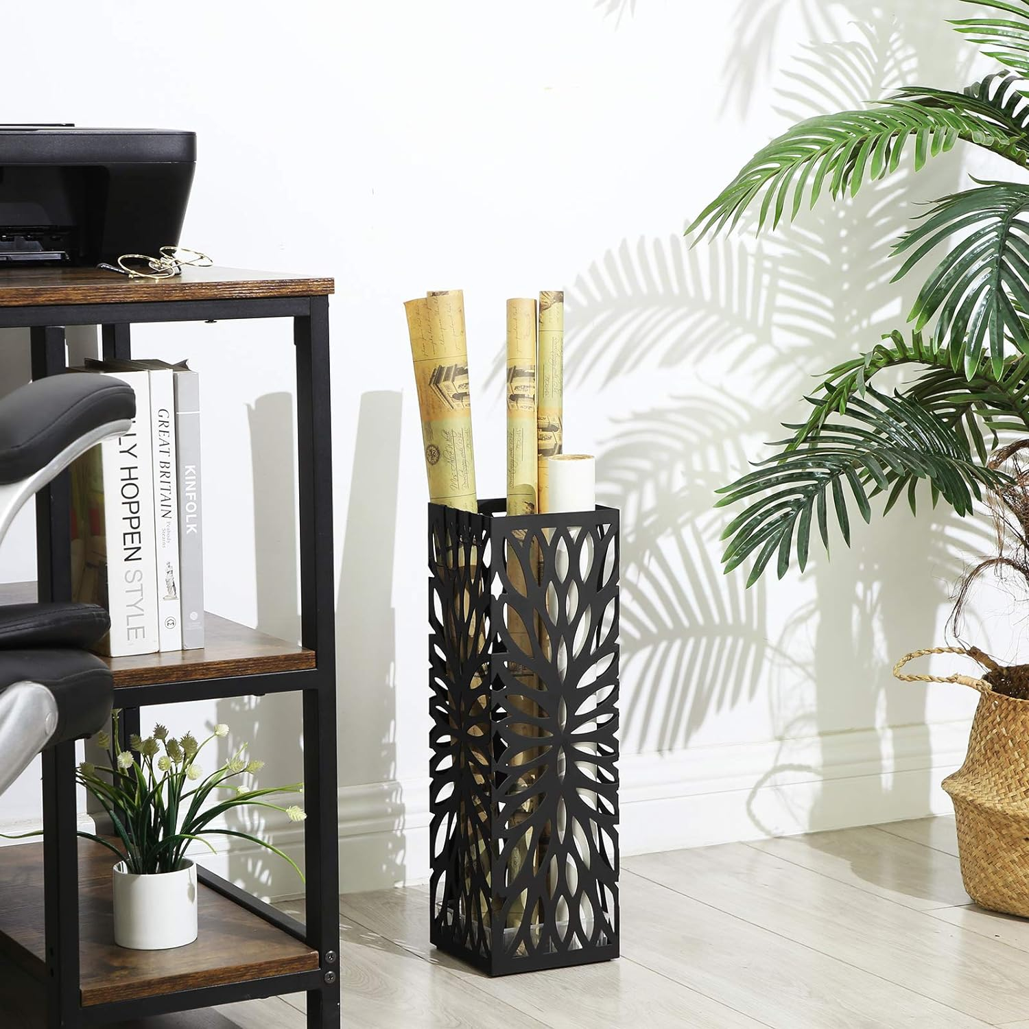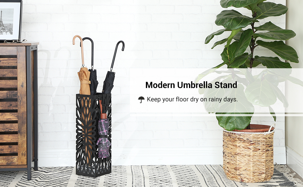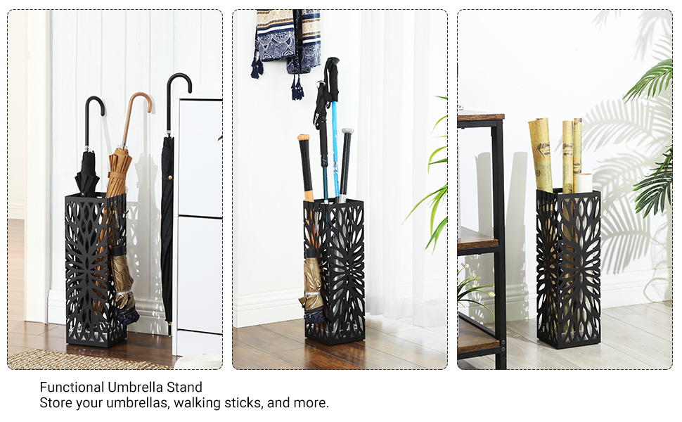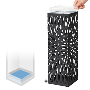 Specificatii:   	 Material: Metal  	 Dimensiuni: 15.5 x 15.5 x 49 cm (L x l x i)  	 Culoare: Negru  	 Greutate neta: 2 kg    Despre acest articol Mai mult decat un simplu loc pentru a va organiza si usca umbrelele in zilele ploioase, acest suport de umbrele cu decupaje cu tematica de ploaie confera un aspect artistic pentru o intrare mai primitoare.Nu lasati picaturile de ploaie de la umbrele sa va strice podeaua si dragostea pentru zilele ploioase; opriti-le cu ajutorul tavii de scurgere din acest suport pentru umbrele si apoi bucurati-va de zi – intindeti-va cu o carte sau nu faceti nimic altceva decat sa ascultati ploaia.Acest suport de 15.5 x 15.5 x 49 cm ofera suficient spatiu pentru umbrelele dvs. lungi. Dar asta este doar o parte din el! Cele 4 carlige va permit, de asemenea, sa agatati umbrelele dvs. mici pliabile, astfel incat sa nu se adune in partea de jos.Acest suport de umbrele din metal de calitate asigura un nivel ridicat de stabilitate, chiar daca puneti inauntru mai multe umbrele lungi, role de hartie, bastoane sau alte obiecte.