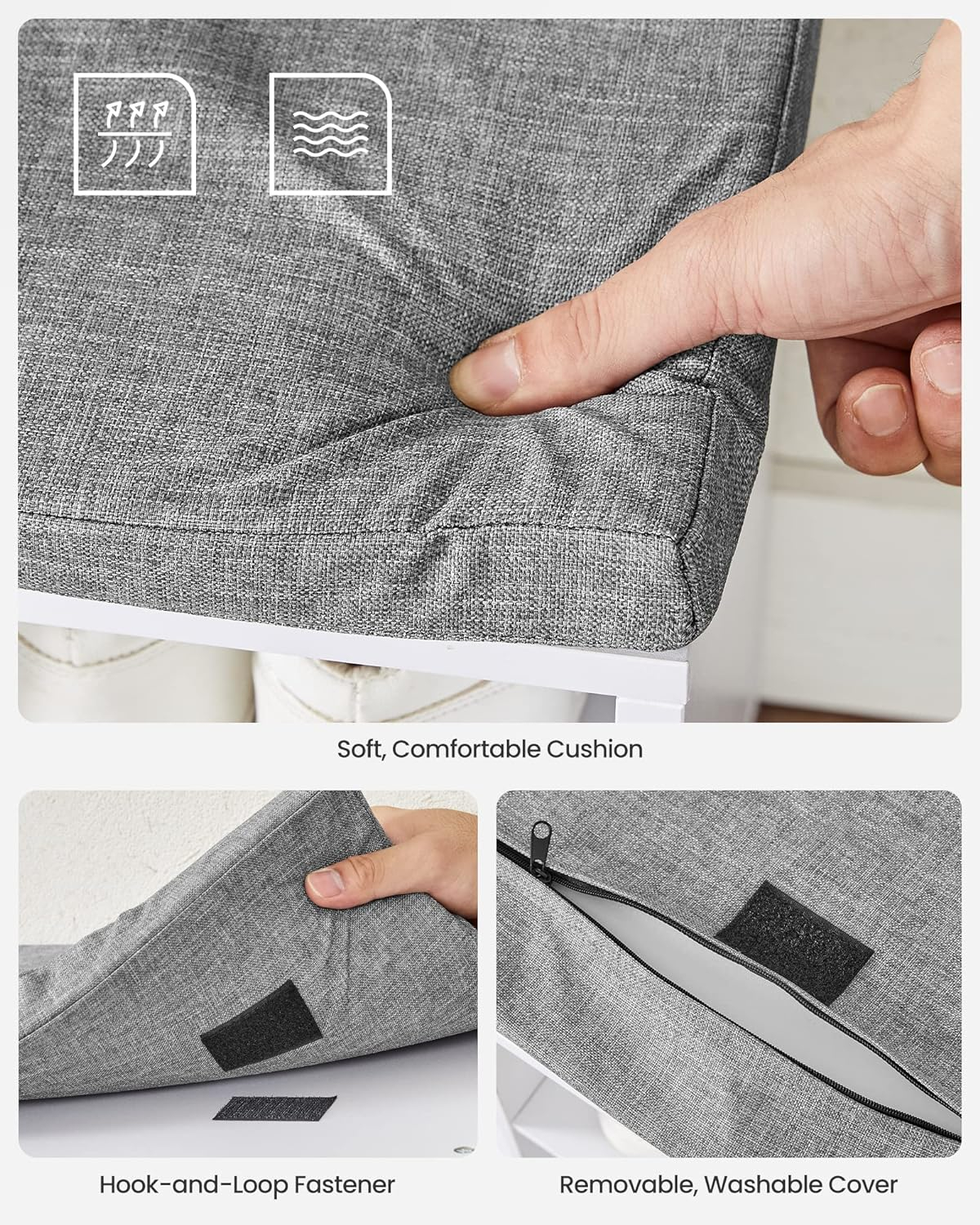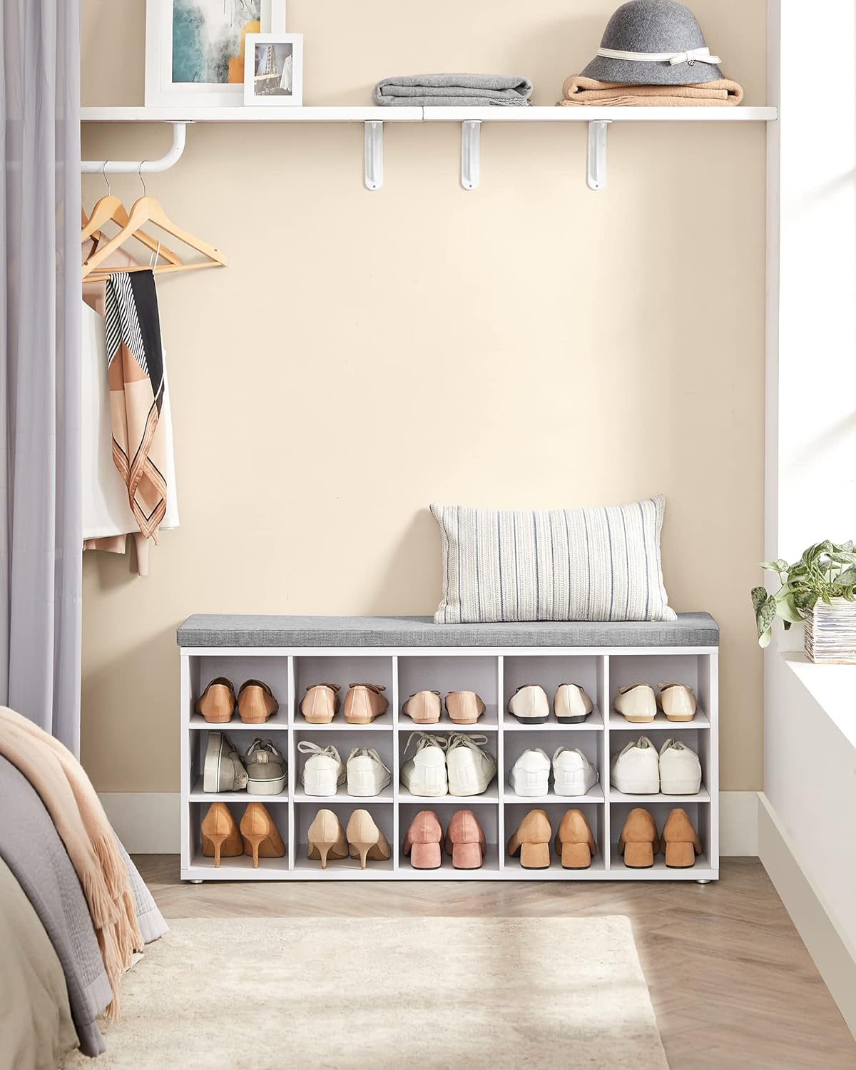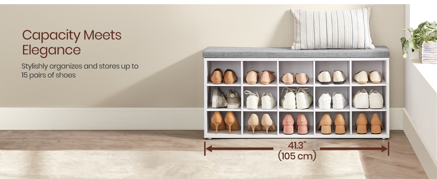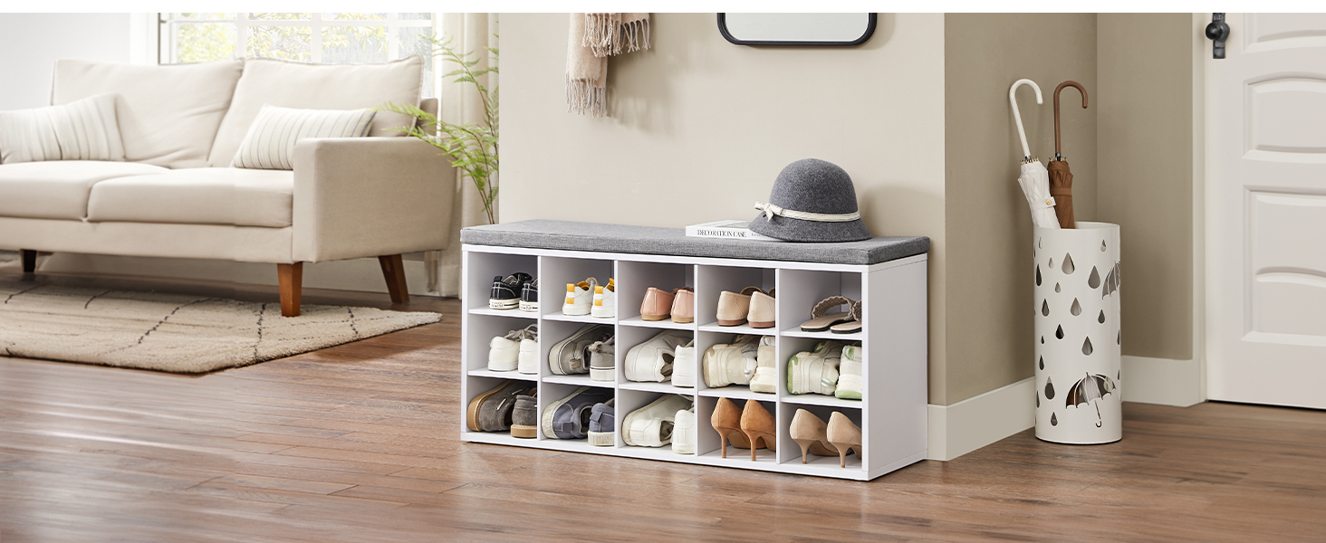 Materiale: MDF Culoare: alb, gri Finisaj: mat Stil: modern, scandinav Forma: dreptunghiulara Sarcina maxima: 200 kg Numar de rafturi: 15 Dimensiunea produsului: 30 x 105 x 48 cm Greutatea produsului: 19,5 kg O banca practica de pantofi cu un scaun confortabil este o solutie eleganta care se potriveste perfect nevoilor oricui doreste sa-si pastreze interiorul ordonat si estetic. Cincisprezece compartimente pentru incaltaminte va permit sa organizati pantofii intregii familii intr-un singur loc, unde fiecare membru al gospodariei isi va gasi un loc desemnat, ceea ce face ca pastrarea ordinii sa fie mai usoara ca niciodata. Banca este realizata dintr-o placa solida din MDF care poate suporta o incarcatura de pana la 200 kg, iar scaunul confortabil iti va permite sa va incaltati si sa va descaltati intr-un mod cat mai placut. Perna este atasata cu Velcro. In plus, designul elegant al mobilierului se incadreaza perfect in diverse amenajari interioare, adaugand un accent subtil, functional. Acest pantofar multifunctional este atat un scaun confortabil cat si un suport practic pentru pantofi.