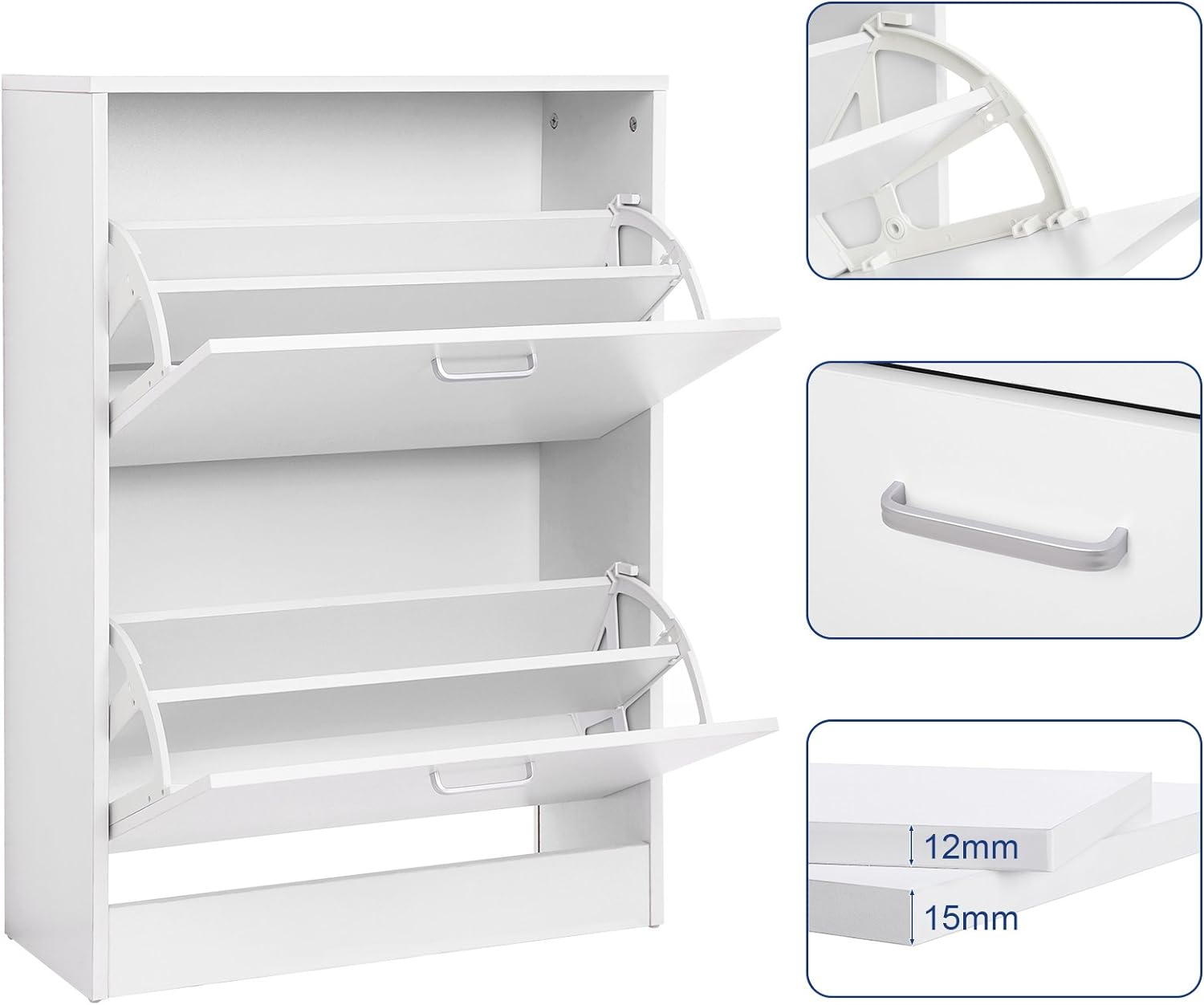 Marca: VASAGLE Culoare: alb Dimensiunile produsului: 24D x 60W x 83,5H centimetri Despre acest articol Intrarea este cartea de vizita a casei dvs. Cu un aspect modern si manere metalice pe usile rabatabile, acest dulap de pantofi cu elemente armonice lasa oaspetilor tai o impresie buna; grosimea sa de 24 cm nu ocupa spatiul tau valoros in sufragerie sau pe hol.Proiectat cu sertare duble, unitatea de depozitare a pantofilor foloseste pe deplin spatiul vertical pentru a tine 12 perechi de pantofi de dama sau 8 pantofi de barbati; botine si tocuri inalte? Nicio problema, doar scoateti separatorul reglabil din fiecare sertar!Structura solida este conectata prin suruburi 3 in 1, care elimina abaterile si fisurile cauzate de suruburile autofiletante si ii asigura rezistenta pentru anii urmatori; panoul din spate si kitul anti-rasturnare pentru atasarea dulapului pe perete imbunatatesc stabilitatea generala.Asamblare fara griji: instructiunile ilustrate clare si piesele numerotate va ofera un asamblare fara griji; cu un surub de rezerva suplimentar, acest dulap pentru pantofi se gandeste deja la confortul tau inainte de a fi instalat.Un dulap de pantofi cu 2 sertare care tine pantofii dezordonati departe de vedere pentru un living sau hol bine organizat si o rutina de dimineata lina care va permite sa va gasiti pantofii intr-o clipita.