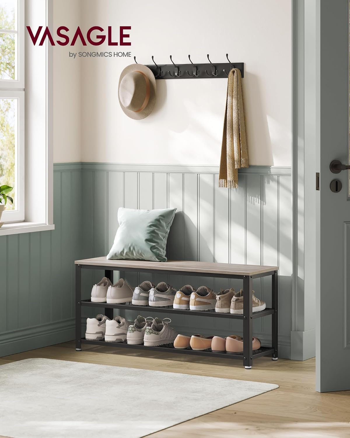 Specificatii tehnice: Brand: VASAGLE Tip produs: Etajera pantofi cu banca Material: PAL, metal Cadru: Metalic Culoare: Gri + negru Dimensiuni: 100 x 30 x 45 cm Greutate maxima suportata: 90 kg Numar rafturi: 2 Stil picioare: Standard Scurta descriere: Aceasta bancuta pentru pantofi VASAGLE imbina utilul cu esteticul. Cu doua rafturi metalice incapatoare si un blat superior robust, iti ofera o solutie practica si eleganta pentru organizarea pantofilor si a accesoriilor din hol sau living. Caracteristici principale: Design industrial cu finisaj gri si cadru negru 2 rafturi metalice pentru 8-10 perechi de incaltaminte Blat superior solid, ideal pentru asezat Structura robusta din metal si PAL Montaj simplu cu instructiuni ilustrate Picioare reglabile pentru stabilitate optima