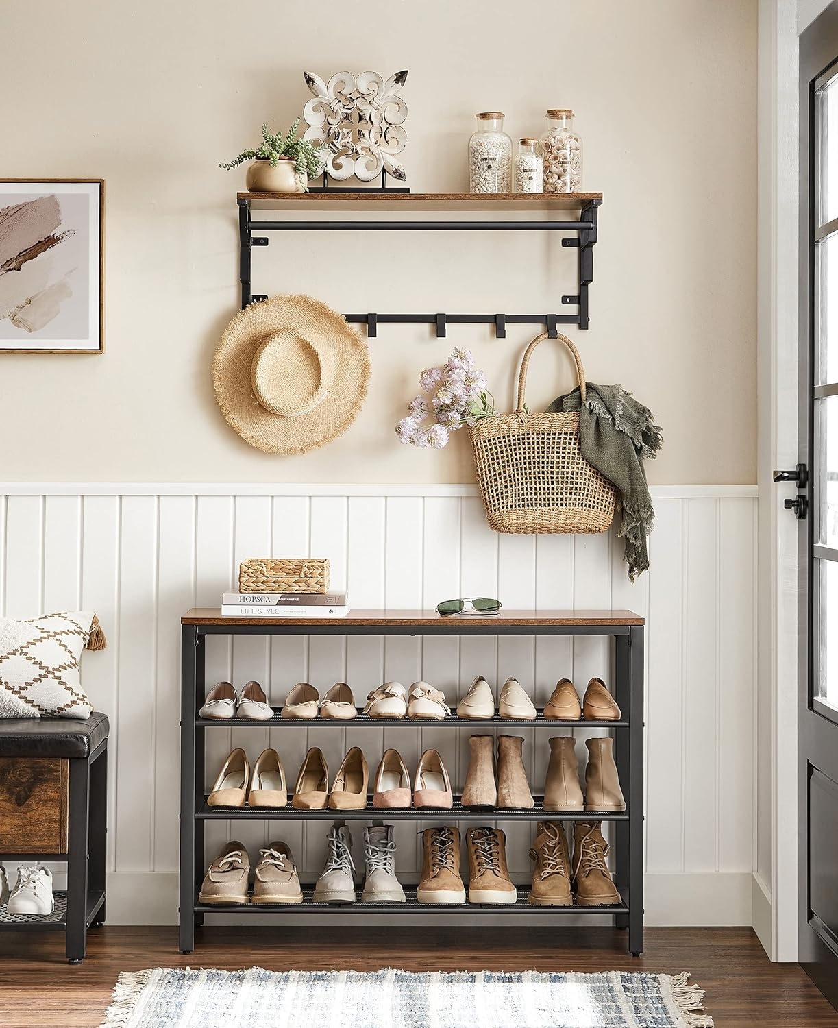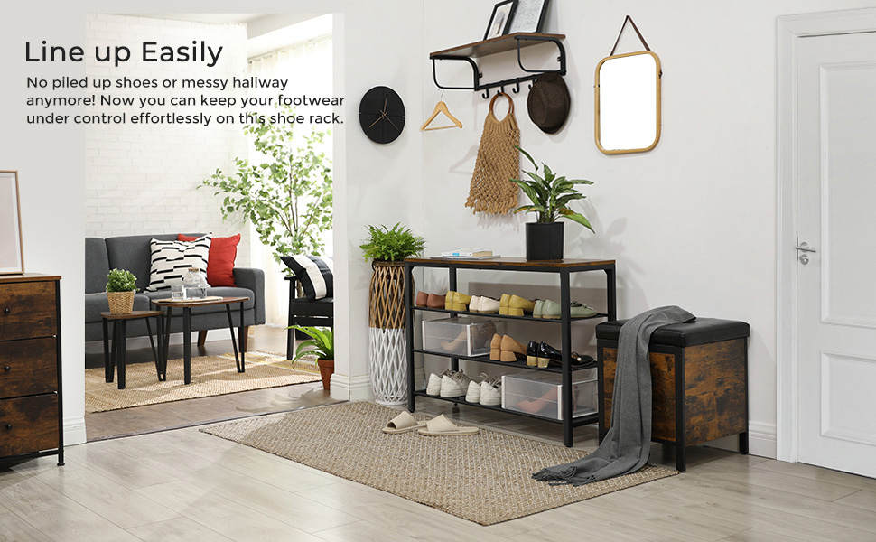 Specificatii:   	 Culoare: Maro rustic, Negru  	 Material: Placi aglomerate, otel  	 Dimensiunea produsului: 100 x 30 x 72 cm (L x l x i)  	 Greutatea produsului: 8,5 kg  	 Capacitate de incarcare statica a partii superioare: 10 kg  	 Capacitate de incarcare statica pentru fiecare raft cu plasa: 5 kg    Despre acest articol Cadrul din otel negru mat si partea superioara maro rustic a acestui organizator de pantofi se potrivesc perfect. Puneti 5 perechi de pantofi sau alte obiecte pe el, capacitatea de incarcare a fiecarui nivel este de 5 kg.  Datorita pieselor numerotate si instructiunilor usor de urmat, asamblarea se face in cel mai scurt timp. Datorita picioarelor sale reglabile si a dispozitivului anti-inclinare, acest raft nu se clatina.Profitati de spatiile mici pentru a depozita, astfel incat sa nu pierdeti spatiu, nici macar un centimetru patrat.