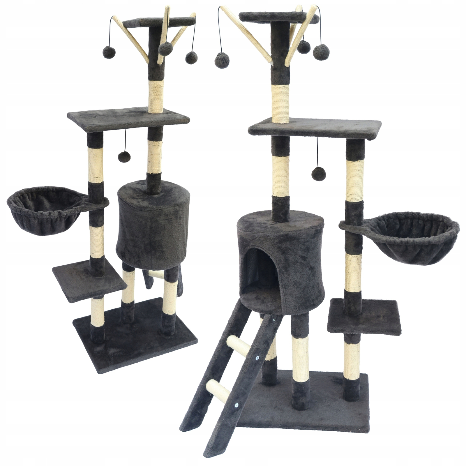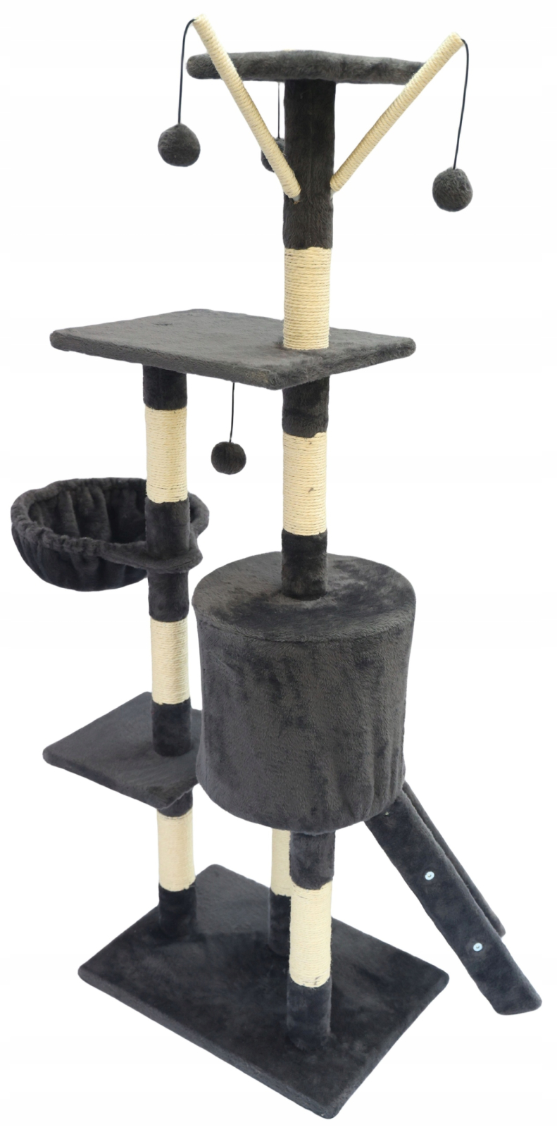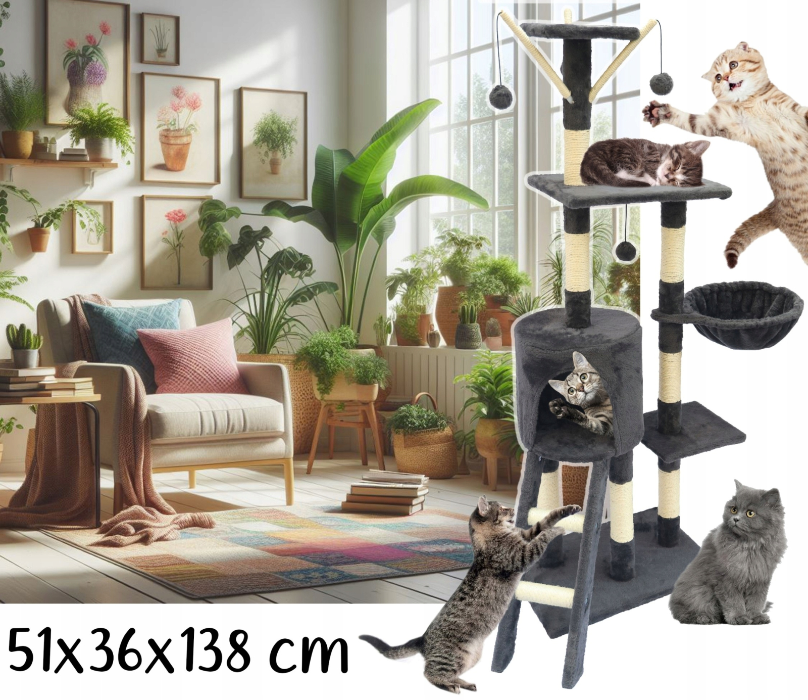 Ansamblul ofera pisicii un spatiu complet pentru joaca, observatie si relaxare. Este format din 6 niveluri usor accesibile, o casuta inchisa , un culcus suspendat moale , o scara captusita si mai multe jucarii cu pompoane care stimuleaza activitatea. Stalpii sunt infasurati in sisal natural , perfect pentru zgariat, iar suprafetele sunt acoperite cu material textil placut la atingere . Baza este stabila si bine echilibrata, ideala pentru o sau mai multe pisici de talie mica sau medie. Se monteaza usor si nu necesita unelte speciale. Este o solutie practica si estetica, care tine pisica activa si protejeaza in acelasi timp mobilierul din casa. Specificatii tehnice: – Dimensiuni baza: 51x36 cm – Inaltime totala: 138 cm – Niveluri: 6 – Materiale: MDF, flanela, sisal – Include: casuta, culcus suspendat, scara, 3 jucarii cu pompoane – Potrivit pentru pisici de talie mica si medie – Culoare: negru – Asamblare necesara: da (accesorii incluse)