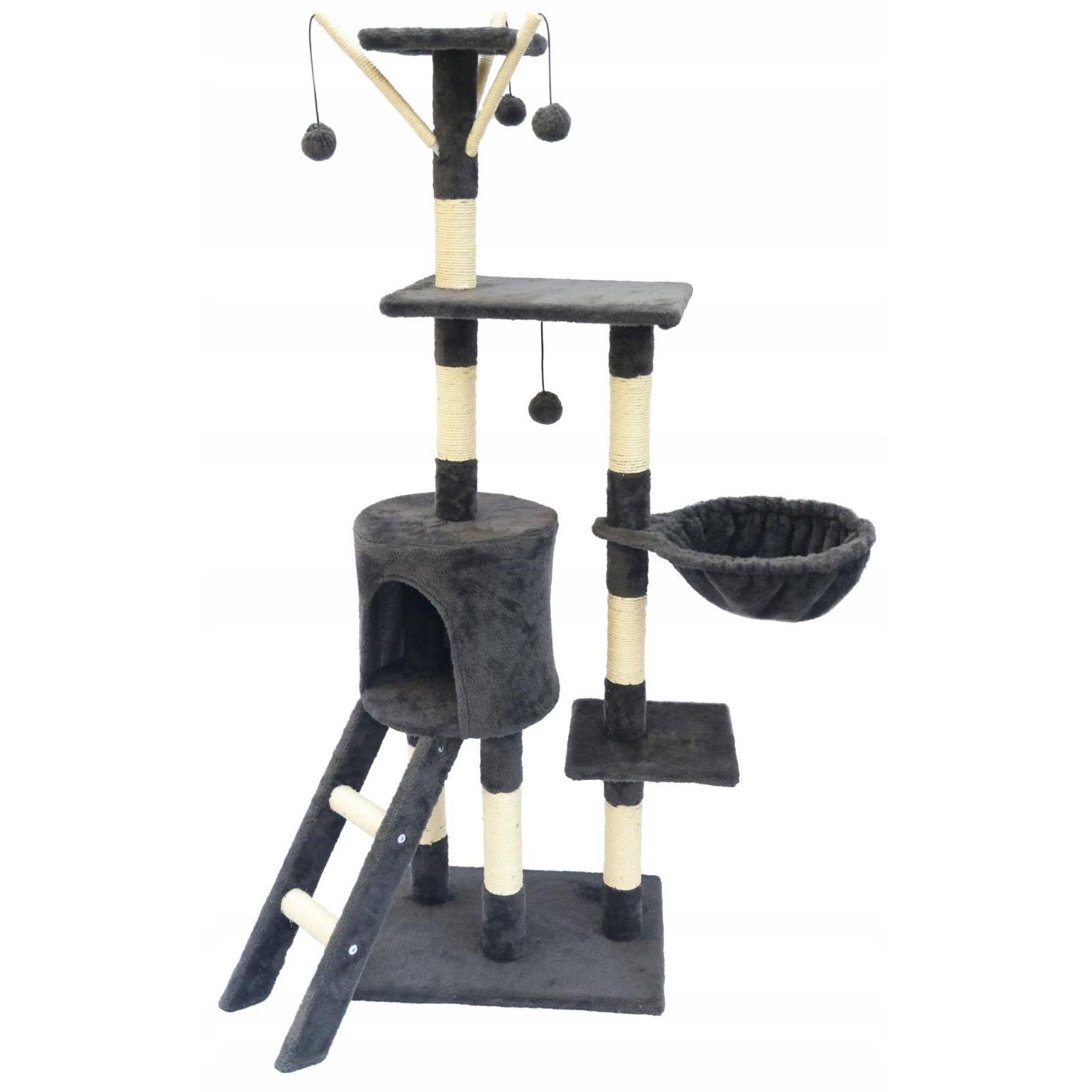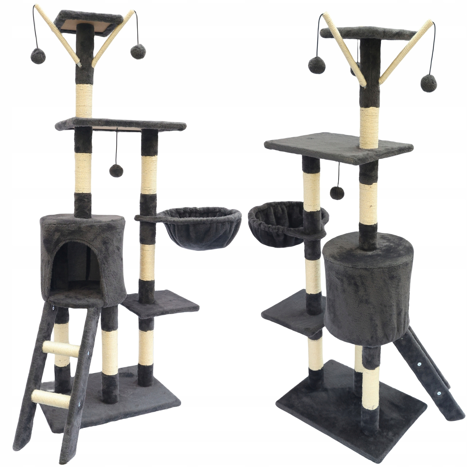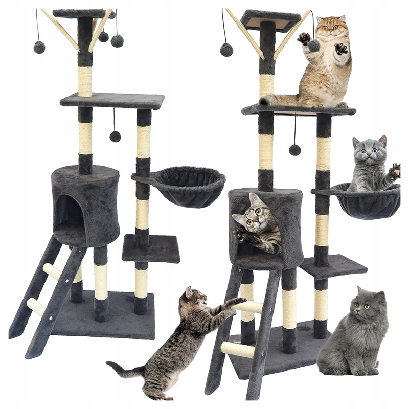 Ansamblul ofera pisicii un spatiu complet pentru joaca, observatie si relaxare. Este format din 6 niveluri usor accesibile, o casuta inchisa , un culcus suspendat moale , o scara captusita si mai multe jucarii cu pompoane care stimuleaza activitatea. Stalpii sunt infasurati in sisal natural , perfect pentru zgariat, iar suprafetele sunt acoperite cu material textil placut la atingere . Baza este stabila si bine echilibrata, ideala pentru o sau mai multe pisici de talie mica sau medie. Se monteaza usor si nu necesita unelte speciale. Este o solutie practica si estetica, care tine pisica activa si protejeaza in acelasi timp mobilierul din casa. Specificatii tehnice: – Dimensiuni baza: 51x36 cm – Inaltime totala: 138 cm – Niveluri: 6 – Materiale: MDF, flanela, sisal – Include: casuta, culcus suspendat, scara, 3 jucarii cu pompoane – Potrivit pentru pisici de talie mica si medie – Culoare: negru – Asamblare necesara: da (accesorii incluse)
