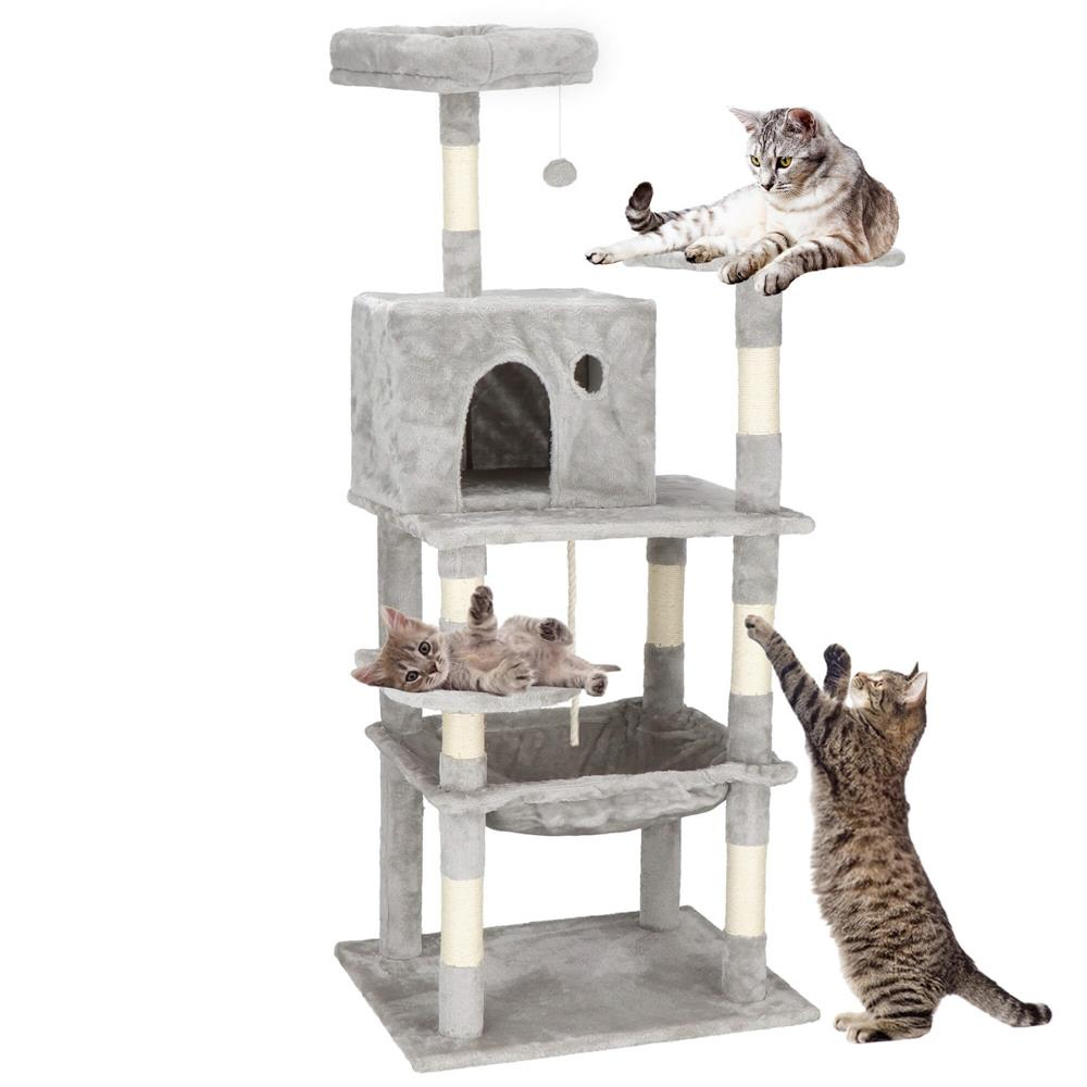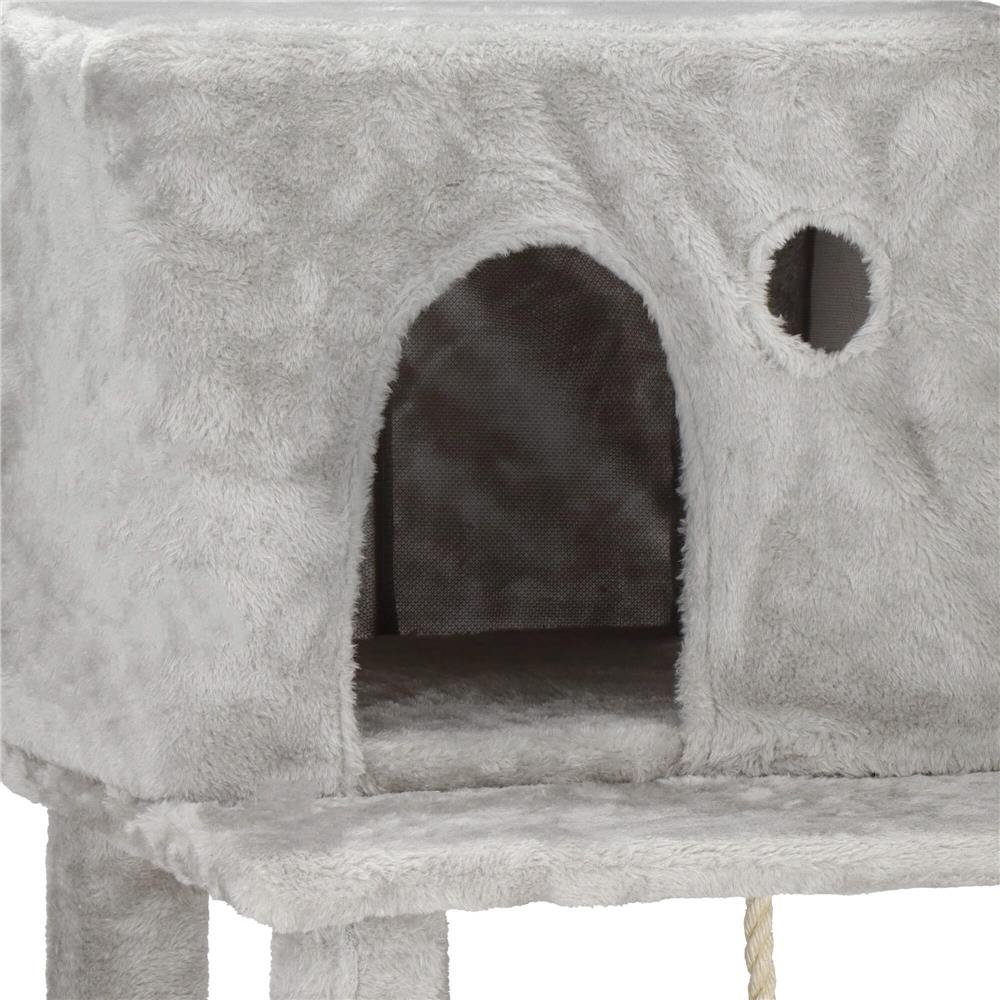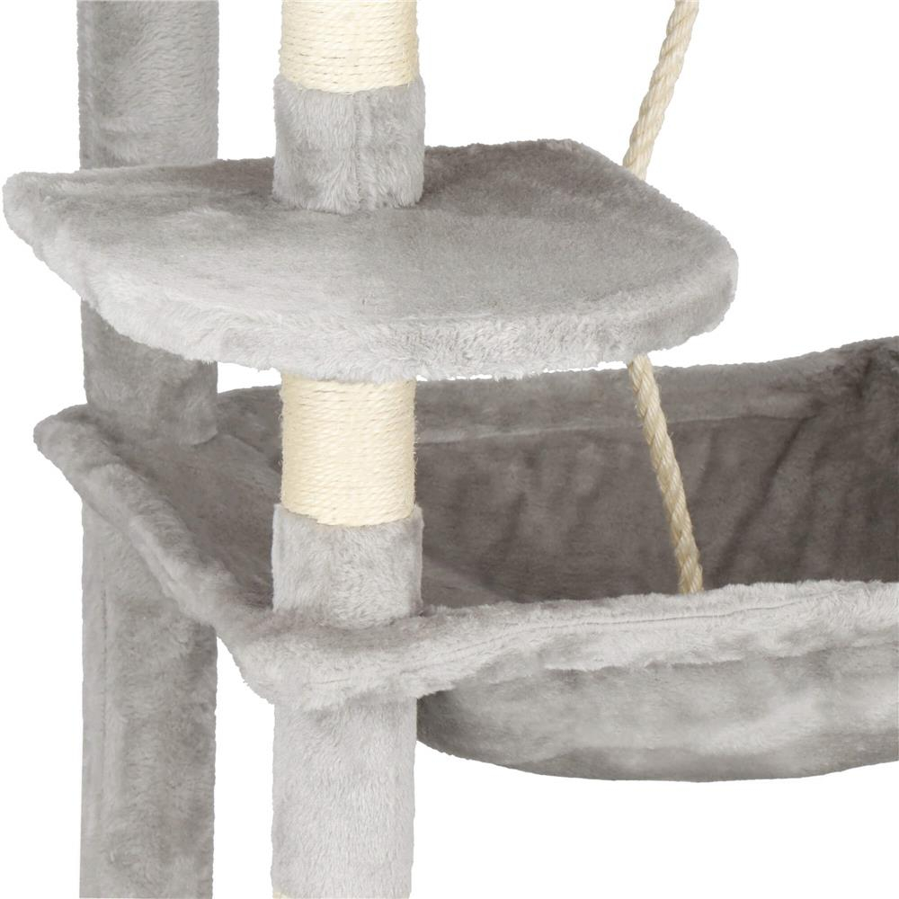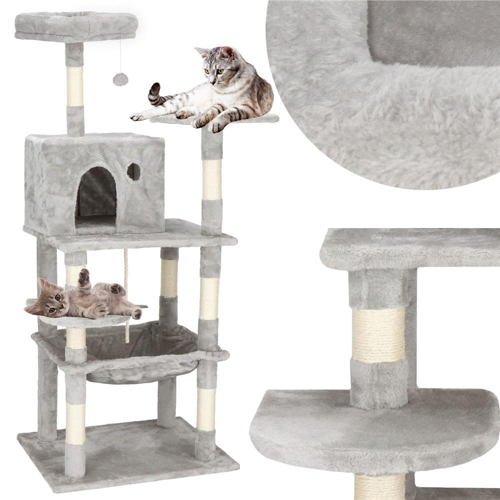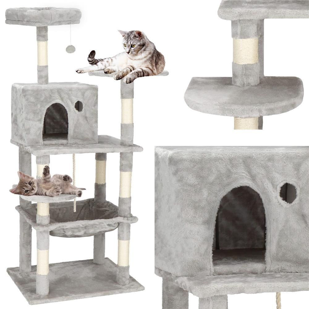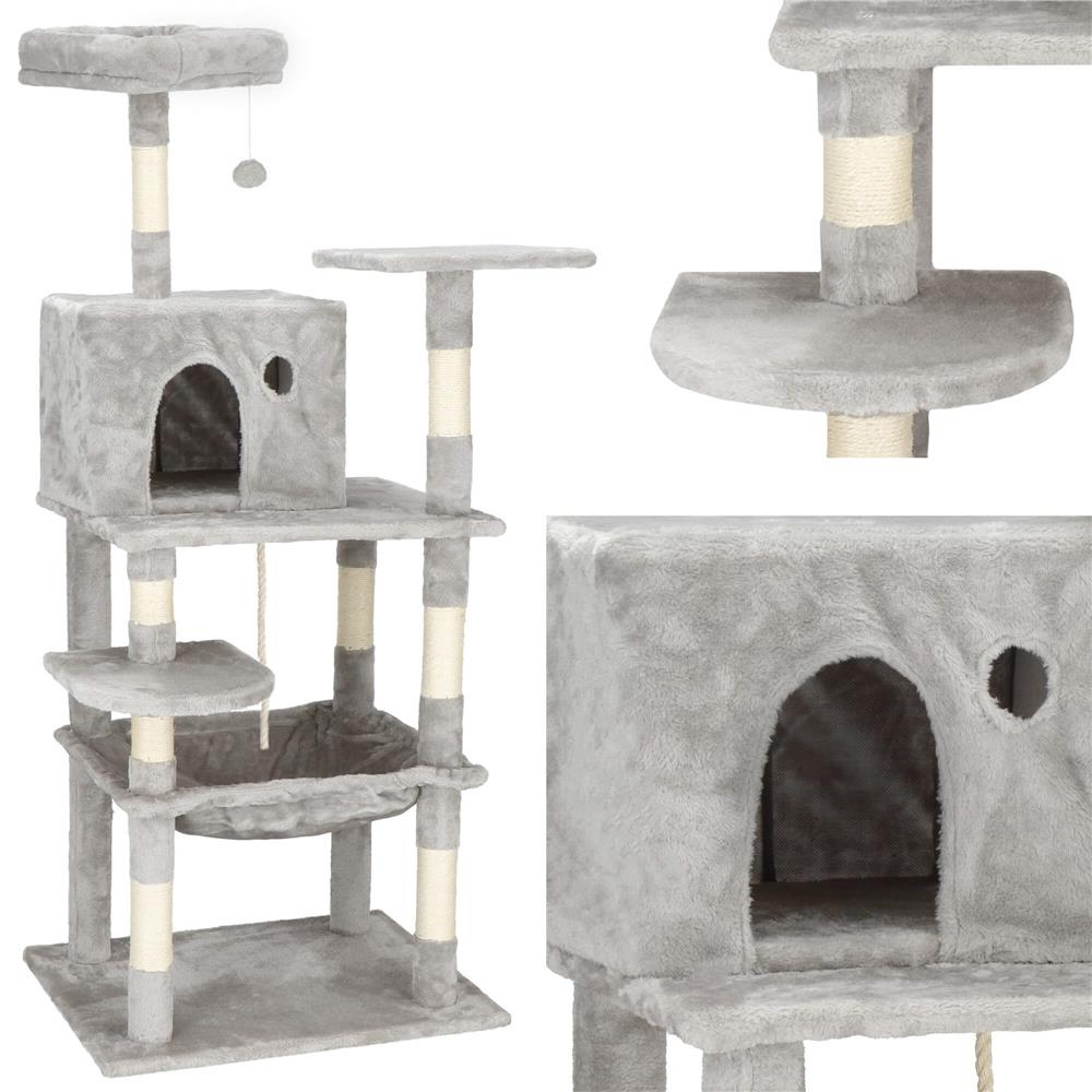 Culoare: bej / gri  	 Numar de niveluri: 7  	 Produs care trebuie asamblat de catre dumneavoastra conform instructiunilor incluse  	 Dimensiuni:  	 Dimensiunile bazei: 60 x 50 x 1,5 cm ( lungime x latime x grosime)  	 Inaltime totala: 145 cm  	 Vizuina de jos: 53 x 42 x 0,6 cm ( lungime x latime x grosime)  	 Platforma  1 : 32 x 25,5 x 1,5 cm ( lungime x latime x grosime)  	 Platforma 2 : 55 x 45 x 1,5 cm (lungime x latime x grosime)  	 Casa: 36 x 31 x 29 cm (lungime x latime x inaltime)  	 Platforma 3 : 30 x 30 x 1,5 cm (lungime x latime x grosime)  	 Vizuina de sus: 20 x 28 x  	 Inaltimea marginii patului: 9 cm  	 Grosimea marginii patului: 6 cm  	 Diametrul tuburilor de constructie: 4 x 4,5 cm, 11 x 5,5 cm  	 Aranjament:  	 Inaltimea de la baza la patul de jos: 40 cm  	 Inaltimea de la zona de culcare inferioara pana la platforma 1: 19 cm  	 Inaltimea de la platforma 1 la platforma 2: 18,5 cm  	 Inaltimea de la platforma 2 la platforma 3: 37 cm  	 Inaltimea de la platforma 3 pana la patul de sus: 34 cm  	 Inaltimea de la partea superioara a casei pana la patul de sus: 43 cm  	 Inaltimea de la platforma 2 pana la patul de sus: 70 cm  	 Inaltimea de la baza la platforma 1: 55 cm  	 Informatii suplimentare:  	 Snur atasat la platforma 2  	 Dimensiunile snurului: 42 x 1 cm (lungime x grosime)  	 Jucarie cu sfoara elastica atasata la patul de sus  	 Lungimea snurului: 13 - 28 cm (min. - max.)  	 Grosimea jucariei: 4,5 cm  Vrei ca pisica ta sa se distreze la nesfarsit intr-un loc placut si relaxant? Aceasta este implinirea celor mai profunde vise atat ale proprietarilor, cat si ale animalelor lor de companie – un stalp de zgarieturi pe mai multe niveluri!  	  Stabilitate:  stalpul este proiectat pentru o stabilitate neclintita. Pisica ta poate sa se catere, sa sara si sa se zgarie fara griji.  	  Design pe mai multe niveluri pentru joc optim:  locul de joaca ofera nu doar unul, ci mai multe niveluri de explorat. Pisica ta poate urca pe varfuri si cobori in adancuri, descoperind noi perspective de joaca si relaxare.  	  Placut la atingere:  realizat dintr-un material exceptional de placut la atingere, stalpul de zgariere ofera labei pisicii sensibilitatea si confortul de care are nevoie.  	  Durabilitate:  realizat din material durabil, va rezista nu numai la zgarieturile de zi cu zi, ci si la multe luni de utilizare intensiva, asigurand durabilitate ani de zile.  	  Distractie si bucurie:  Cu o varietate de niveluri si locuri ascunse de explorat, pisica ta va gasi o multime de moduri de a petrece timp activ si distractiv.  	  Materiale naturale,   sigure pentru pisici:  sfoara din jurul stalpilor este fabricata din sisal, o fibra tare si foarte durabila.   Acesta este cu siguranta momentul potrivit pentru a oferi pisicii tale iubite un loc ideal de dezvoltare, joaca si odihna. Locul nostru de joaca nu este doar o piesa de mobilier, este o oaza de placere pentru animalul tau de companie.