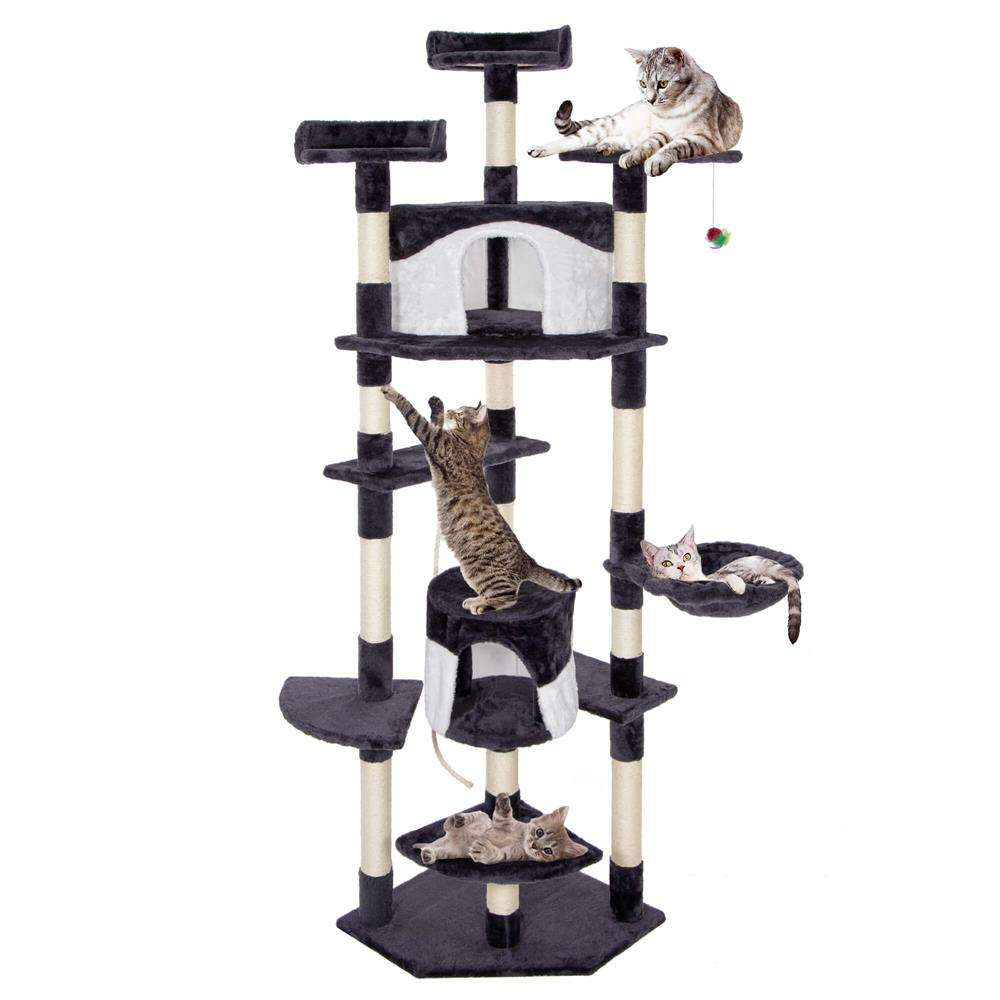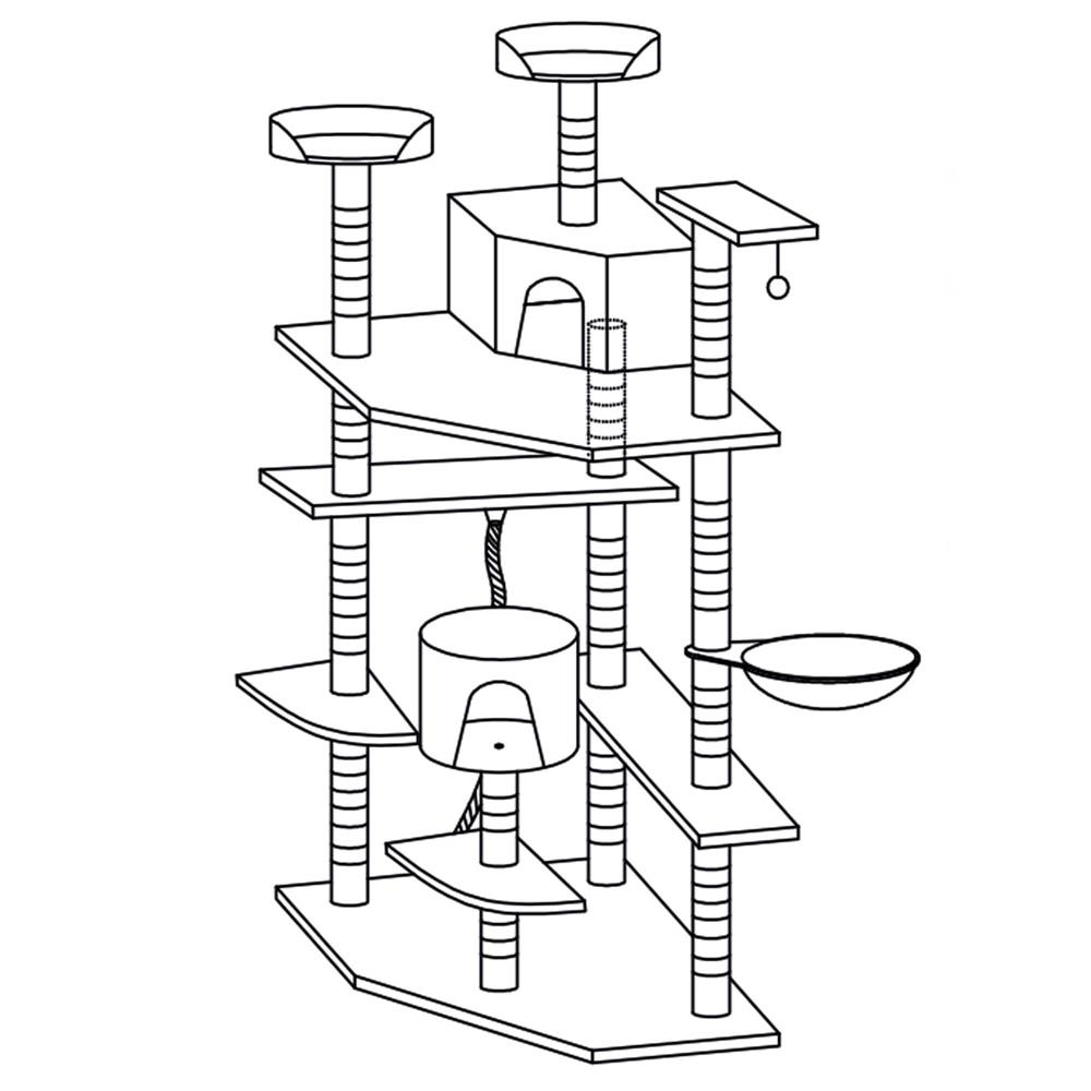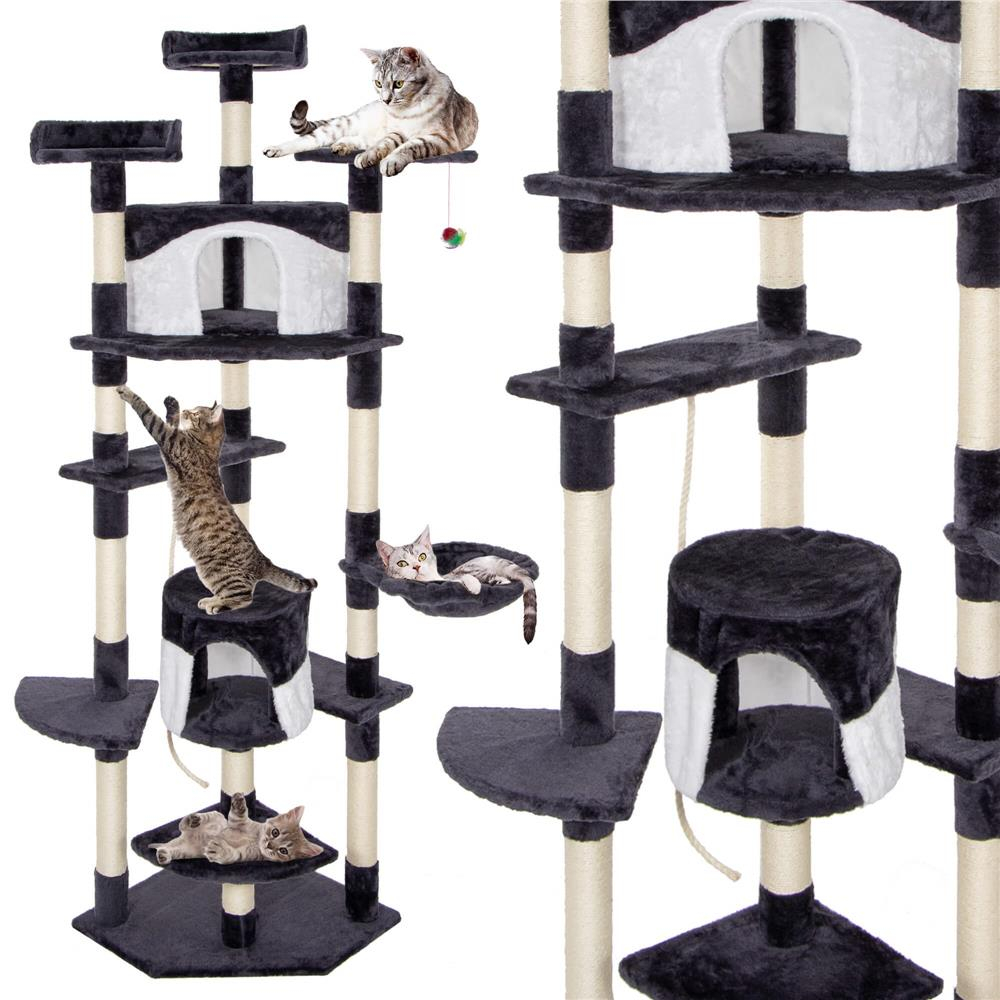 Culoare: crem / gri inchis / alb  	 Numar de niveluri: 11  	 Produs care trebuie asamblat de catre dumneavoastra conform instructiunilor incluse  	  Dimensiuni:   	 Baza de zgariere: 50 x 50 x 1,5 cm (lungime x latime x grosime)  	 Inaltime totala: 203 cm  	 Dimensiunea unei platforme: 30 x 30 x 30 x 1,5 cm (lungime x latime x grosime)  	 Dimensiunea platformei 2: 50 x 19,5 x 19,5 x 1,5 cm (lungime x latime x grosime)  	 Dimensiunea platformei 3: 30 x 30 x 30 x 1,5 cm (lungime x latime x grosime)  	 Dimensiunea casei: 30 x 28,5 cm (diametru x inaltime)  	 Dimensiunea barlogului: 32 x 9 cm (diametru x inaltime)  	 Dimensiunea platformei 4: 50 x 19,5 x 1,5 cm (lungime x latime x grosime)  	 Dimensiunea platformei 5 : 50 x 50 x 50 x 1,5 cm (lungime x latime x grosime)  	 Dimensiunea casei 2: 35 x 35 x 28,5 cm (lungime x latime x inaltime)  	 Dimensiunea platformei 6: 30 x 24,5 x 1,5 cm (lungime x latime x grosime)  	 Dimensiunea platformei 7: 28,5 cm x 1,5 cm (diametru x grosime)  	 Dimensiunea platformei 8: 29 cm x 1,5 cm (diametru x grosime)  	 Jucarie suspendata: 14 - 27 cm x 4,3 cm (lungimea snurului   x diametru)  	 Diametrul tuburilor de constructie: 12 x 6,5 cm  	  Aranjament:    	 Inaltimea de la baza la platforma 1 : 24,5 cm  	 Inaltimea de la platforma 1 pana la casa: 24 cm  	 Inaltimea de la baza pana la a 3-a platforma: 49,5 cm  	 Inaltimea de la baza pana la pat: 80 cm  	 Inaltimea de la pat pana la a 4-a platforma: 20 cm  	 Inaltimea de la a 4-a platforma la a 5-a platforma: 28 cm  	 Inaltimea de la a 5-a platforma la a 6-a platforma: cm 28 cm  	 Inaltimea de la a 6-a platforma la a 7-a platforma: 39 cm  	 Inaltimea de la partea superioara a casei pana la platforma 8: 35 cm  Vrei ca pisica ta sa se distreze la nesfarsit intr-un loc placut unde si relaxant? Aceasta este implinirea celor mai profunde vise atat ale proprietarilor, cat si ale animalelor lor de companie – un stalp de zgarieturi pe mai multe niveluri!  	  Stabilitate:  stalpul este proiectat pentru o stabilitate neclintita. Pisica ta poate sa se catere, sa sara si sa se zgarie fara griji.  	  Design pe mai multe niveluri pentru joc optim:  locul de joaca ofera nu doar unul, ci mai multe niveluri de explorat. Pisica ta poate urca pe varfuri si cobori in adancuri, descoperind noi perspective de joaca si relaxare.  	  Placut la atingere:  realizat dintr-un material exceptional de placut la atingere, stalpul de zgariere ofera labei pisicii sensibilitatea si confortul de care are nevoie.  	  Durabilitate:  realizat din material durabil, va rezista nu numai la zgarieturile de zi cu zi, ci si la multe luni de utilizare intensiva, asigurand durabilitate ani de zile.  	  Distractie si bucurie:  Cu o varietate de niveluri si locuri ascunse de explorat, pisica ta va gasi o multime de moduri de a petrece timp activ si distractiv.  	  Materiale naturale,   sigure pentru pisici:  sfoara din jurul stalpilor este fabricata din sisal, o fibra tare si foarte durabila.   Acesta este cu siguranta momentul potrivit pentru a oferi pisicii tale iubite un loc ideal de dezvoltare, joaca si odihna. Locul nostru de joaca nu este doar o piesa de mobilier, este o oaza de placere pentru animalul tau de companie. Nu mai astepta – ofera pisicii tale un cadou care ii va ridica calitatea vietii la un nivel complet nou!