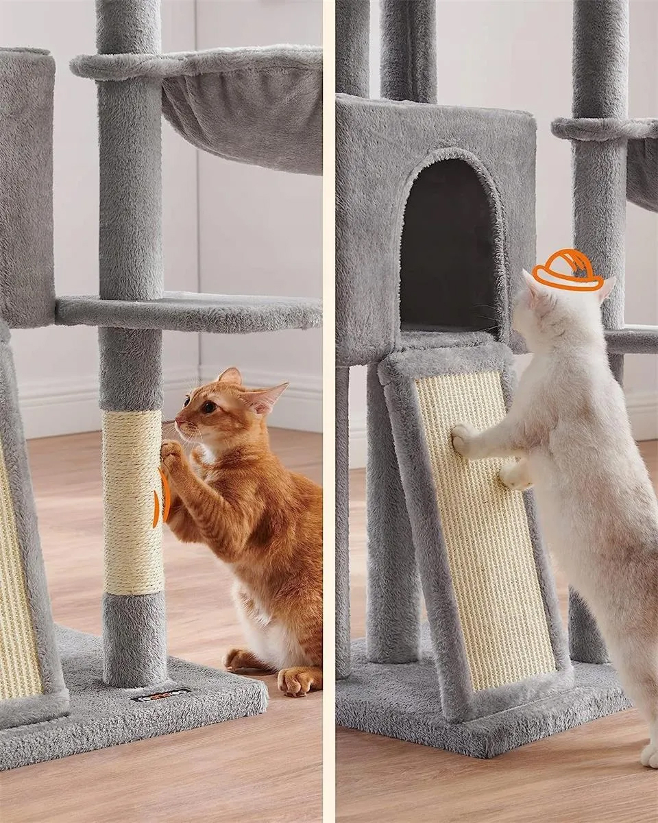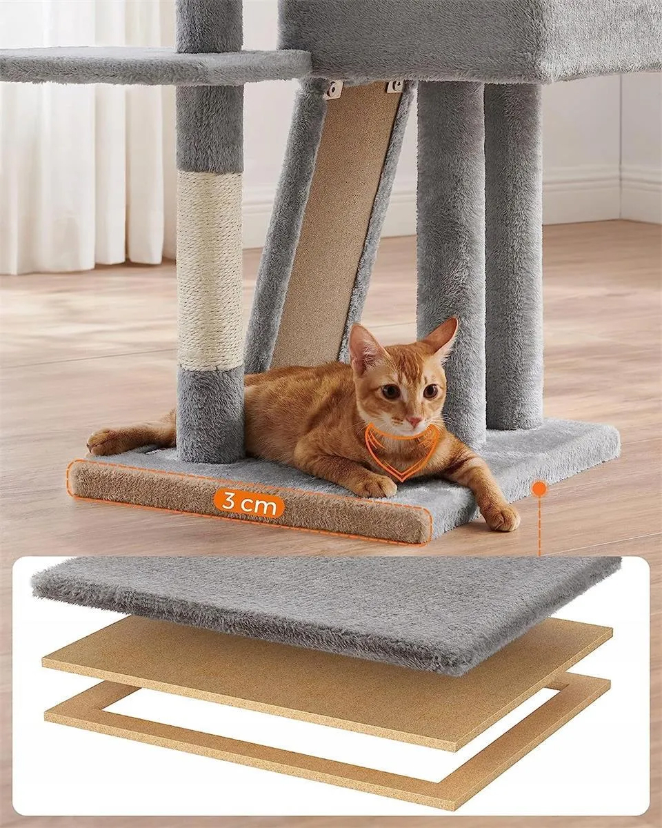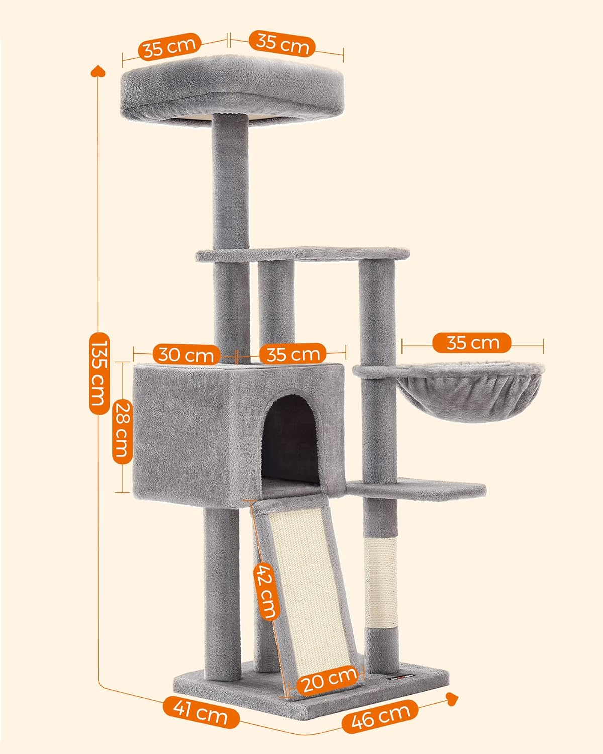 Specificatii tehnice Brand: FEANDREA Model: PCT132W01 Material: PAL, plus, sisal Culoare: Gri deschis Dimensiuni: 46 x 41 x 135 cm Numar niveluri: 4 Greutate maxima suportata: 3 pisici (max. 7 kg fiecare) Montaj: pe podea Caracteristici speciale: husa detasabila si lavabila pentru perna superioara, baza ranforsata, kit anti-rasturnare inclus Scurta descriere Locul de joaca pentru pisici FEANDREA pe 4 niveluri este conceput pentru joaca, odihna si catarat. Cu stalpi de sisal, cos pufos, vizuina confortabila si perna superioara cu husa detasabila, ofera un spatiu complet pentru activitatile zilnice ale pisicii. Stabilitatea este garantata de baza ranforsata si kitul anti-rasturnare. Caracteristici principale Constructie solida din PAL cu baza ranforsata pentru stabilitate 4 niveluri pentru joaca, catarat si relaxare Perna superioara cu husa detasabila si lavabila Cos, vizuina si placa de zgariat incluse Stalpi din sisal pentru ascutirea gherutelor Acoperire moale din plus pentru confort maxim