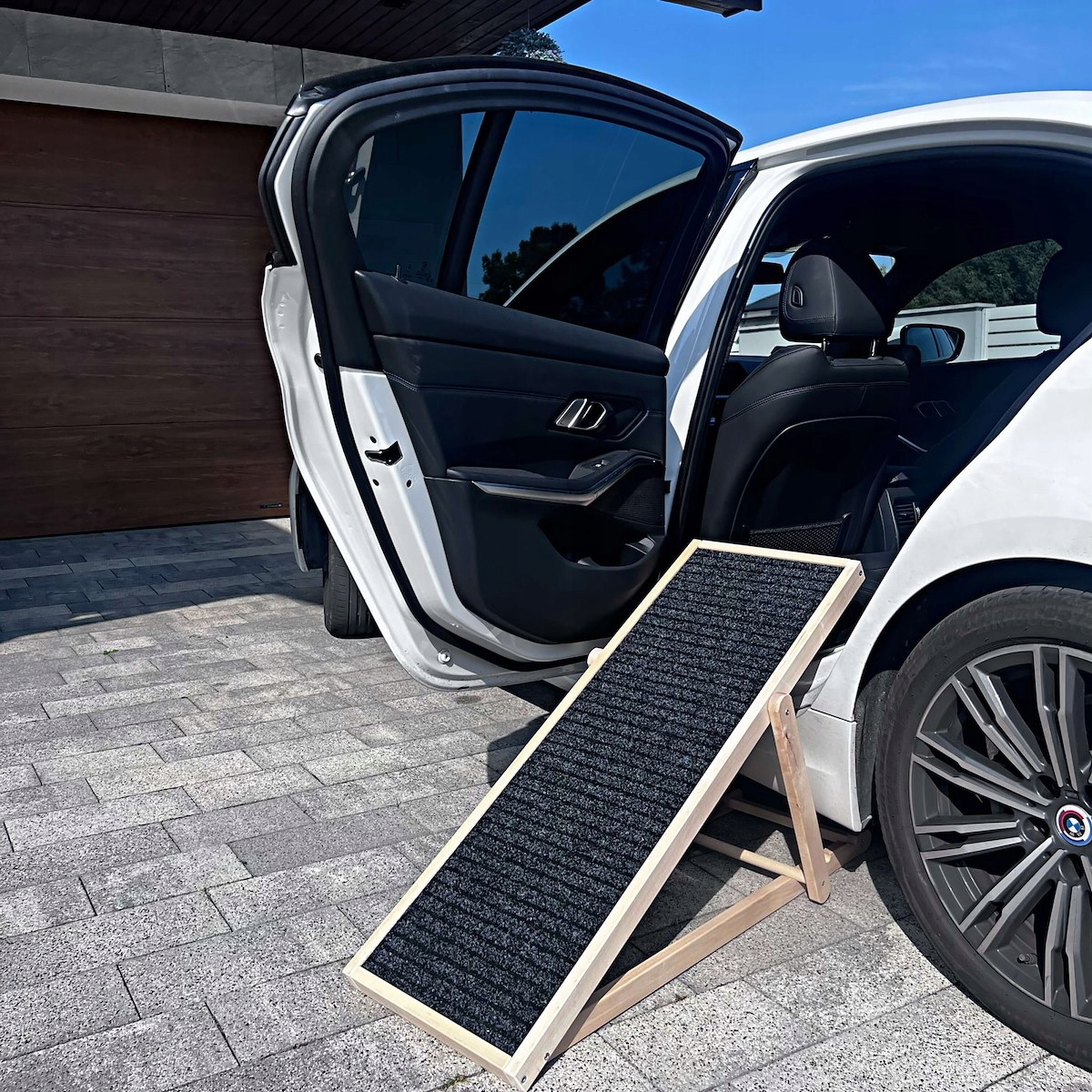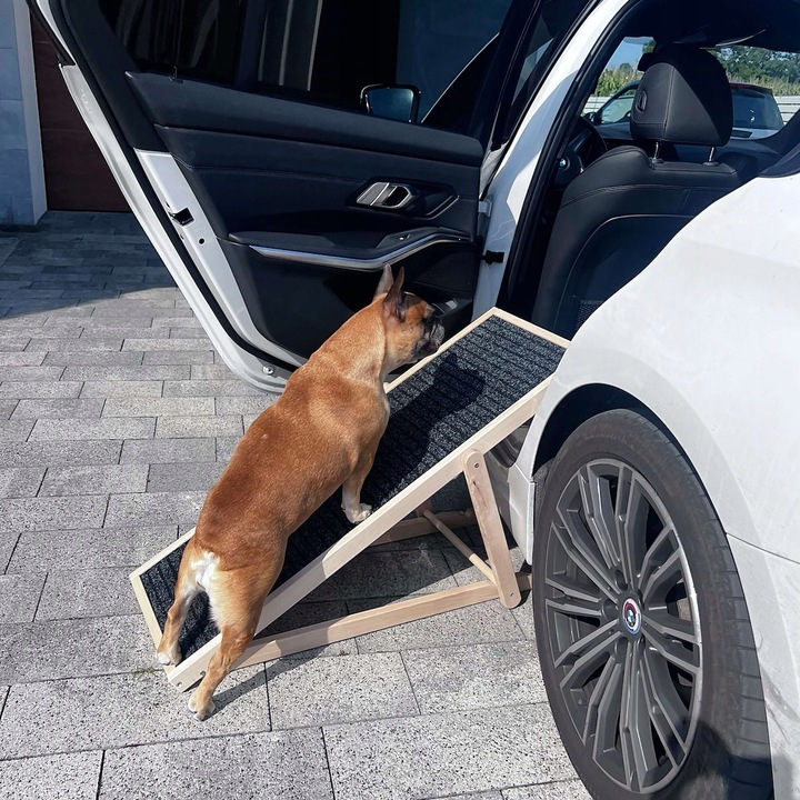 PARAMETRI:   	 Culoare: bej deschis, negru  	 Material: lemn de fag  	 Capacitate maxima de incarcare: 60 kg  	  Dimensiuni:   	 Lungime totala: 103 cm  	 Latime totala: 35,5 cm  	 Inaltimea primului nivel: 59 cm  	 Inaltimea celui de-al doilea nivel: 52,5 cm  	 Inaltimea celui de-al treilea nivel: 42,5 cm  	 Inaltime plat: 6 cm  	 Grosimea marginii rampei: 4,3 cm  	  Dimensiunile materialului:   	 Lungime: aprox. 99 cm  	 Latime: aprox. 31,5 cm  	  Informatii suplimentare:   	 Inaltimea rampei reglabila - trei niveluri  	 Partea inferioara a rampei - lemn   Cainele tau iubit merita cel mai inalt nivel de confort si siguranta. Rampa noastra este o solutie care va transforma viata de zi cu zi a animalului dvs. de companie. Indiferent de varsta sau de marimea cainelui dumneavoastra, scara noastra reglabila ii va permite cainelui dumneavoastra sa urce si sa coboare cu usurinta din masina, din pat sau de pe scari.   	 Inaltime reglabila pe 3 trepte  	 Covor antiderapant pentru siguranta  	 Design extrem de usor pentru transport si depozitare usoara  	 Design solid - fabricat din lemn durabil  	 Incurajeaza independenta animalului dvs. de companie  	 Ideal pentru caini batrani si tineri   Rampa noastra permite cainelui dvs. sa traverseze obstacolele cu usurinta, evitand sariturile sau caderile care pot duce la ranire. Este un instrument care imbunatateste calitatea vietii animalului dvs. de companie, oferindu-i acces la locuri in care nu putea ajunge inainte.