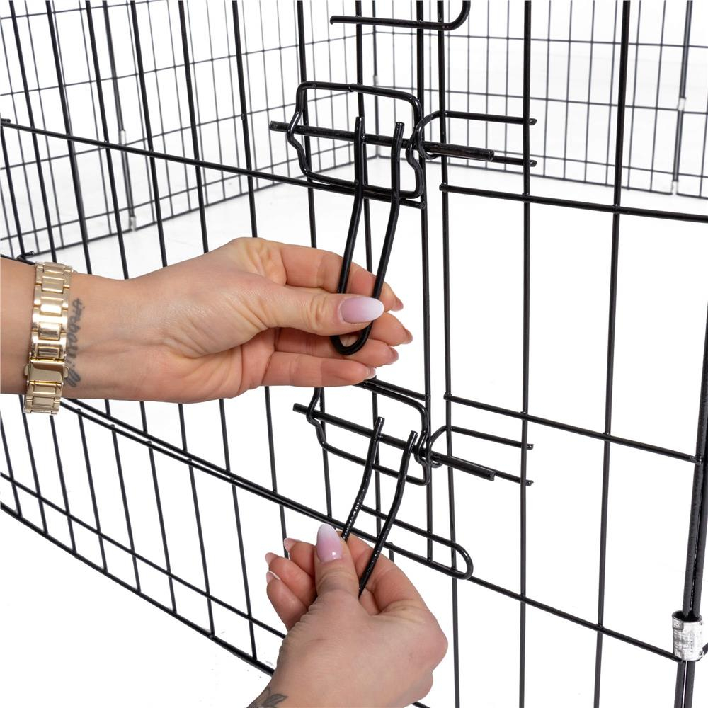 PARAMETRI:   	 Culoare: negru   	 Material: metal  	 Numar de usi: 1  	 Numar de pereti: 8  	 Dimensiunile custii:  	 Diametru: aprox. 155 cm  	 Inaltime: 61 cm  	 Alte dimensiuni:  	 Dimensiuni ale peretelui unic: 76 x 61 cm (latime x lungime)  	 Dimensiuni ale deschiderii: 35 x 40 cm (latime x lungime)  	 Dimensiuni cand este pliata aproximativ: 76 x 61 x 10 cm (latime x lungime x grosime)  	 Grosimea tubului individual: 3 mm  	 Distanta dintre tuburi: 3,7 cm  	 Lungimea tubului de conectare: 54 cm   Tarcul este o solutie ideala pentru proprietarii de animale de companie. Tarcul are multe intrebuintari: il putem folosi pentru a dresa un animal de companie, poate fi un adapost sigur pentru un animalut sau poate fi folosit ca loc de joaca. Prin utilizarea tarcului, reducem la minimum riscul de ranire in timp ce suntem plecati de acasa si putem fi siguri ca animalul de companie nu ne va rasturna mobila sau nu va distruge obiectele preferate.  Daca animalul dvs. de companie a avut un accident sau s-a imbolnavit si se afla in convalescenta, cusca va fi un suport excelent pentru recuperare. In plus, daca este nevoie, cusca restrictioneaza miscarile animalului, astfel incat acesta sa se poata recupera in liniste. Asezati patul preferat al animalului dvs. de companie in cusca si creati un loc in care acesta sa se calmeze si sa aiba liniste.   	  Durabil si solid  	  Rapid de asamblat si demontat  	  Se pliaza pana la dimensiuni reduse  	  Usa pentru acces usor la animalul dvs. de companie  	  Ofera confort si siguranta pentru animalul dumneavoastra de companie  	  Produs perfect pentru vacante - animalul dvs. de companie se va orienta mai usor  	  Ajuta la rezolvarea problemelor de comportament ale cainilor   Cusca are un sistem intuitiv de pliere si desfasurare. Cand este pliata, ocupa foarte putin spatiu si incape cu usurinta in portbagajul masinii dvs. Este ideala pentru vacante si calatorii. Are o constructie stabila si solida in care poti avea incredere. Barele metalice sunt de grosimea corespunzatoare iar lipsa marginilor ascutite asigura siguranta animalului tau de companie si a suprafetei pe care este asezata cusca.