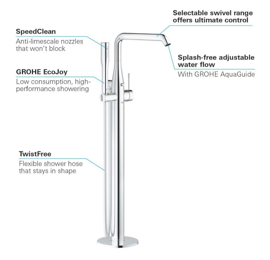 Această baterie de cadă cu montare pe podea este partenerul ideal pentru cada cu montare independentă pe podea. Cu designul cilindric specific gamei GROHE Essence, această baterie de cadă beneficiază de finisajul cromat GROHE StarLight. Face parte dintr-un set care mai cuprinde un suport de perete pentru para de duș, para de duș GROHE Euphoria Cosmopolitan Stick (27400000) și furtunul de duș GROHE Silverflex 1250 mm (28362000).