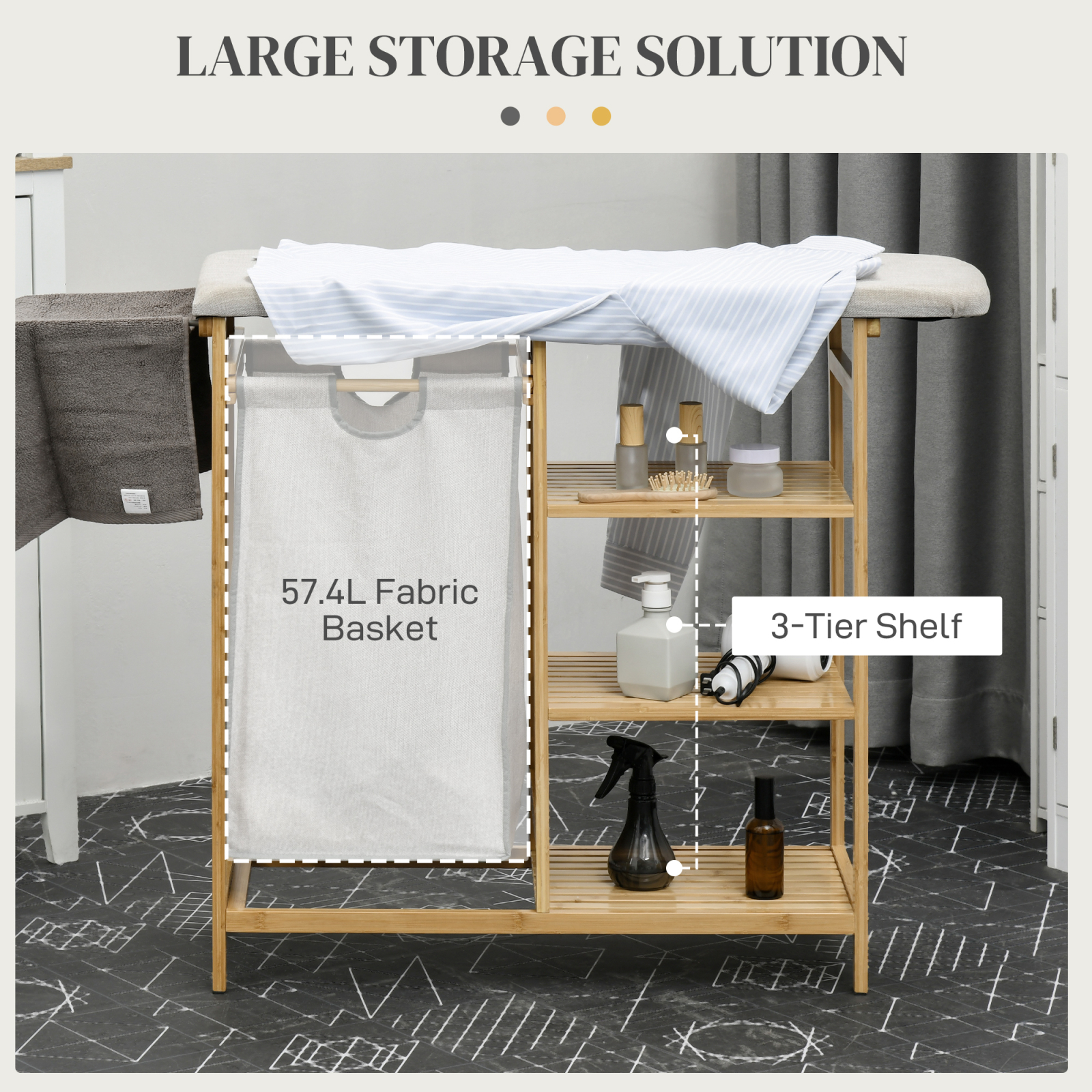 Transforma-ti zilele de spalat rufe cu cosul de rufe din bambus [BRAND NAME] - o solutie sic care imbina stilul si functionalitatea! Dispunand de un cos din material textil de 57,4 L, acest cos de rufe va organizeaza fara efort incarcaturile. Raftul cu 3 niveluri adauga spatiu de depozitare pentru articolele de toaleta, in timp ce placa superioara cu suport de fier usureaza sarcina de calcat. Fabricat cu un cadru din bambus vopsit, este un plus elegant pentru orice dormitor, baie sau zona de spalatorie.