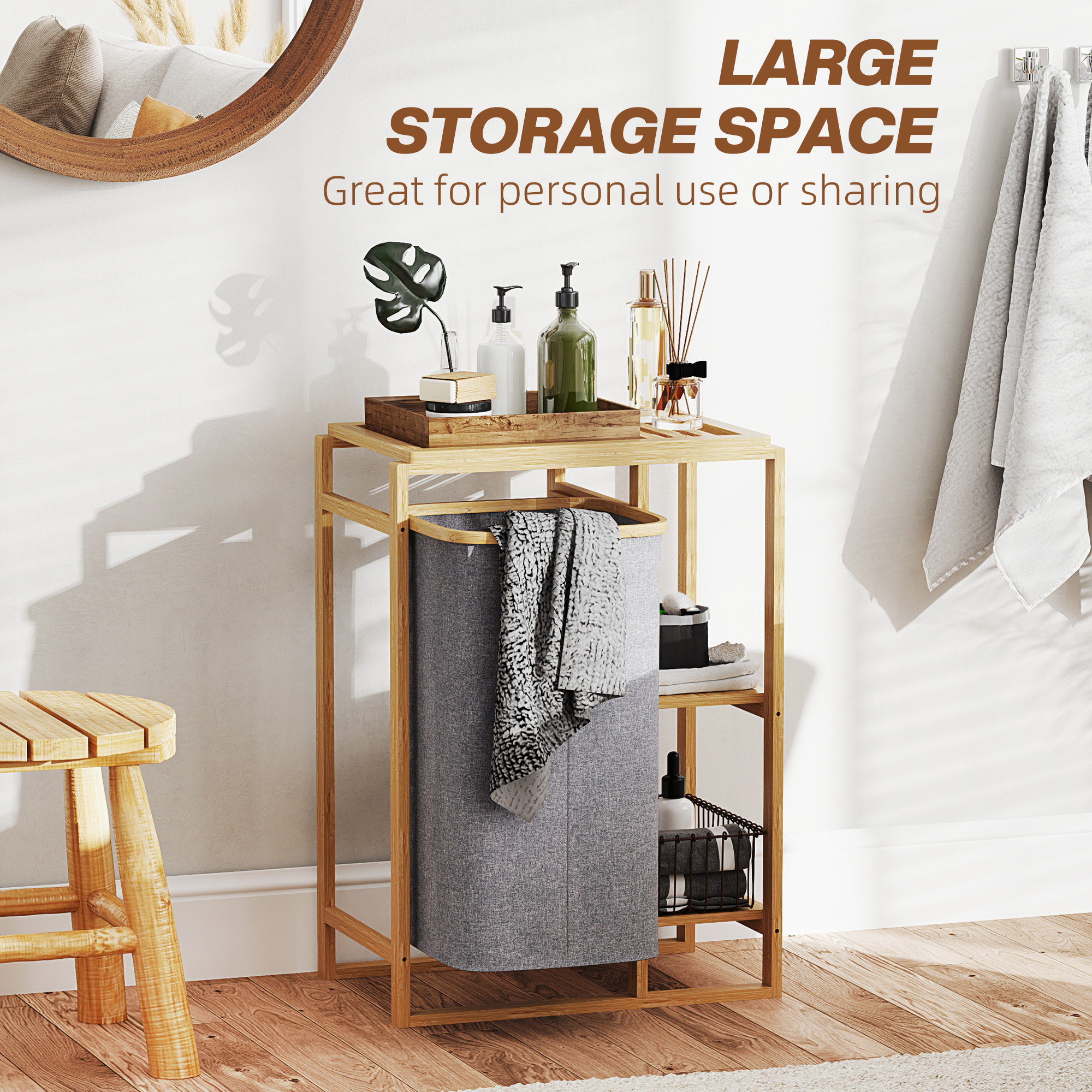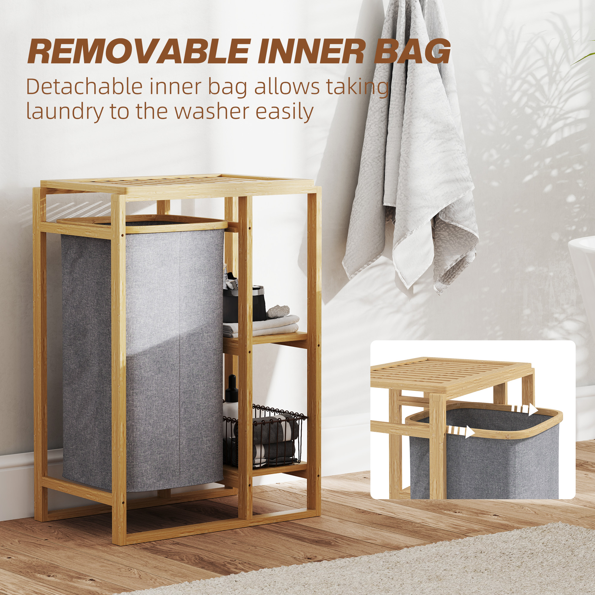 Organizeaza eficient rufele cu cosul portabil [BRAND NAME], prevazut cu cadru din bambus si sac textil detasabil. Dimensiunea compacta (50x32x70 cm) si rafturile integrate il fac perfect pentru baie sau dormitor. Usor de transportat si elegant, combina stilul natural cu functionalitatea. Ideal pentru mentinerea ordinii in spatii reduse.