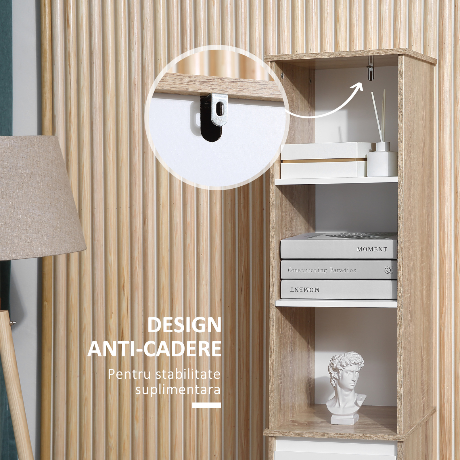 Maximizeaza spatiul si reduce dezordinea cu acest dulap pentru baie [BRAND NAME]. Proiectat pentru a exploata la maxim fiecare colt, are o structura ingusta care se dezvolta pe vertical si este alcatuit din 3 etajere, un dulap si un sertar. Intregul obiect de mobilier este fabricat din panouri PAL si, datorita stilului minimalist si discret, se integreaza perfect cu orice tip de obiect de mobilier: chiar si cu al tau!