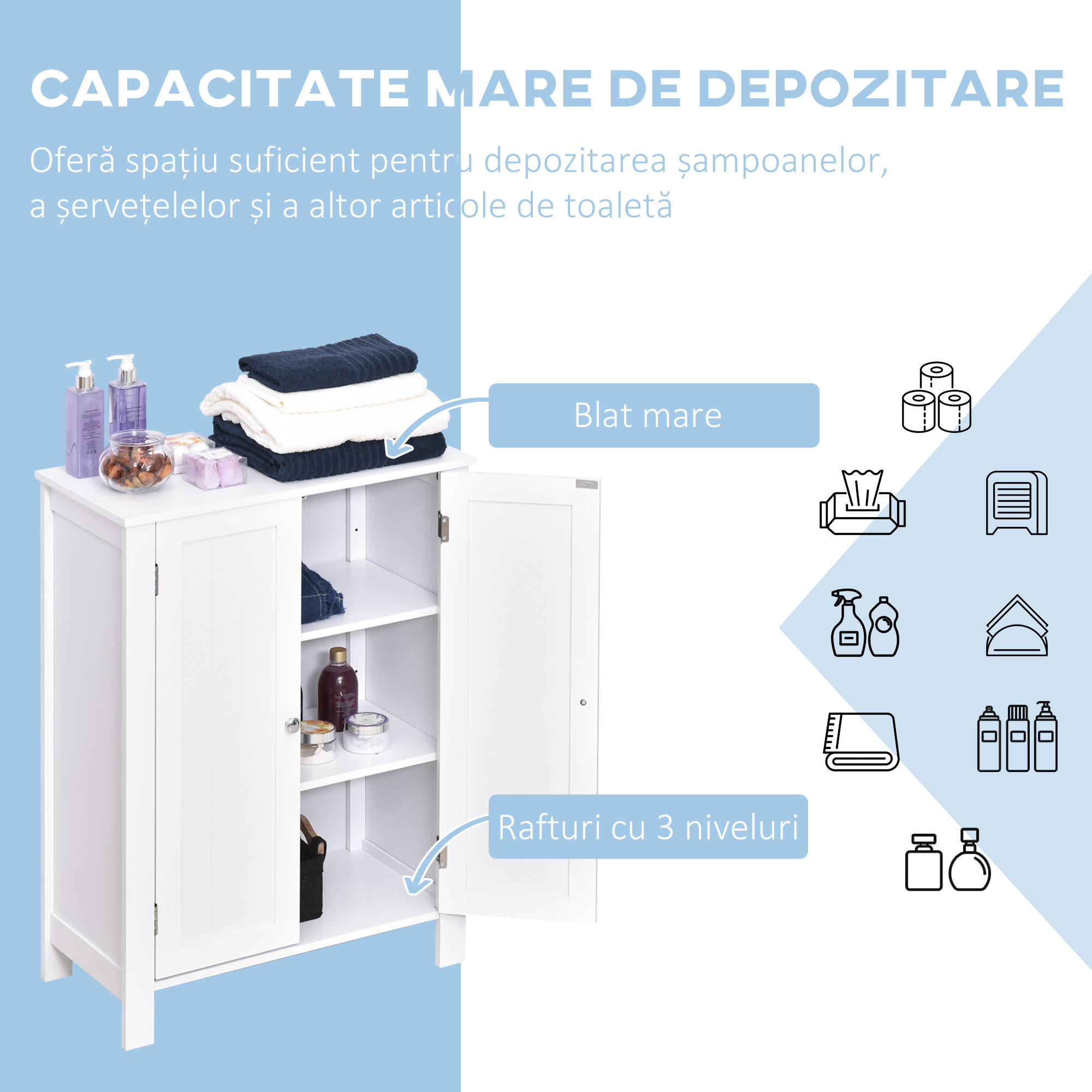 in baie ai cu siguranta nevoie de diverse spatii de depozitare pentru ca sunt destul de multe lucruri care iti sunt necesare pentru rutina de ingrijire din fiecare zi. Motiv pentru care [BRAND NAME] dulap baie, cu doua usi, 60x30x80 cm, alb poate fi varianta ideala pentru tine. Are dimensiuni reduse, ceea ce il face potrivit si pentru baile de dimensiuni reduse. Are culoarea alba si un design simplu ceea ce inseamna ca este potrivit pentru diverse stiluri de amenajari interioare. [BRAND NAME] dulap baie, cu doua usi, 60x30x80 cm, alb dispune de doua rafturi pe care poti aseza lucrurile de care ai nevoie. Acestea pot fi asezate la inaltimea dorita astfel incat sa ai locul ideal pentru toate obiectele necesare. Este realizat din MDF si finisat cu vopsea alba care il face mai rezistent la mediile umede, deci poate fi asezat fara griji in baie. Va rezista in aceleasi conditii timp indelungat.