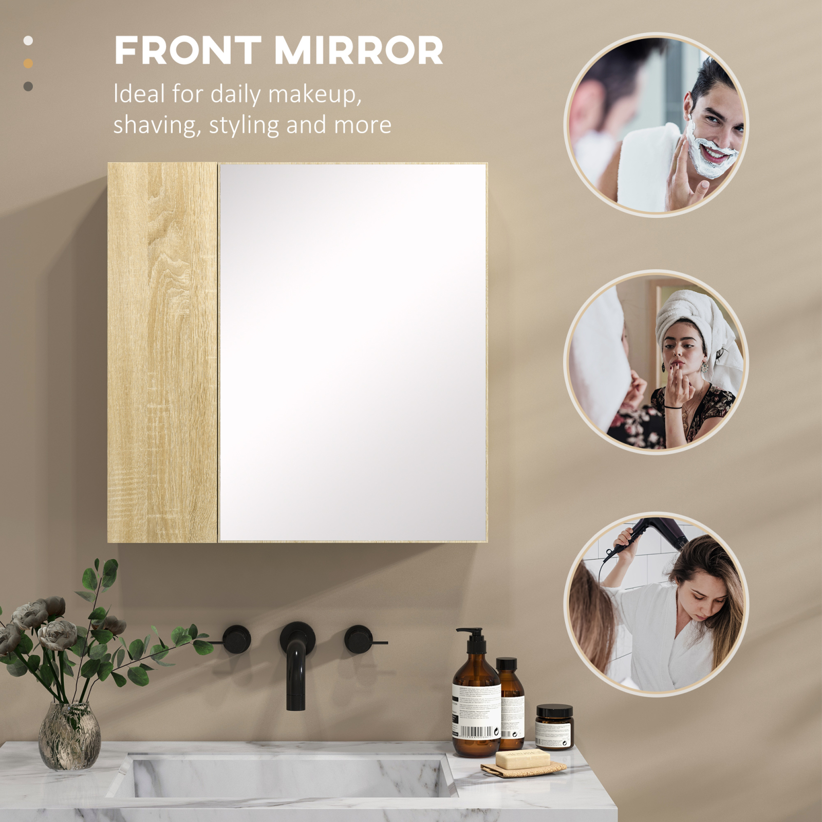 Depozitati toate articolele esentiale pentru baie, pastrandu-va cosmeticele necesare - faceti acest lucru cu dulapul pentru baie cu oglinda [BRAND NAME]. Acest dulap consta din 4 rafturi incorporate de diferite marimi, care reprezinta un plus in pastrarea articolelor bine organizate. Prevazut cu usi duble pentru a pastra totul protejat. Oglinda va ajuta sa va pregatiti in baie oricand aveti nevoire. Bucurati-va de acest dulap pentru baie functional cu oglinda!