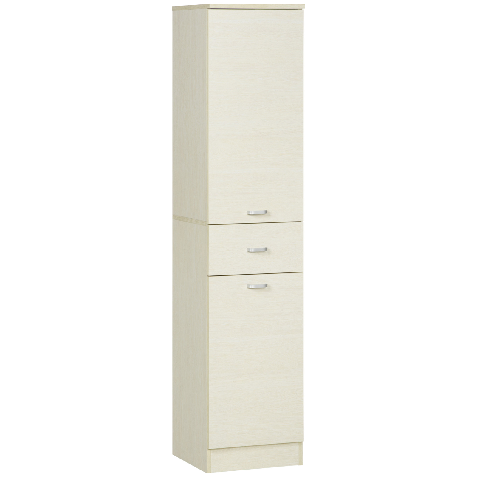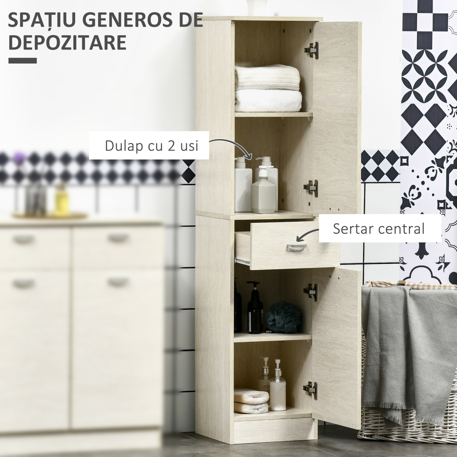 Mobilier compact si orientat spre eficienta: acest dulap de baie [BRAND NAME] ofera doua dulapioare opace, un sertar central si o polita reglabila pentru depozitare flexibila. Finisajul in lemn cald se potriveste perfect intr-o zona mica sau intr-un spatiu auxiliar. Usor de accesat si organizat, combina spatiul eficient cu un aspect estetic modern.