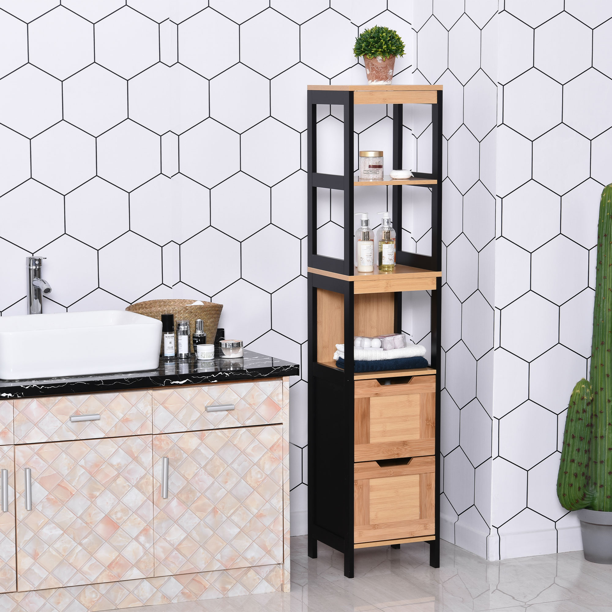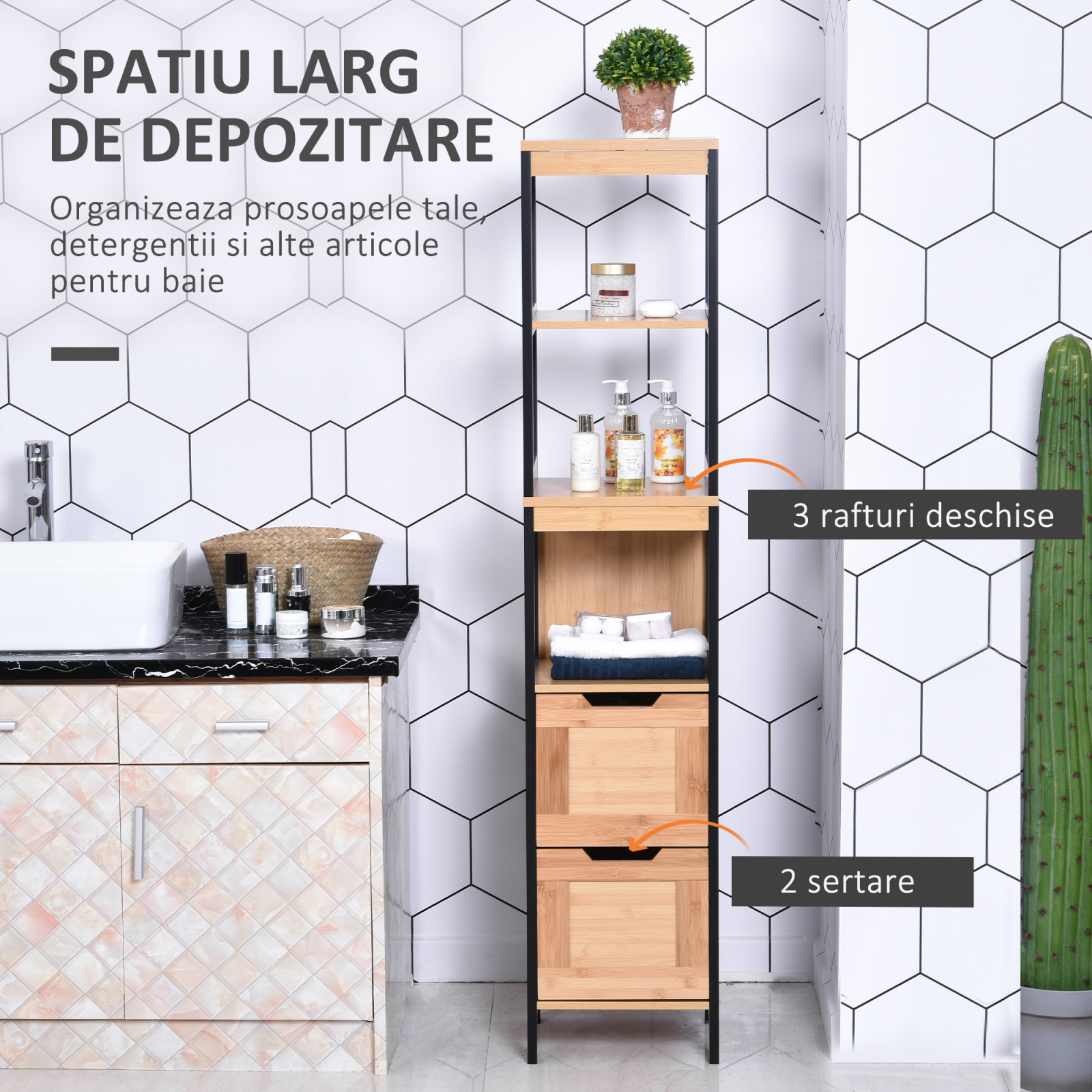 Daca in baia dumneavoastra aveti nevoie de spatiu suplimentar pentru depozitarea produselor dumneavoastra, alegeti acest dulap de baie [BRAND NAME]. Alcatuit din 3 compartimente deschise si 2 sertare, va permite sa organizati mai bine obiectele dumneavoastra si sa optimizati spatiul. Structura robusta din lemn face dulapul stabil si datorita dispozitivului anti-rasturnare pentru fixarea pe perete ce face si mai sigura utilizare. Nu lasati sa va scape acest produs!