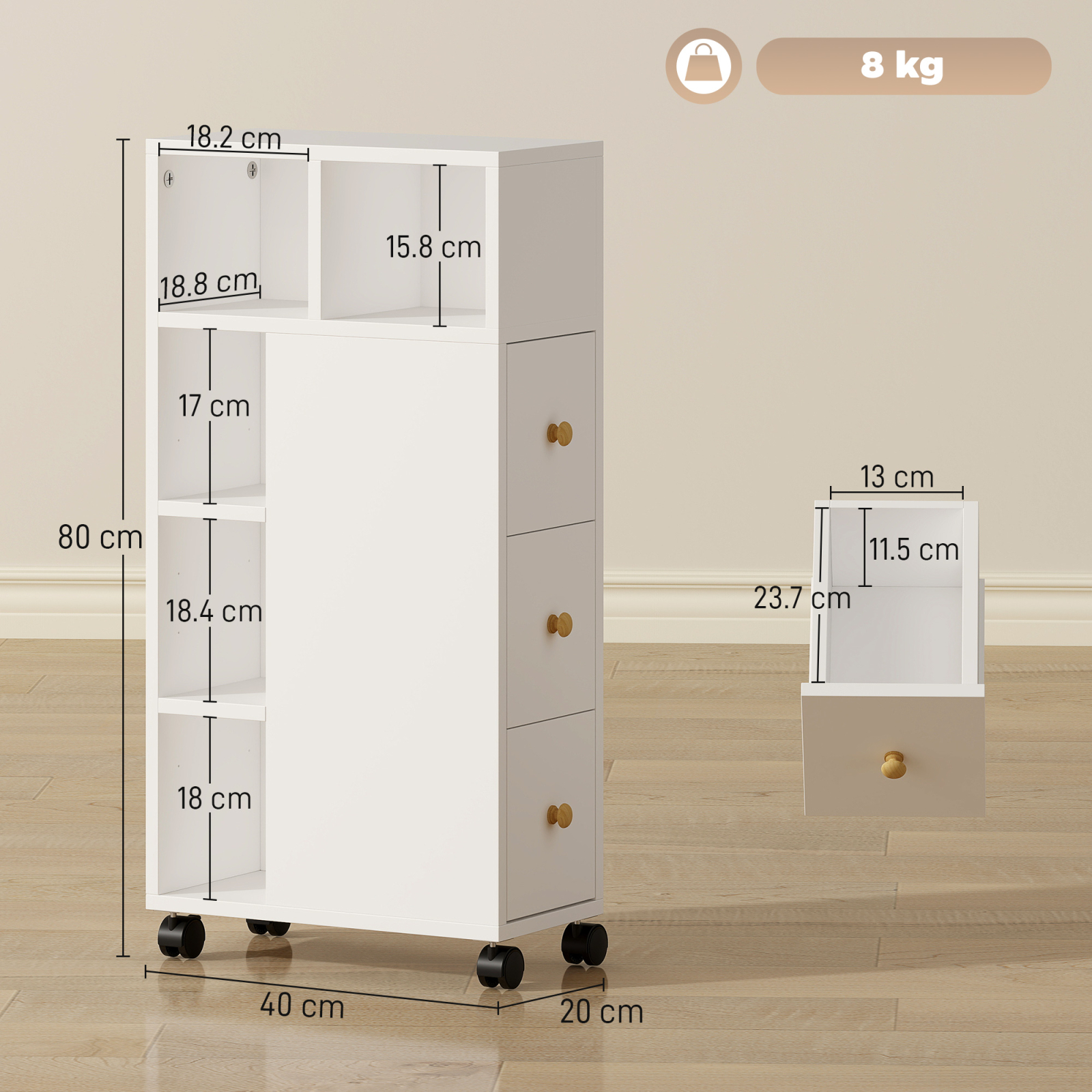Daca dezordinea domina in baia ta, alege dulapul de economisire a spatiului [BRAND NAME] si transforma spatiul neutilizat intr-un colt organizat. Cu 3 sertare practice si rafturi deschise reglabile pe mai multe niveluri, acest carucior de baie ofera tot spatiul de care ai nevoie pentru a mentine fiecare produs in ordine. Designul slim iti permite sa plasezi usor dulapul de baie chiar si in colturi stramte si sa-l muti agil cand trebuie sa cureti podeaua.