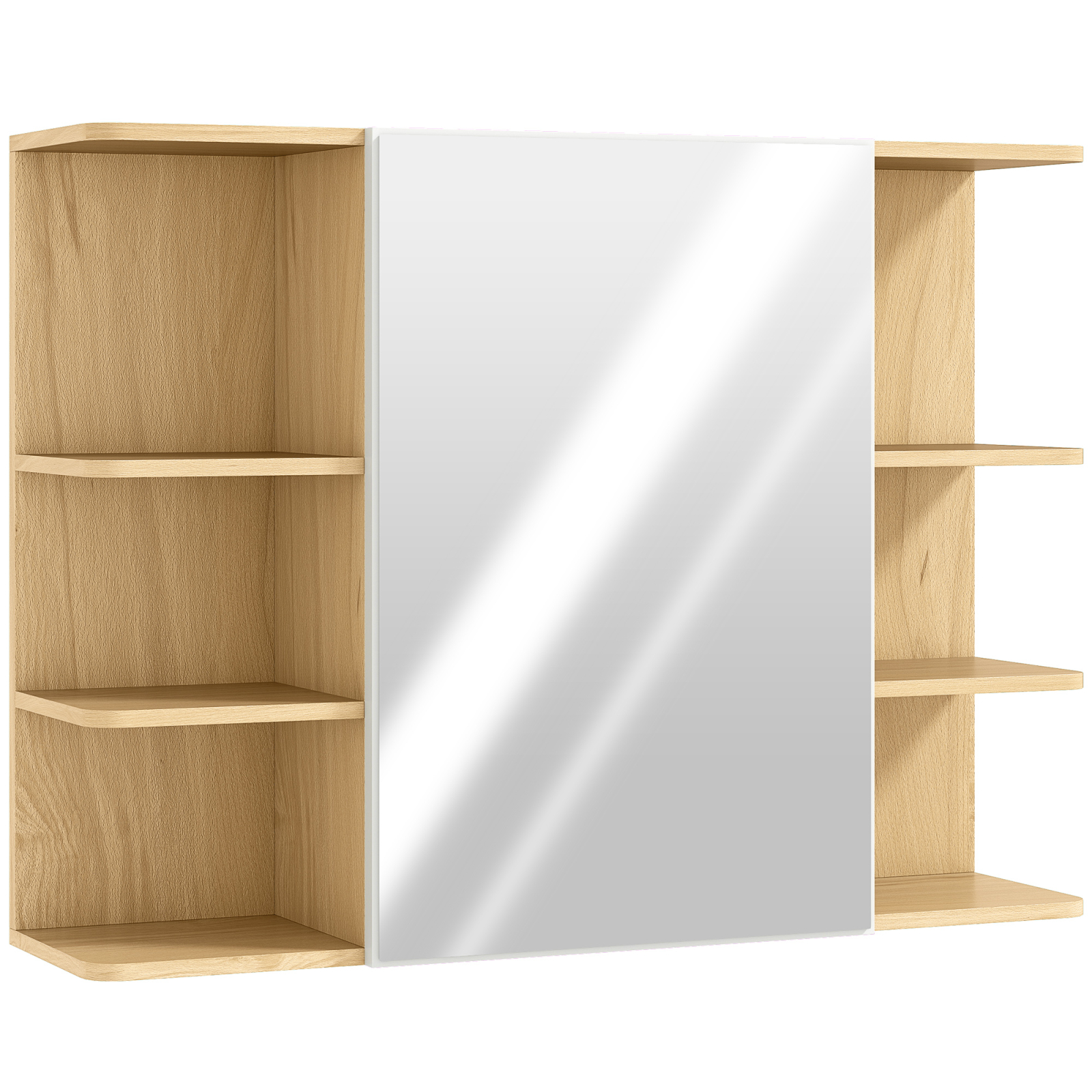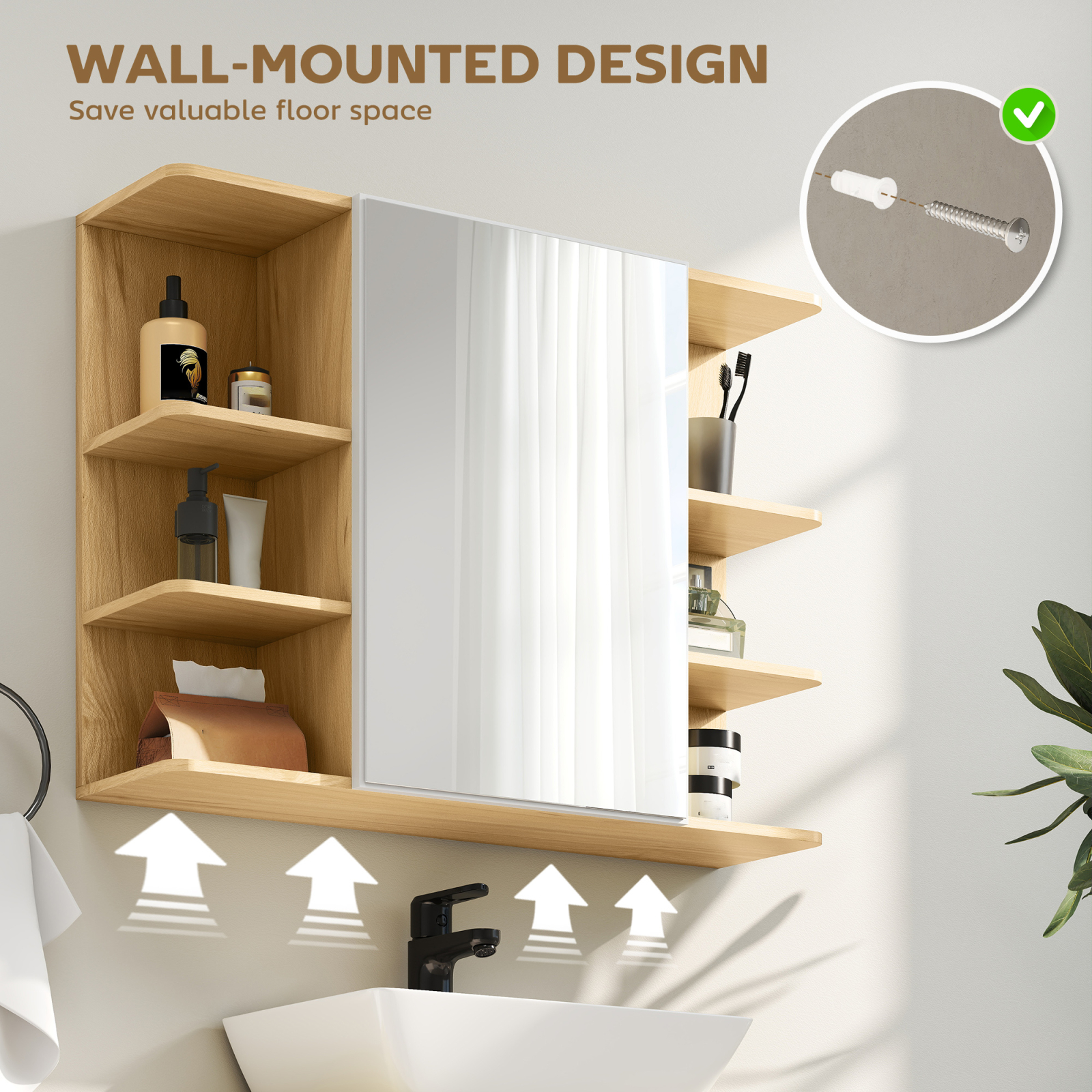 Transforma baia ta cu dulapul cu oglinda de la [BRAND NAME], elegant si functional. Oglinda centrala faciliteaza rutina zilnica, in timp ce un raft dublu ascuns in dulap pastreaza produsele tale. sase spatii deschise ofera acces rapid la accesorii si creme. Montat pe perete pentru a optimiza spatiul, acest dulap de baie este realizat din placi aglomerate cu finisaj din melamina, usor de curatat si perfect pentru a rezista utilizarii zilnice.