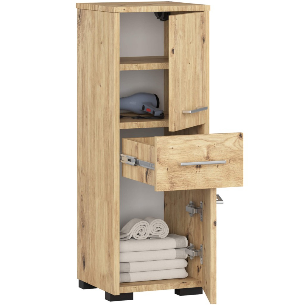 Etajera de baie FIN este realizata din PAL laminat Kronospan de 16 mm, rezistent la umezeala si zgarieturi. Marginile sunt protejate cu okleina ABS, un material durabil ce impiedica deteriorarea si prelungeste durata de viata a mobilierului. Designul compact ofera spatiu util pentru depozitare: doua compartimente inchise, un sertar central si rafturi interne pentru organizare eficienta. Poate fi folosita suspendata sau ca mobilier de podea, in functie de spatiul disponibil. Finisajul in nuanta calda de stejar artisan adauga eleganta si naturalete baii.