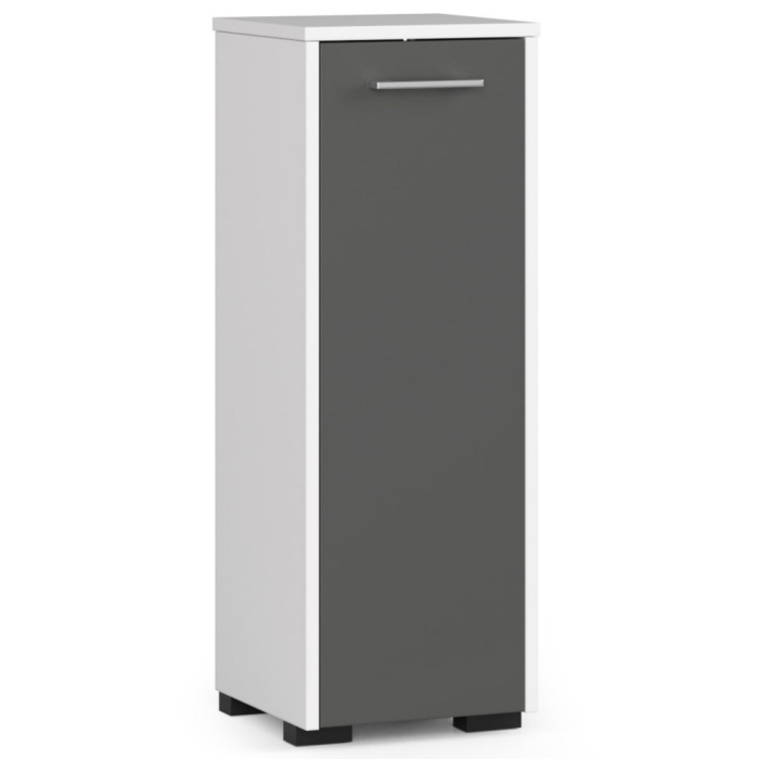 Acest dulap de baie FIN combina eleganta nuantei albe cu modernul gri grafit, oferind un aspect rafinat si versatil, potrivit oricarui stil de amenajare. Designul compact permite integrarea chiar si in spatii reduse, iar constructia solida din PAL laminat asigura durabilitate in timp. Usa reversibila si cele doua compartimente interioare faciliteaza o organizare eficienta si confortabila a produselor de baie.