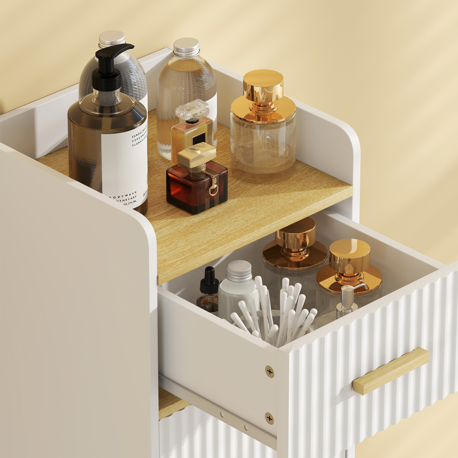 Dulapul de baie economisitor de spatiu [BRAND NAME], cu o latime de 32,5 cm, optimizeaza spatiile inguste datorita sertarului, raftului deschis si dulapului reglabil. O solutie practica pentru organizarea si transformarea dezordinii din baie intr-un mediu ordonat si linistit.